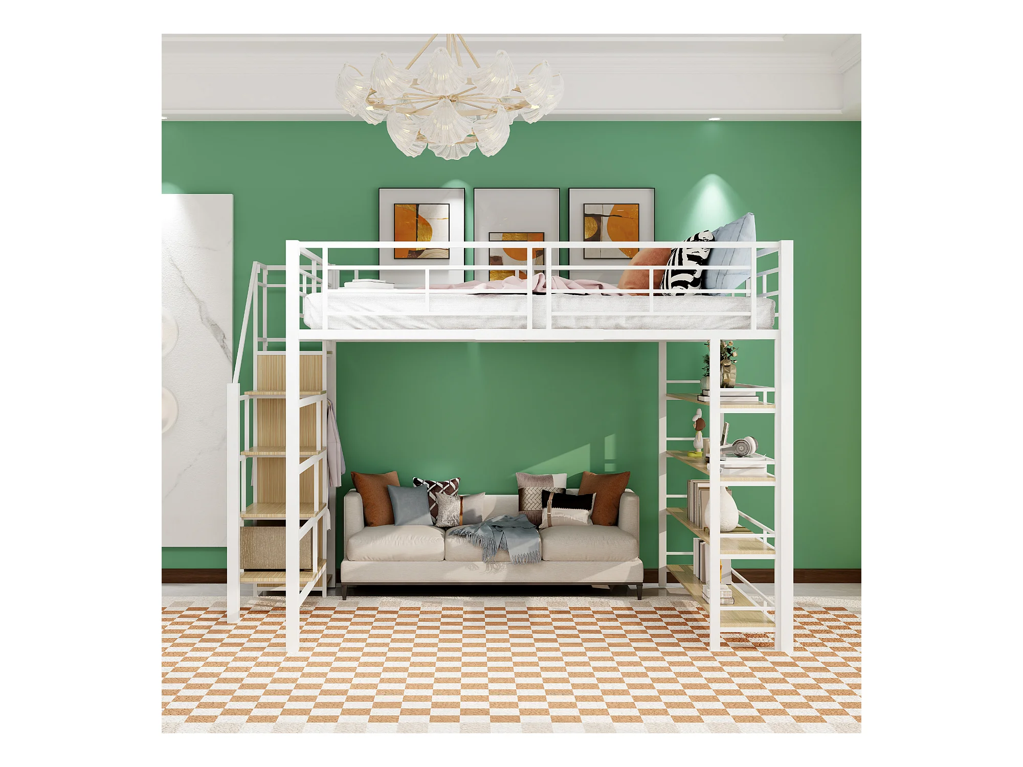 Hochbett 140x200 cm mit Sicherheitstreppe, Stauraum, kleiner Schrank, integrierte Regale, hohe Barriere-Ausführung, Juniorbett, weiß