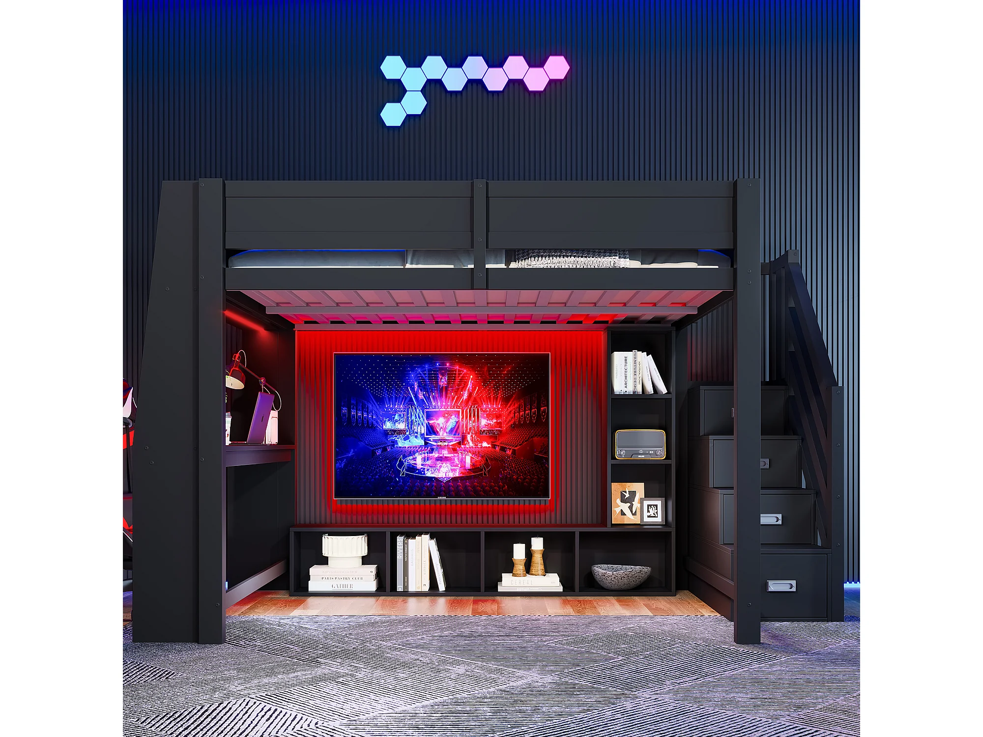 Hochbett 140x200cm - mit LED-Beleuchtung - mit Schreibtisch - Leiter mit Stauraum - MDF - Schwarz (Matratze nicht inbegriffen)