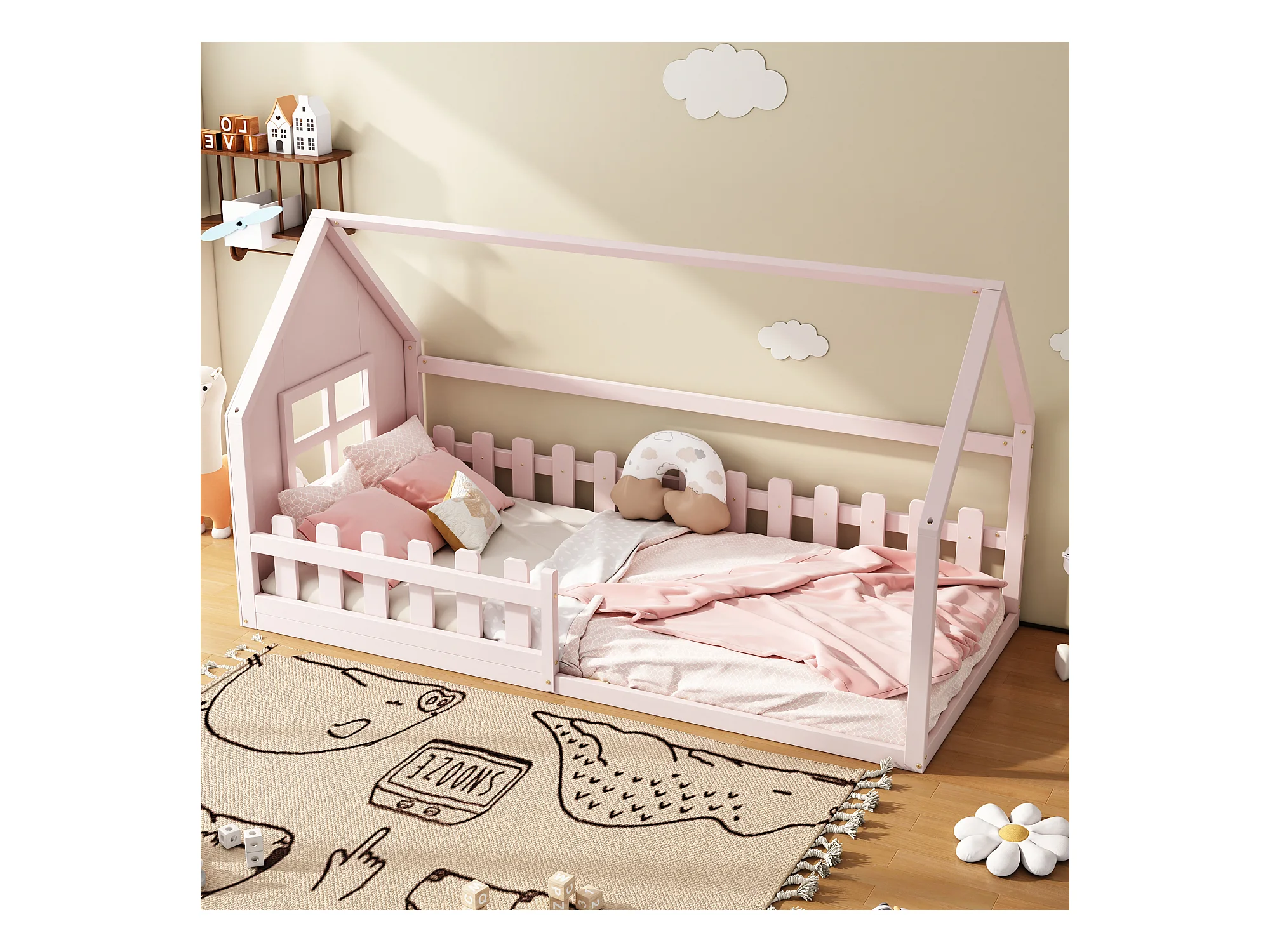Hochbett 90 x 200 cm, Kinderbett mit Fenster, Kiefernholz, Lattenrost, Rosa