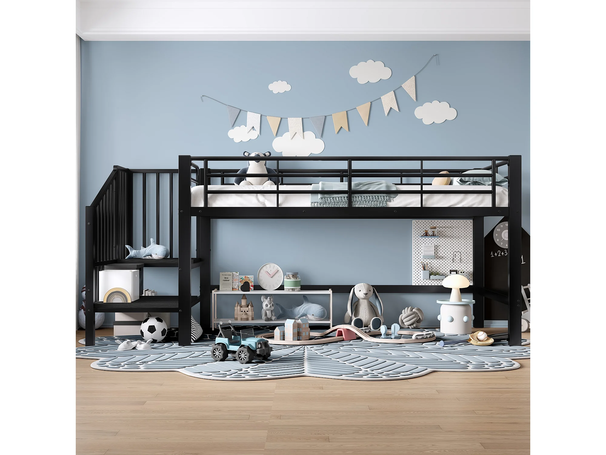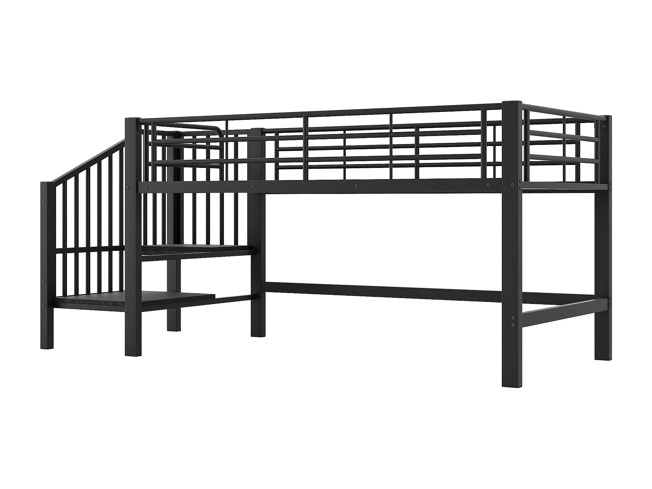 Hochbett 90 x 200 cm, Kinderbett mit Treppe und Schutzgitter, Lattenrost aus Metall – schwarz (ohne Matratze)