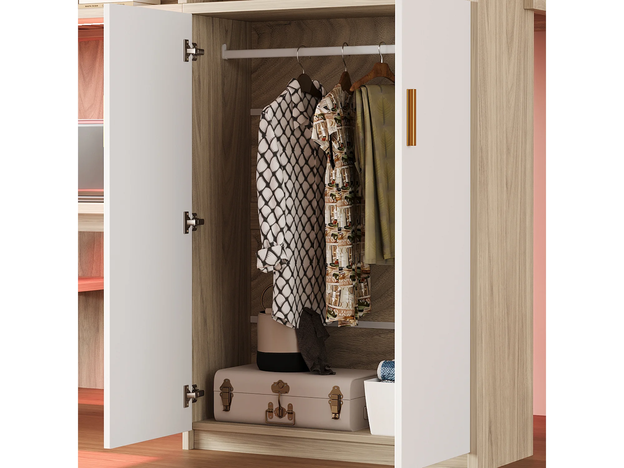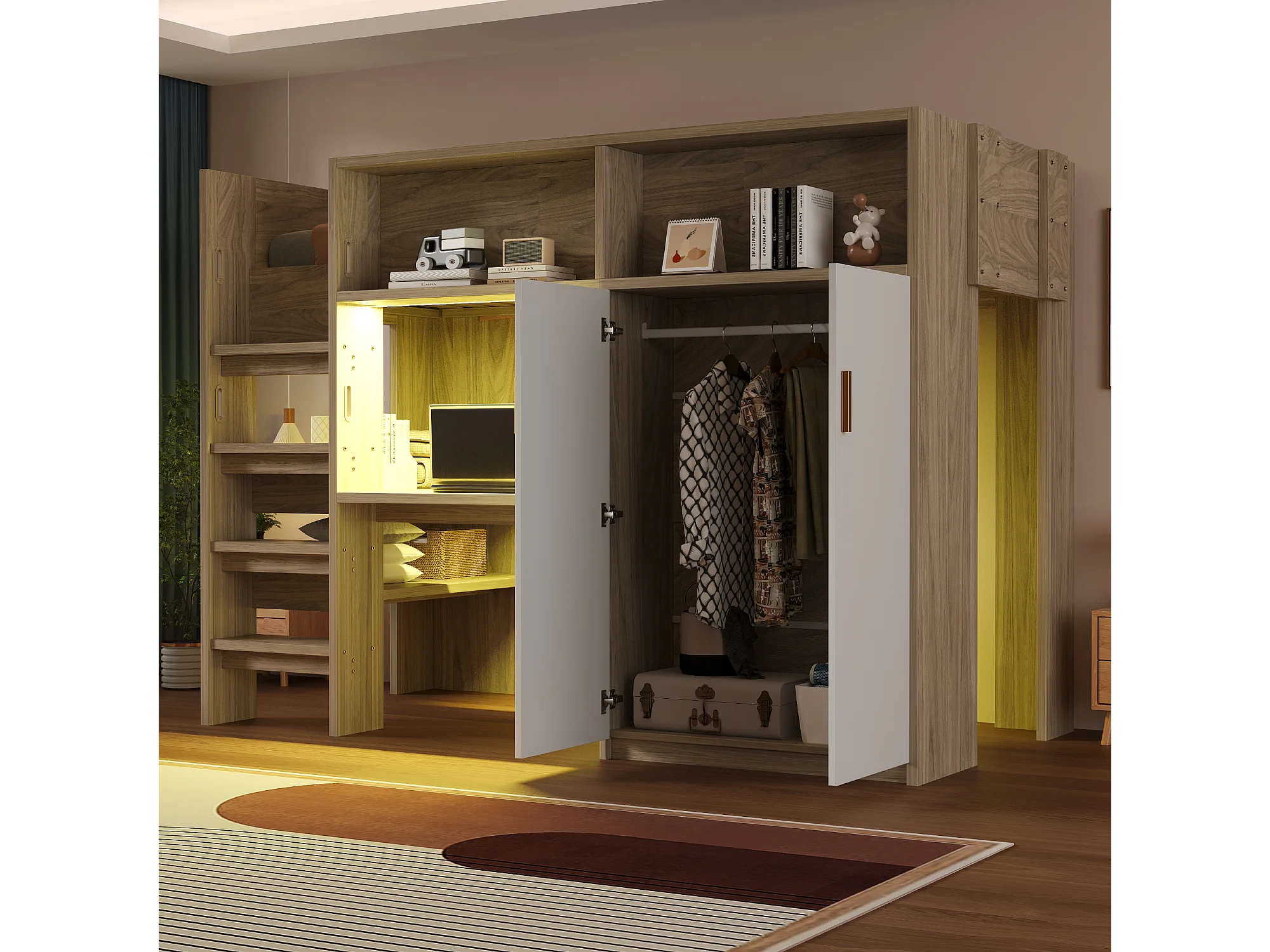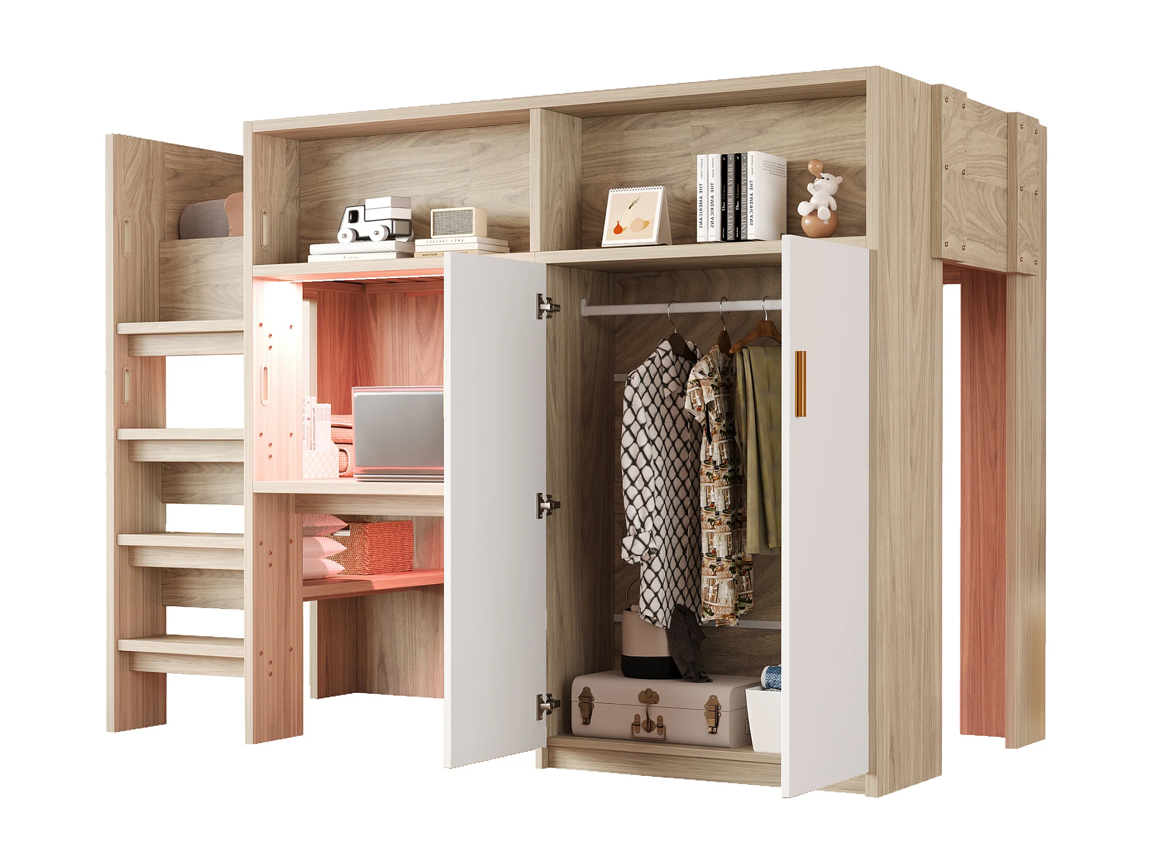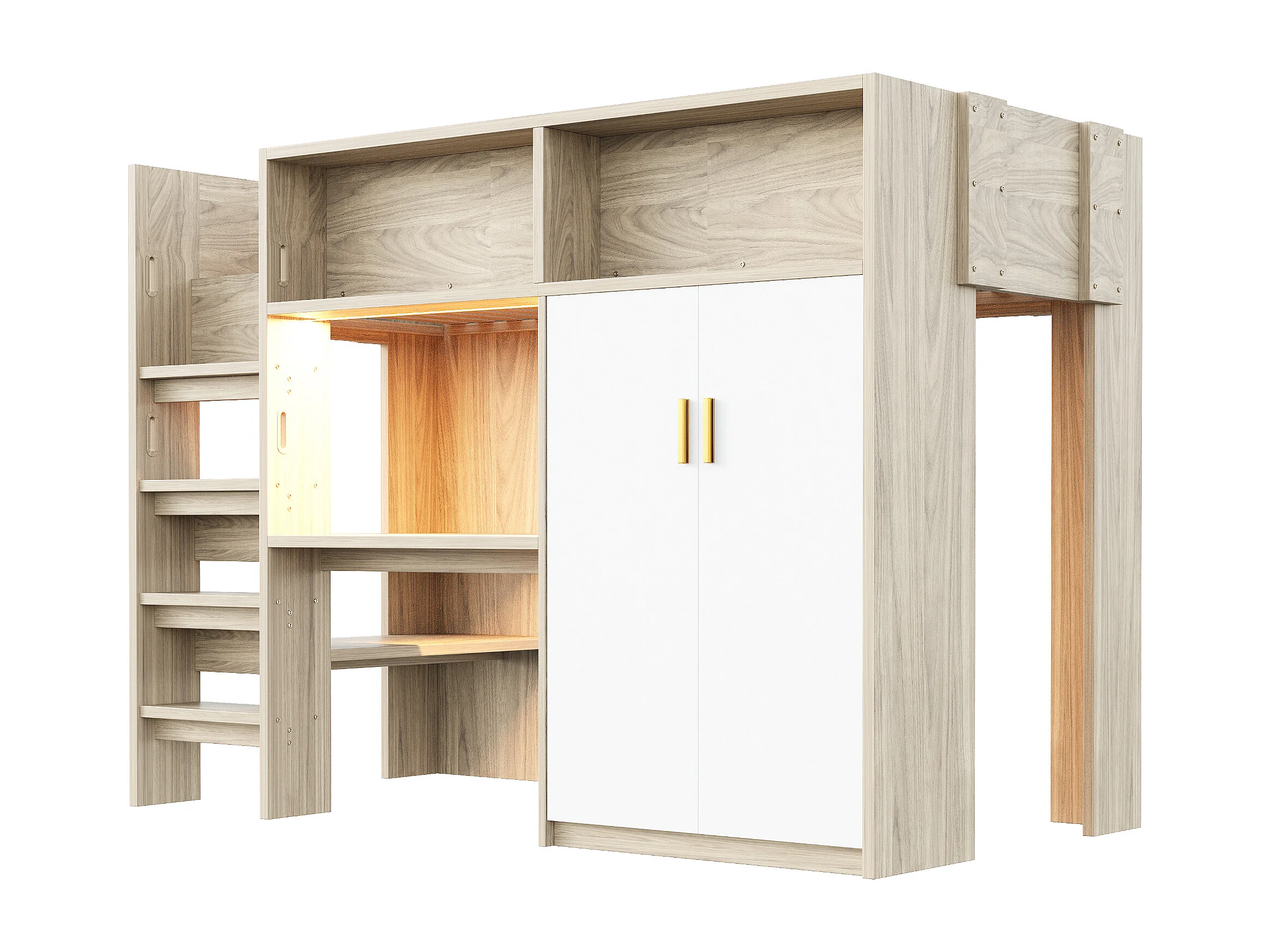 Hochbett 90 x 200 cm - mit einem Schreibtisch und einem Schrank - mit Regalen - mit LED-Beleuchtung - natur​ (Matratze nicht inbegriffen)