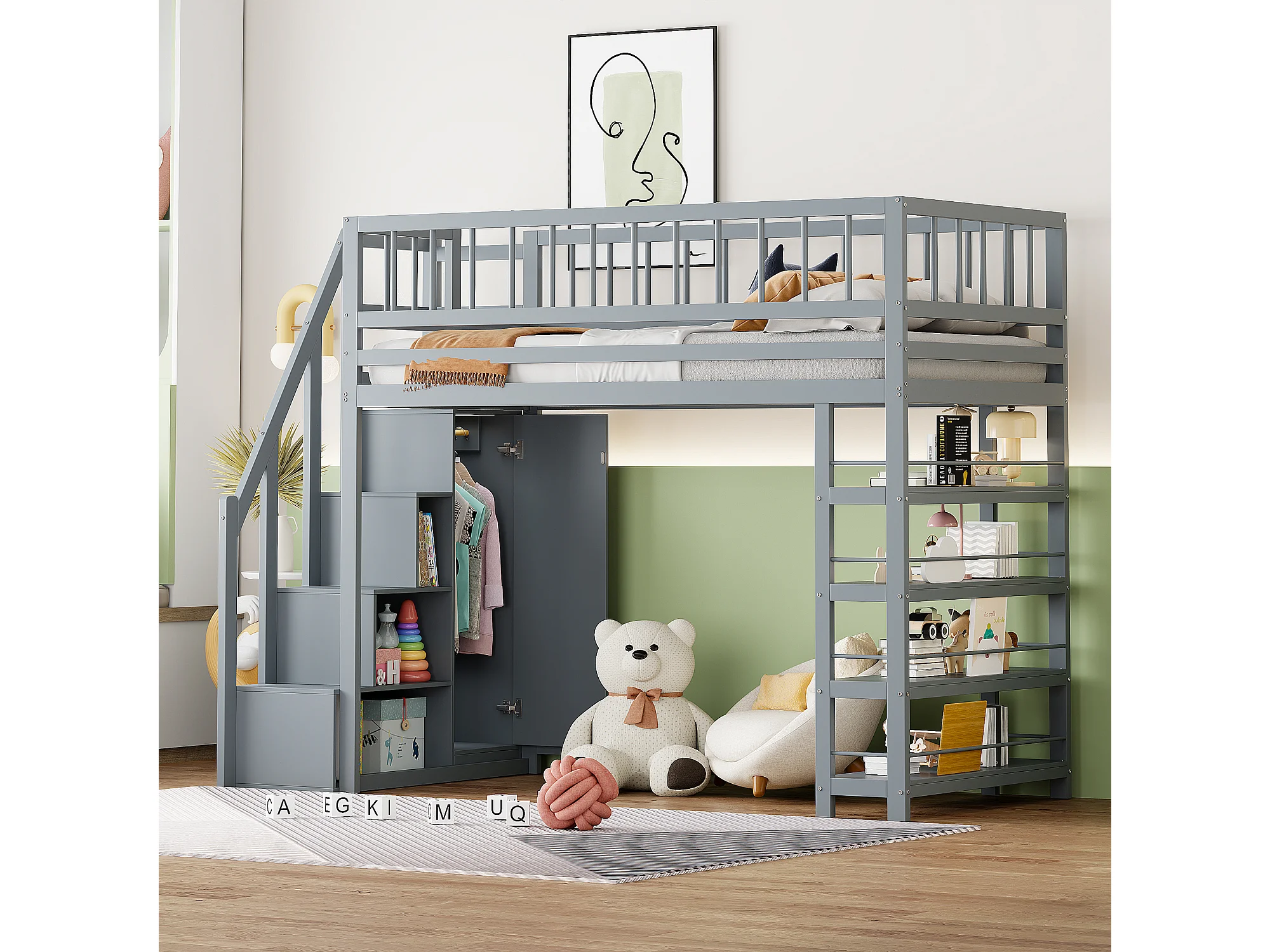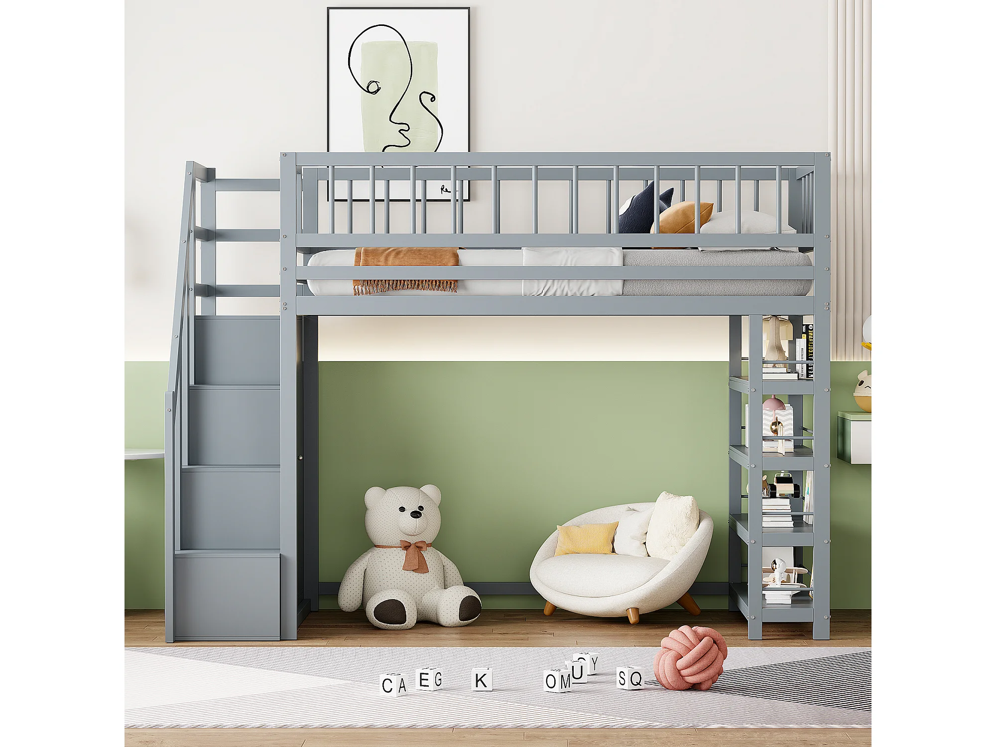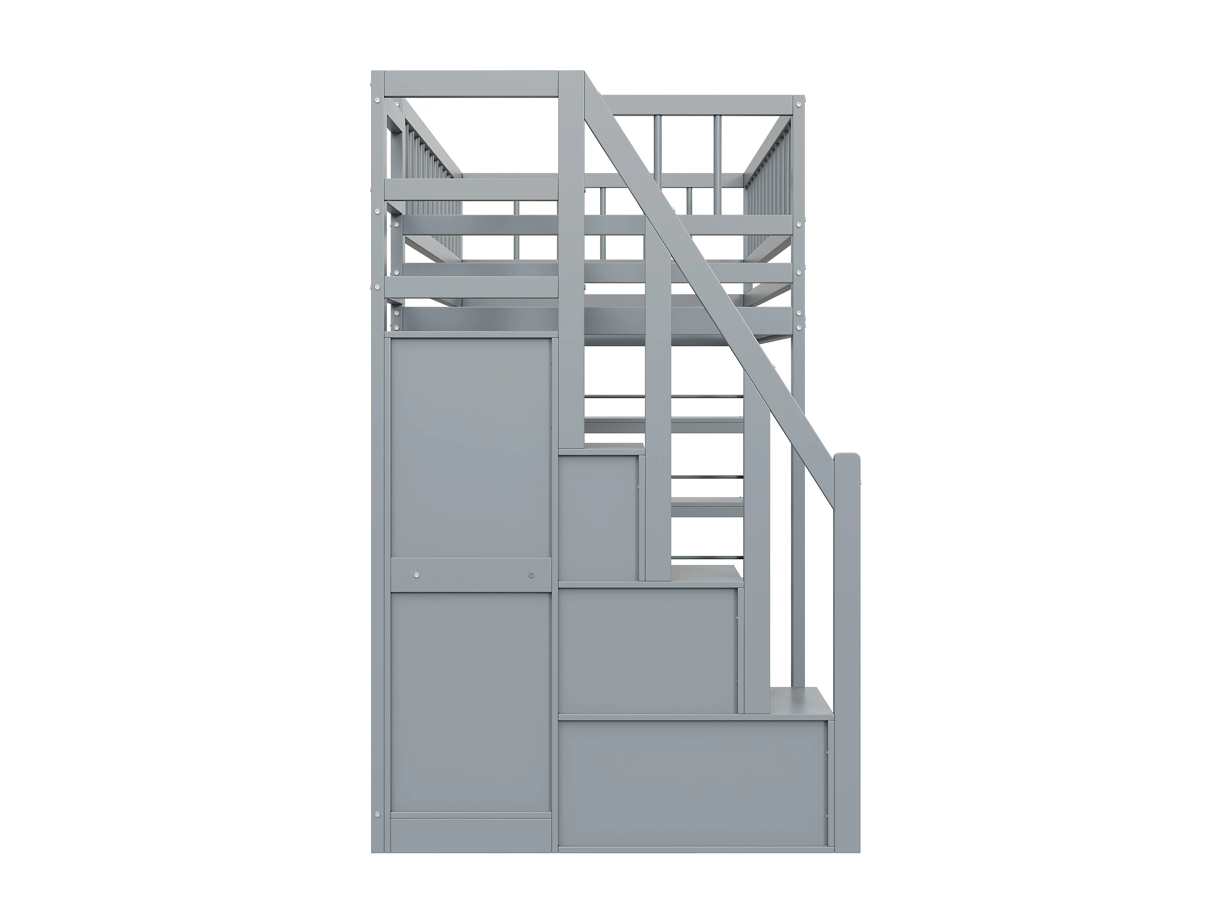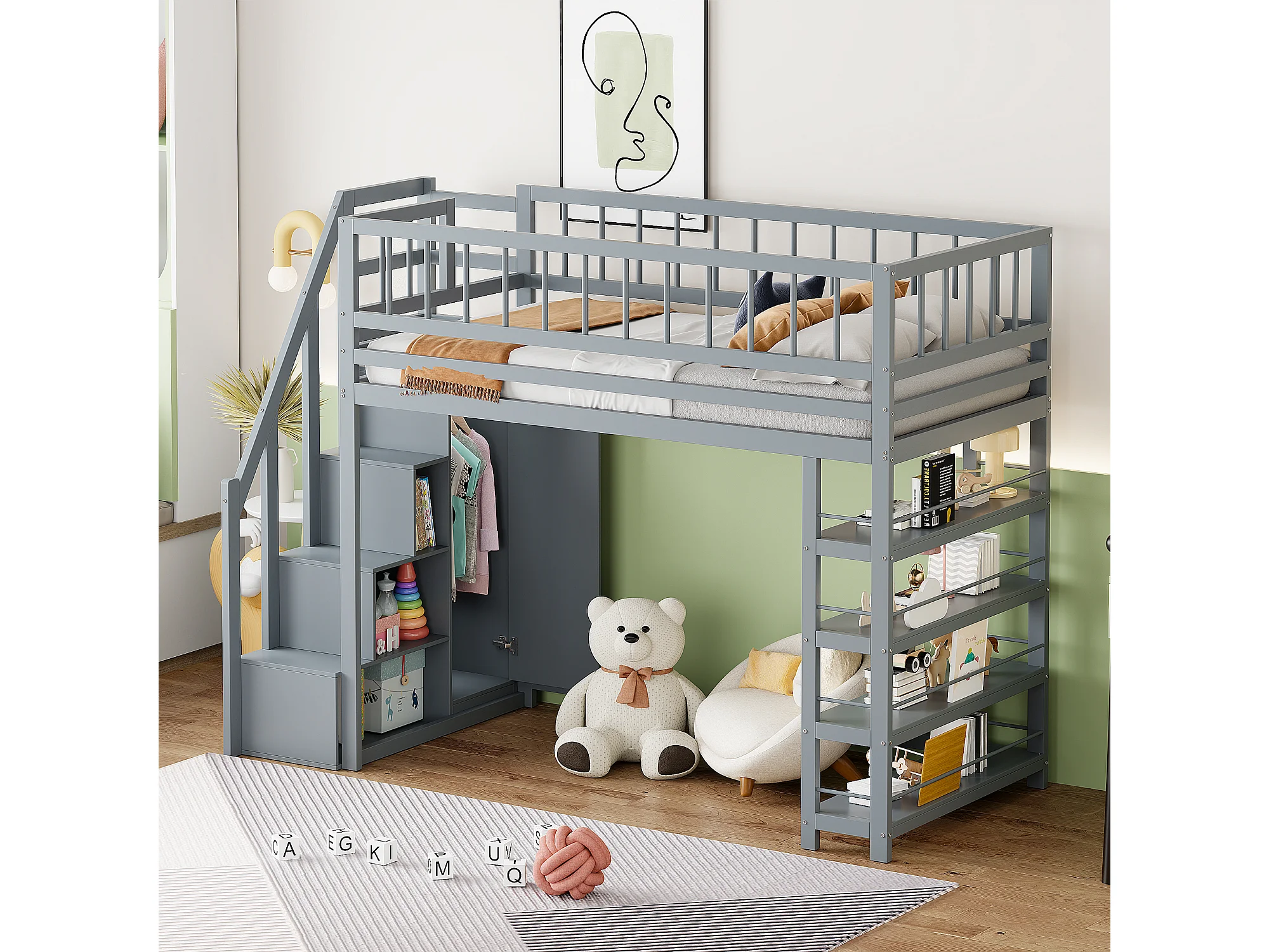 Hochbett, 90 x 200 cm – mit Regalen, Lattenrost – Massivholz – grau – Matratze nicht enthalten