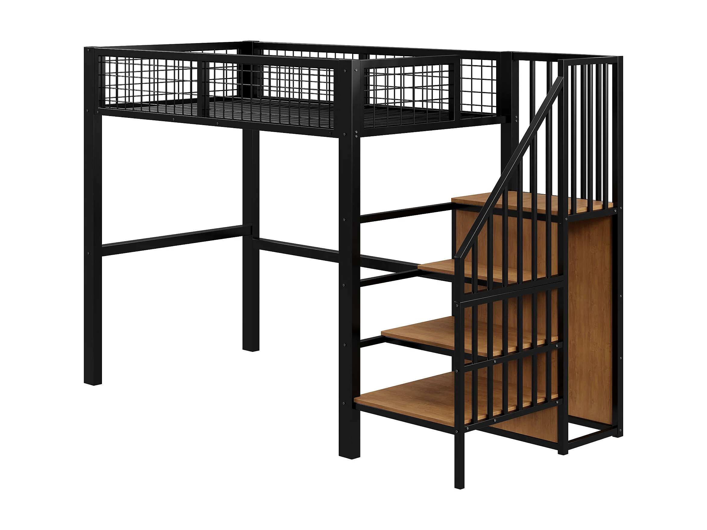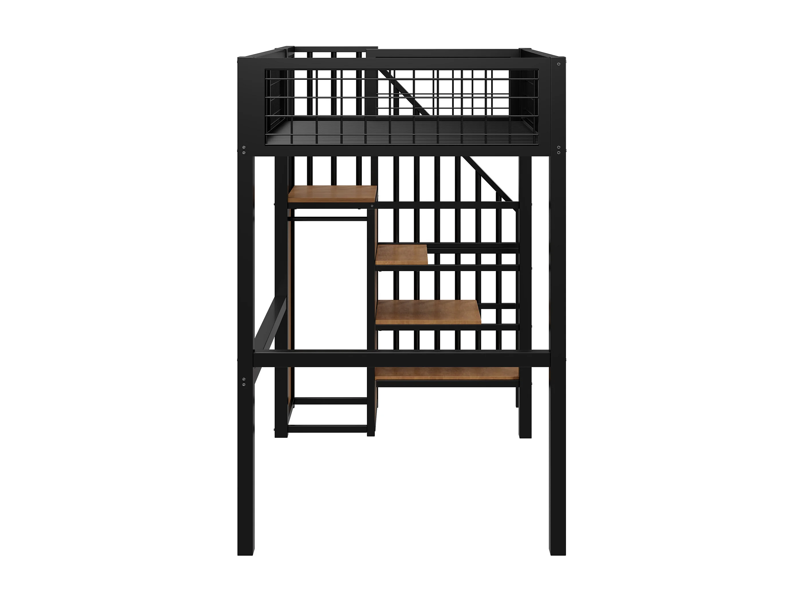 Hochbett 90 x 200 cm – mit Regalen und Lattenrost – schwarzes Metall – Matratze nicht enthalten
