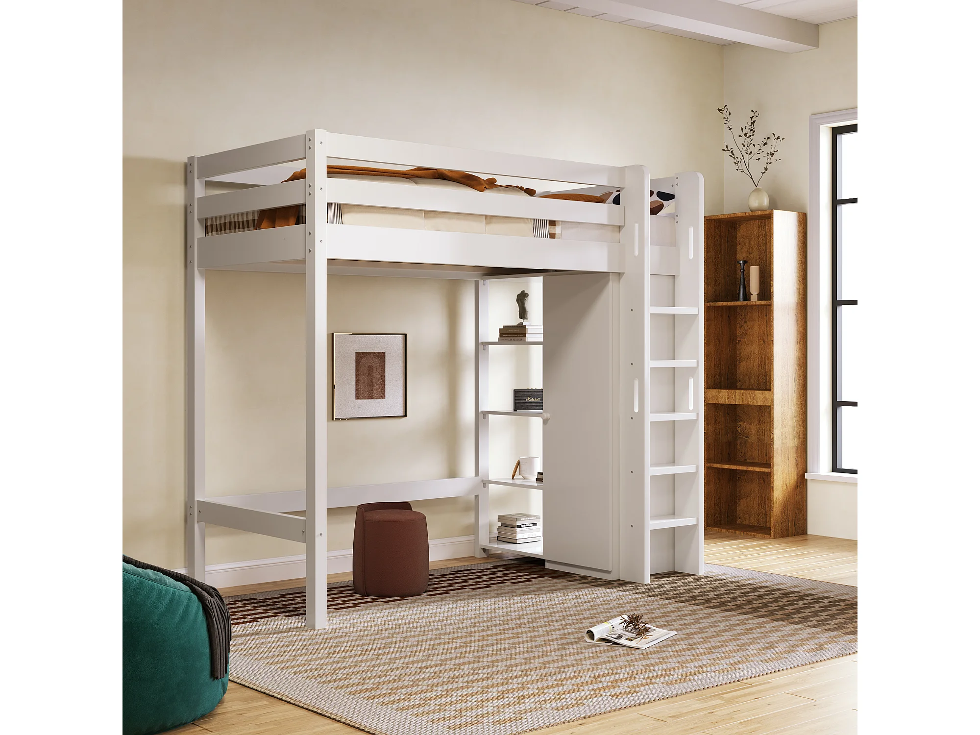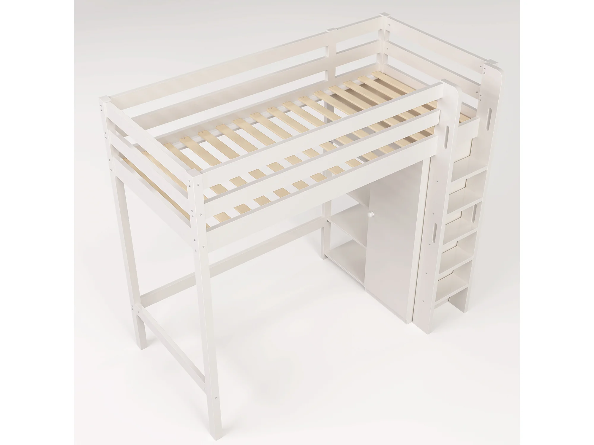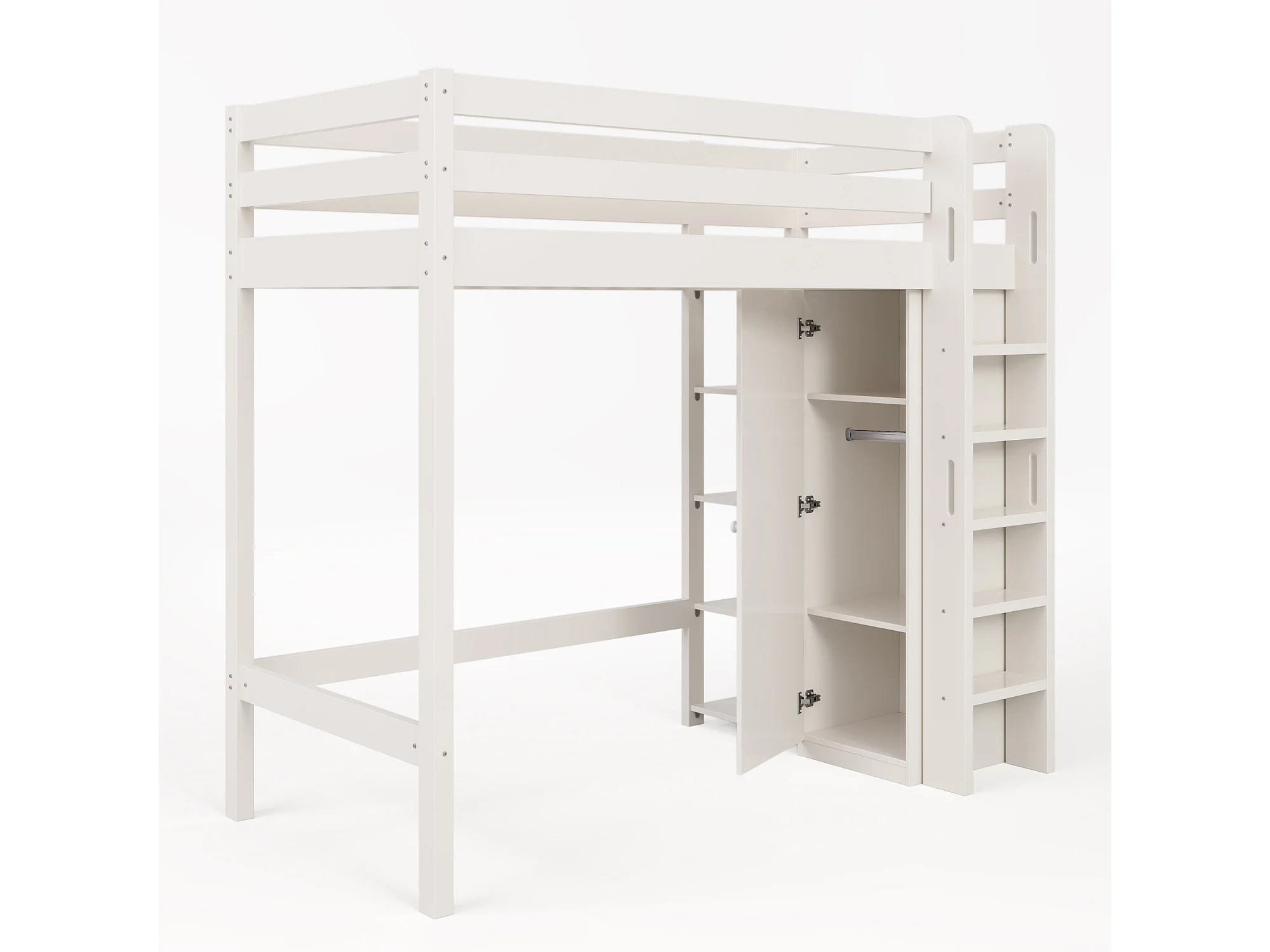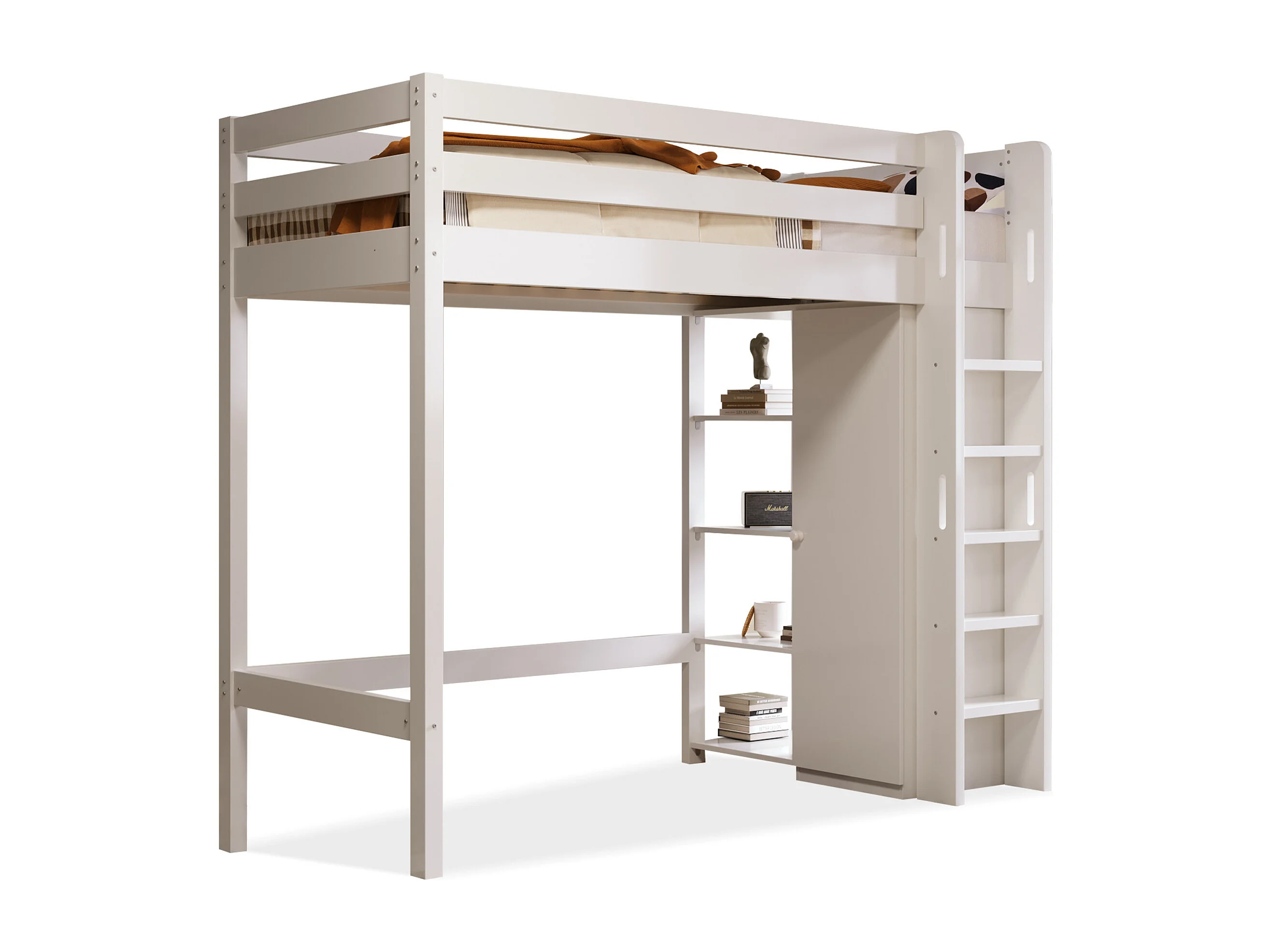 Hochbett 90 x 200 cm – mit Regalen und Lattenrost – weiß – Matratze nicht enthalten