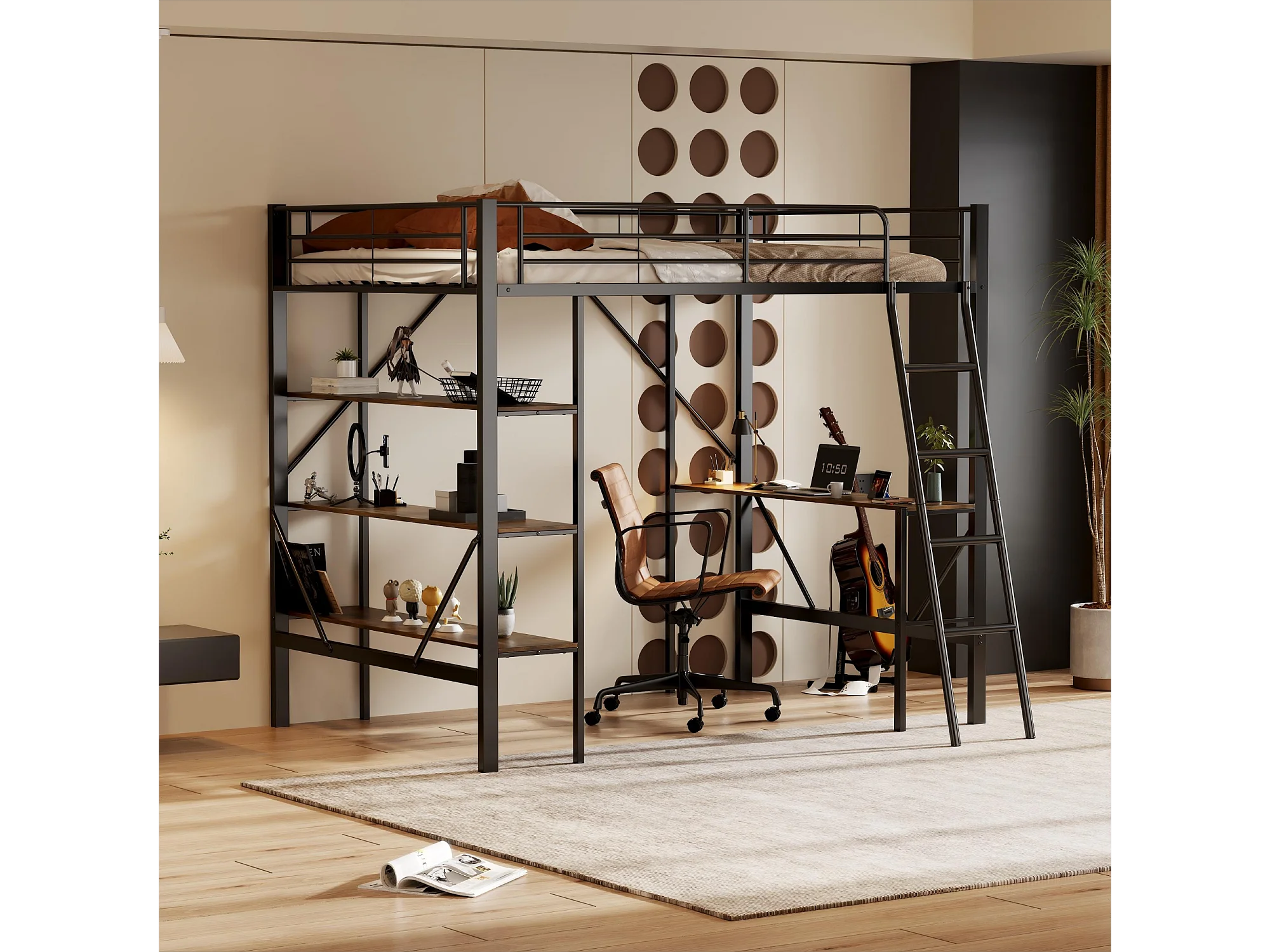 Hochbett 90 x 200 cm mit Schreibtisch und 3 Ablagefächern, schwarz – ohne Matratze