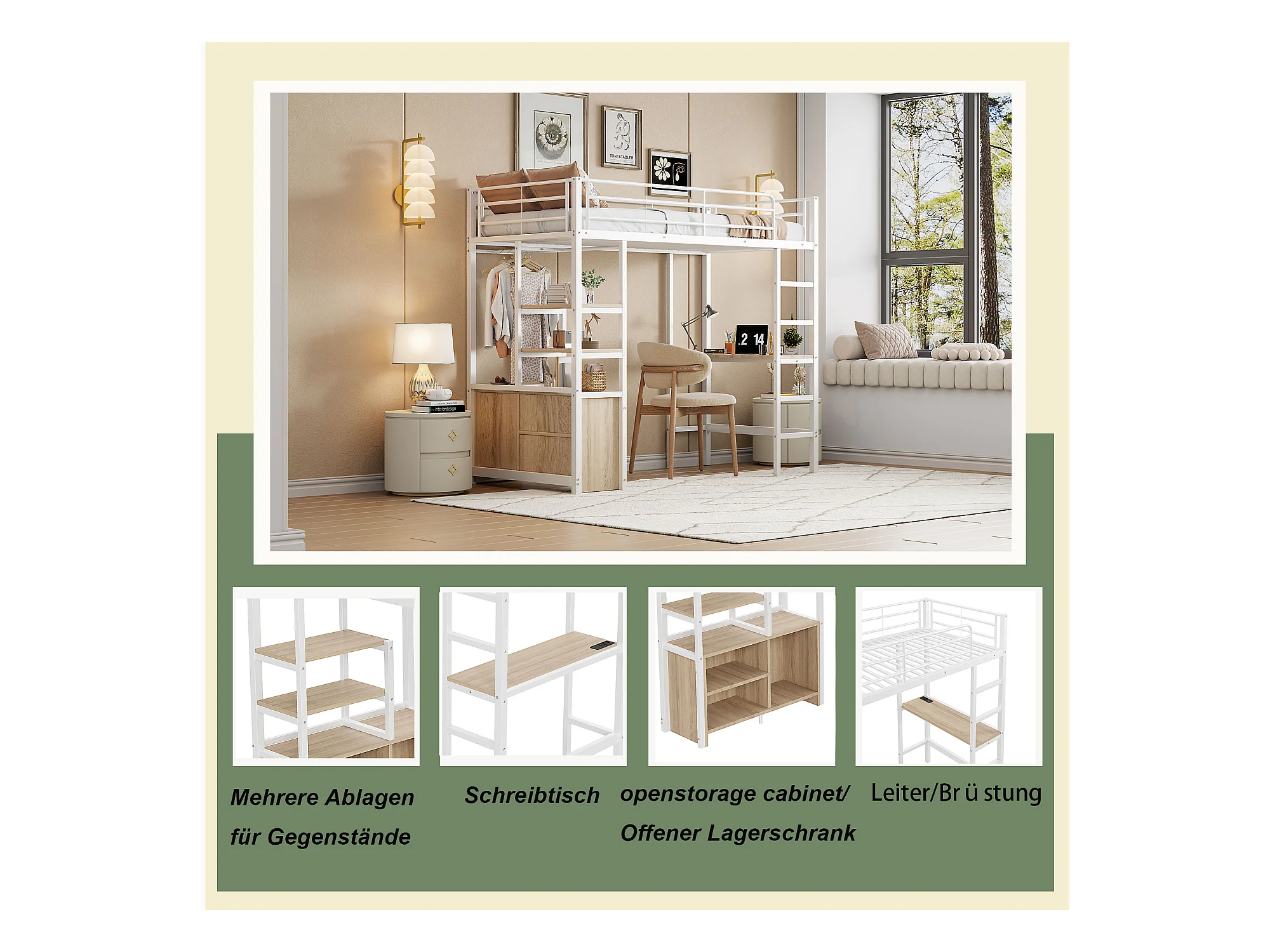 Hochbett 90 x 200 cm mit Schreibtisch, USB-Anschlüssen, offenem Stauraum – Metall + MDF – Weiß (ohne Matratze)