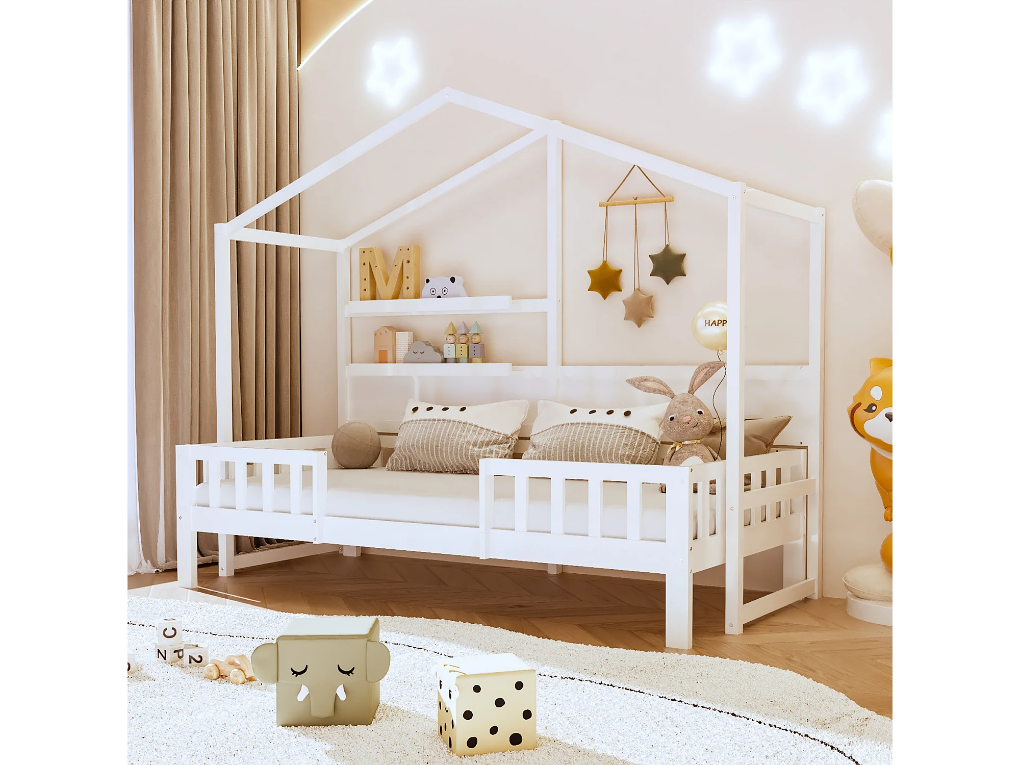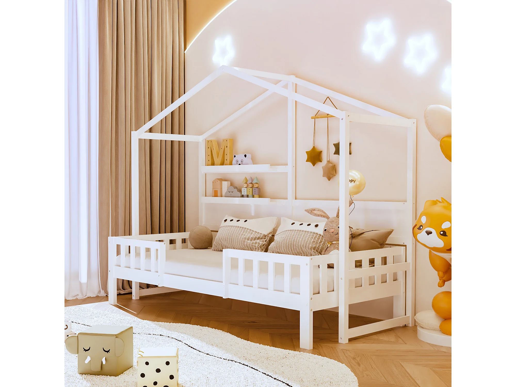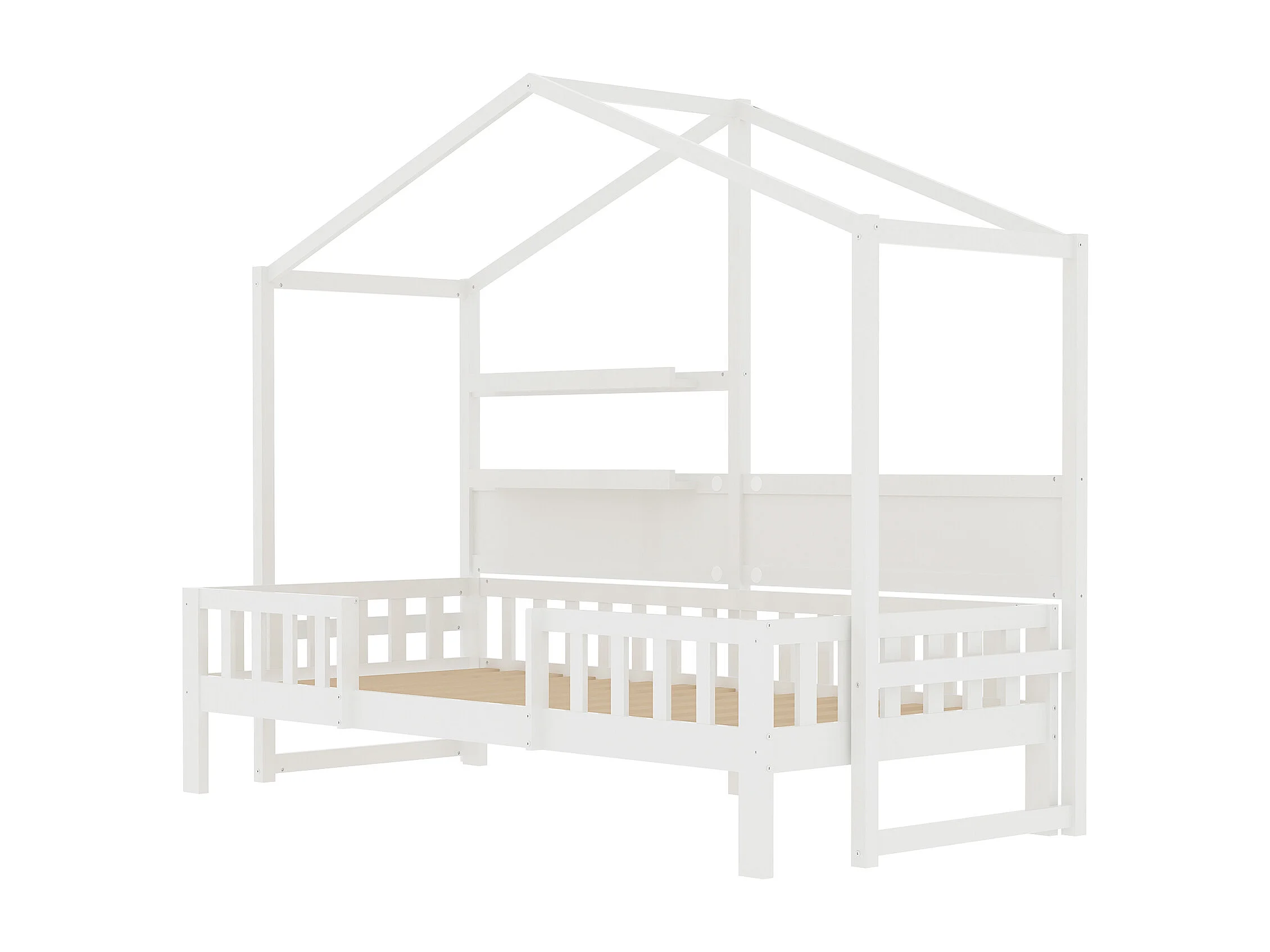 Hochbett 90 x 200 cm – Schlafsofa – Massivholz – Dach und Regale – Weiß