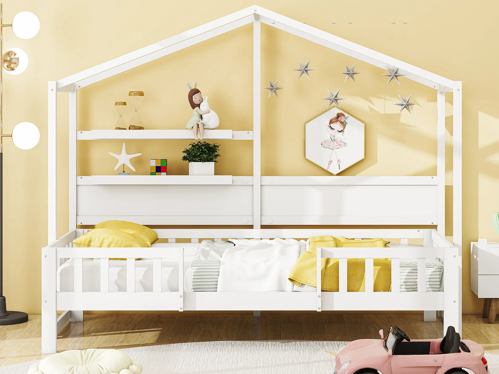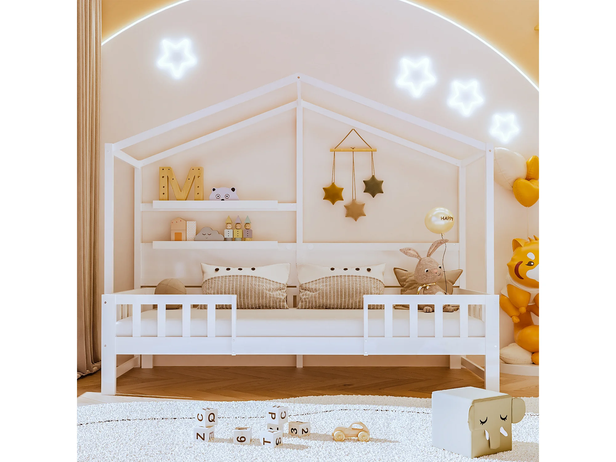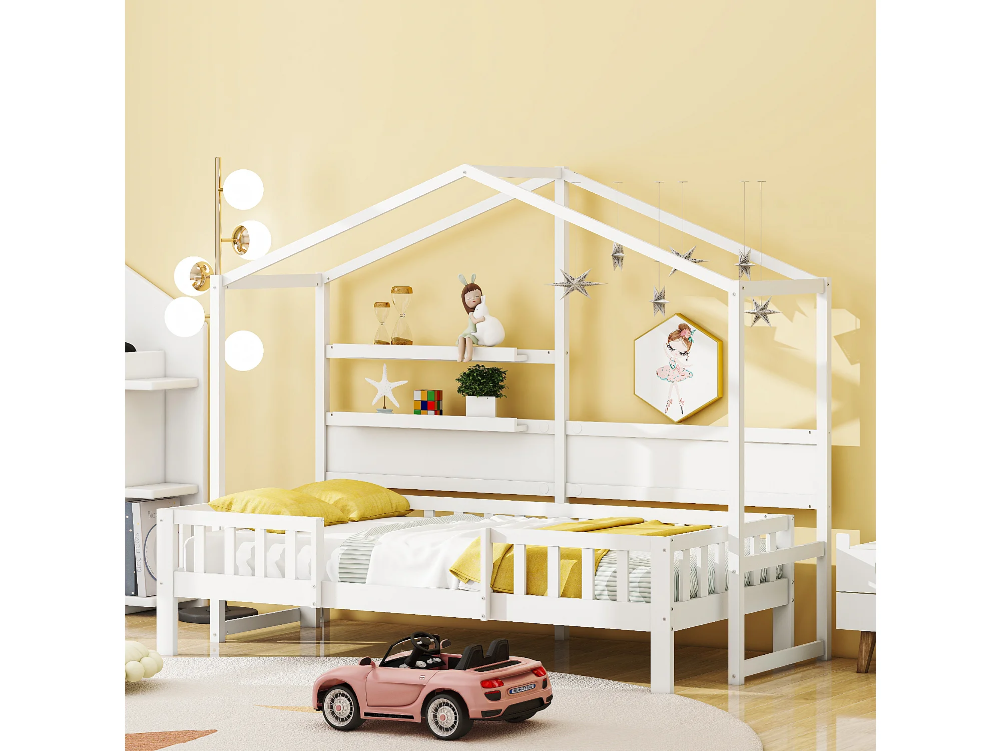 Hochbett 90 x 200 cm – Schlafsofa – Massivholz – Dach und Regale – Weiß