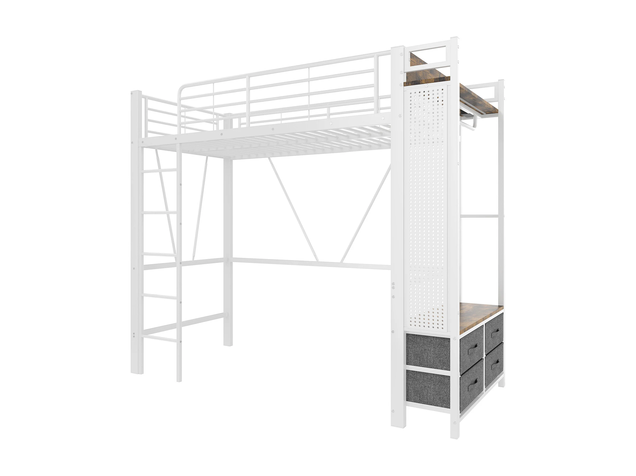 Hochbett 90x200 cm, Kinderbett mit 4 Schubladen, Kleiderstange, USB-Anschluss – Metall weiß (ohne Matratze)