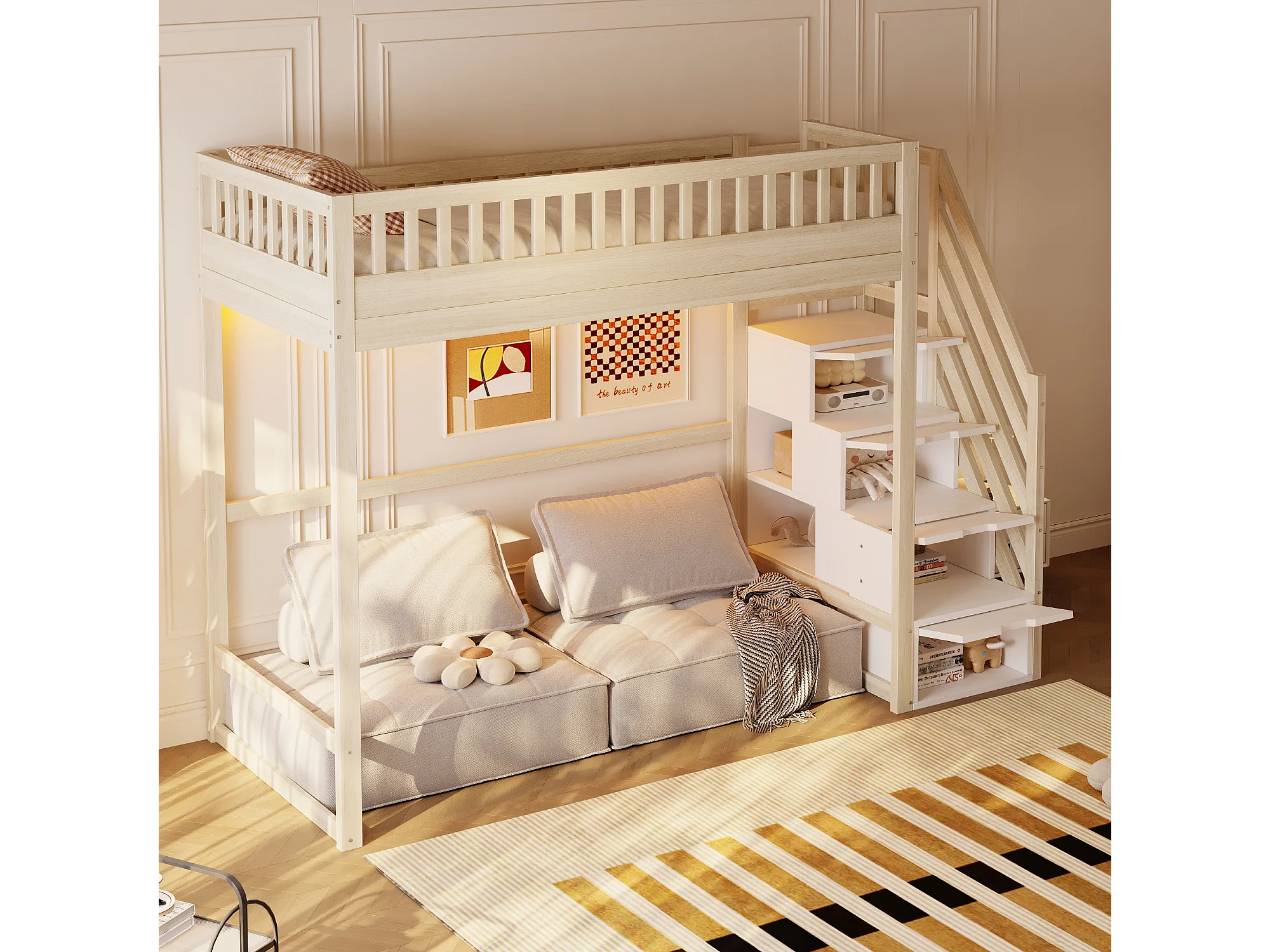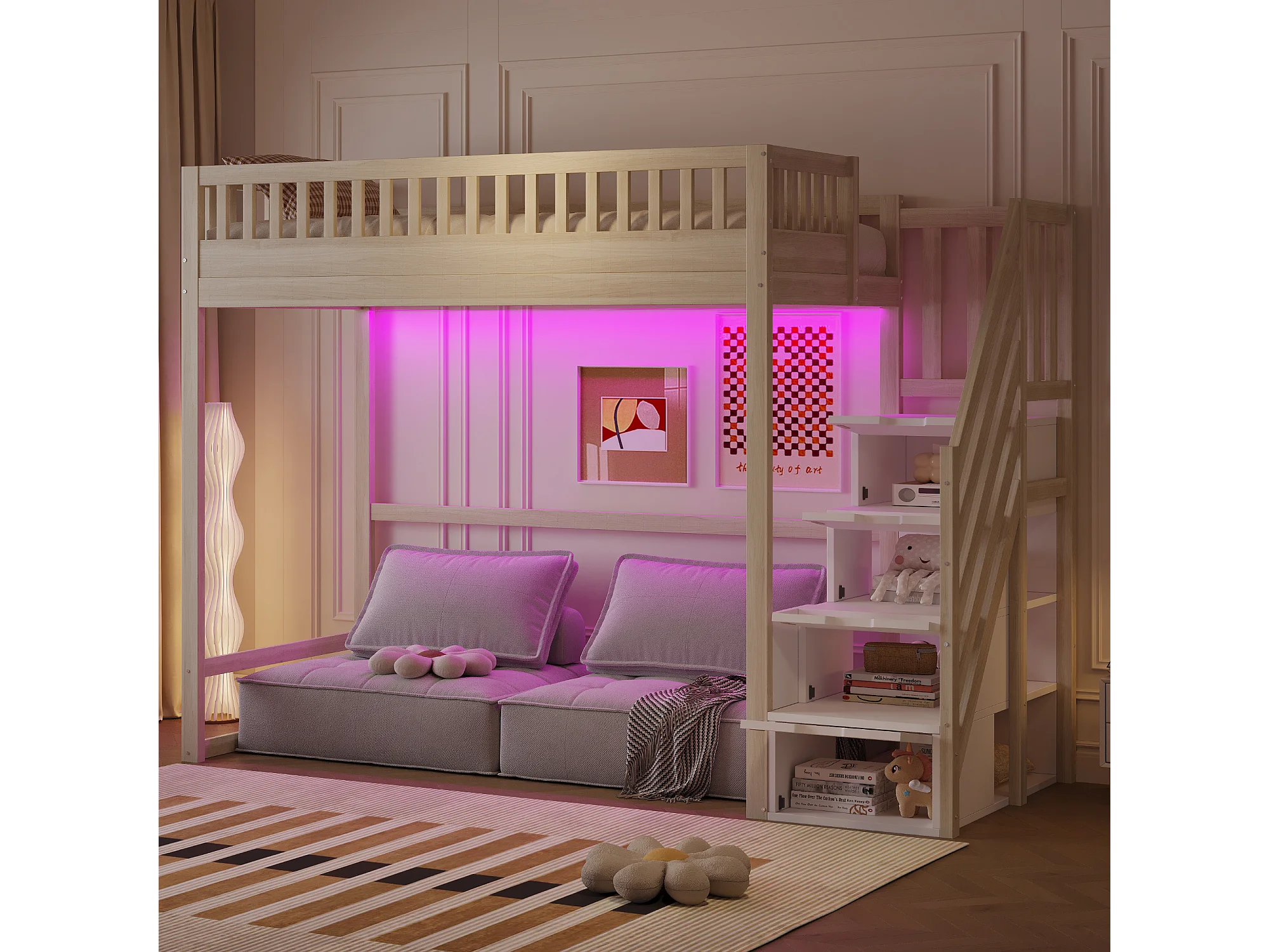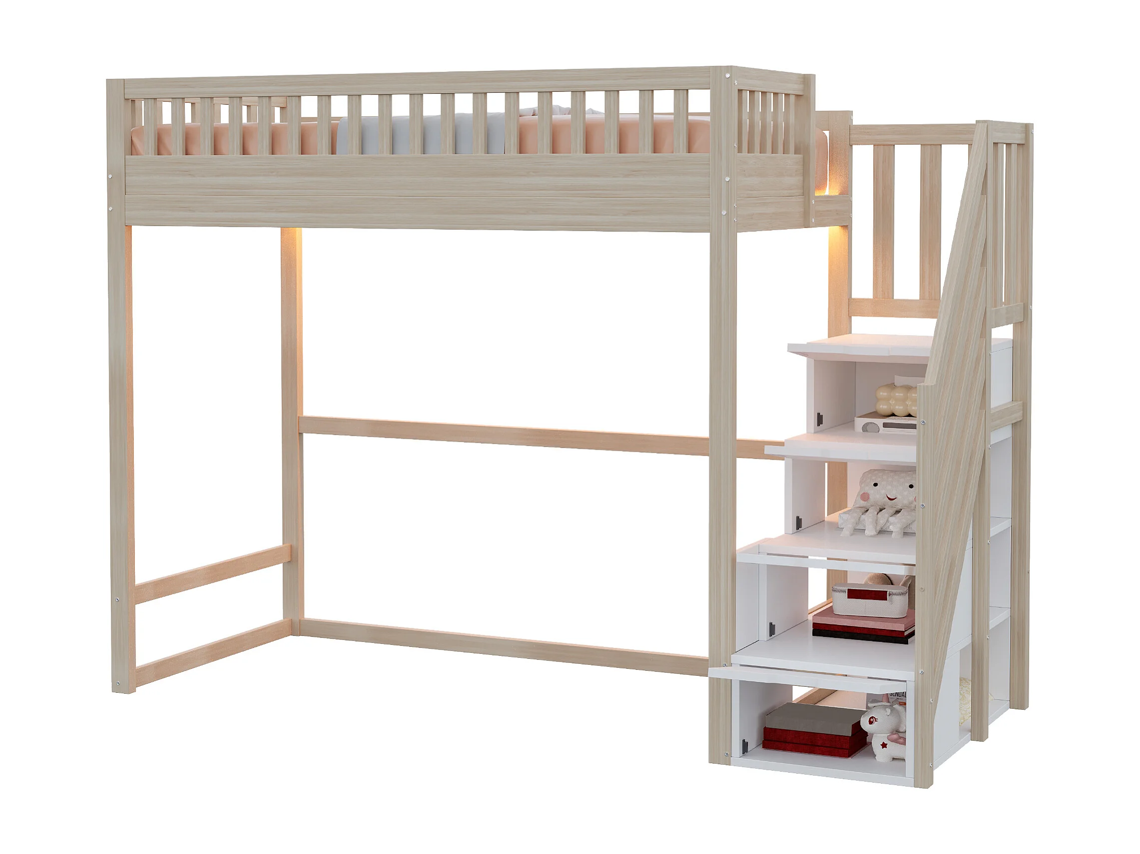 Hochbett 90x200 cm - mit Sicherheitsleiter - mit Sicherheitsgittern - mit LED-Beleuchtung - natur​ (Matratze nicht inbegriffen)