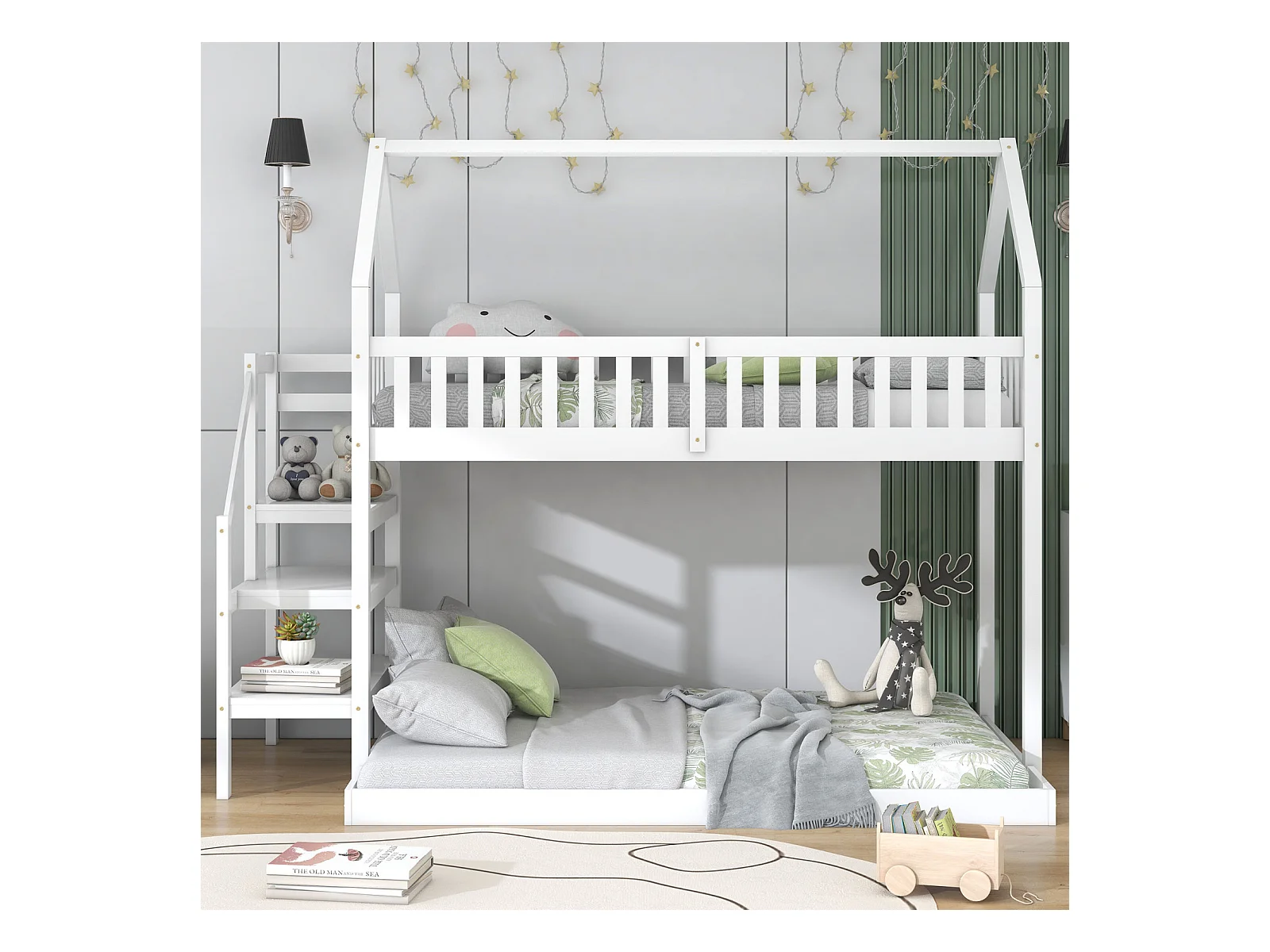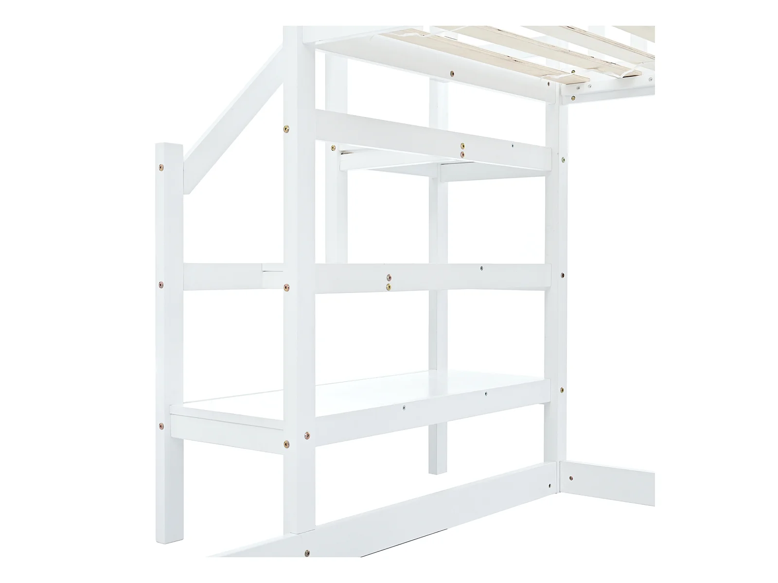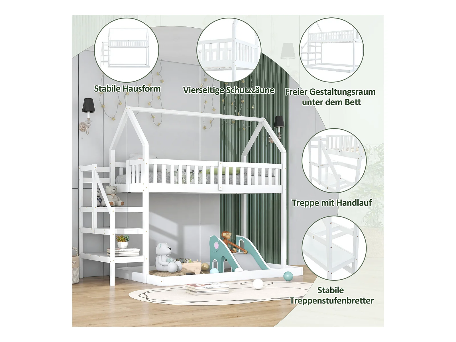 Hochbett 90x200cm - Etagenbett Hausbett mit Treppe mit Rausfallschutz und Barriere Kiefernrahmen - Weiß