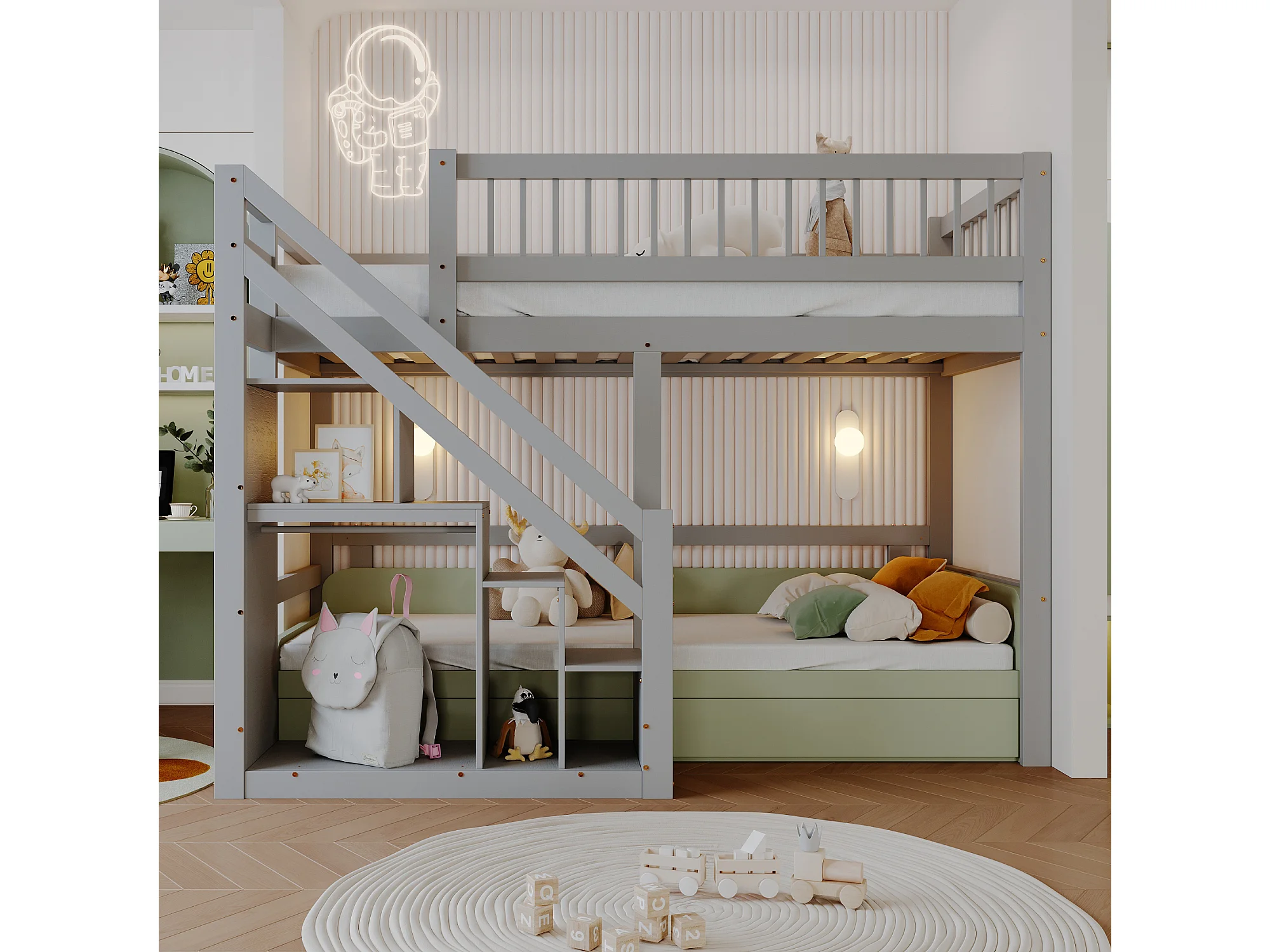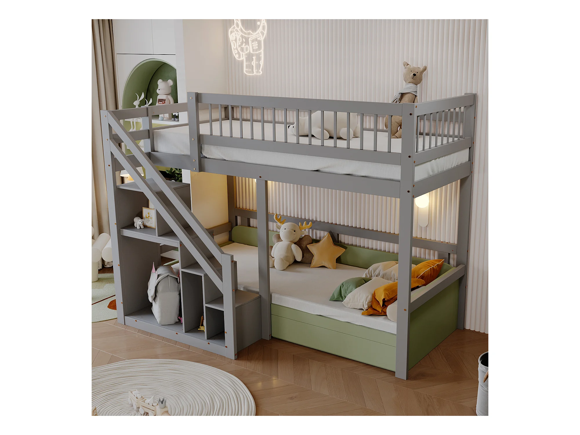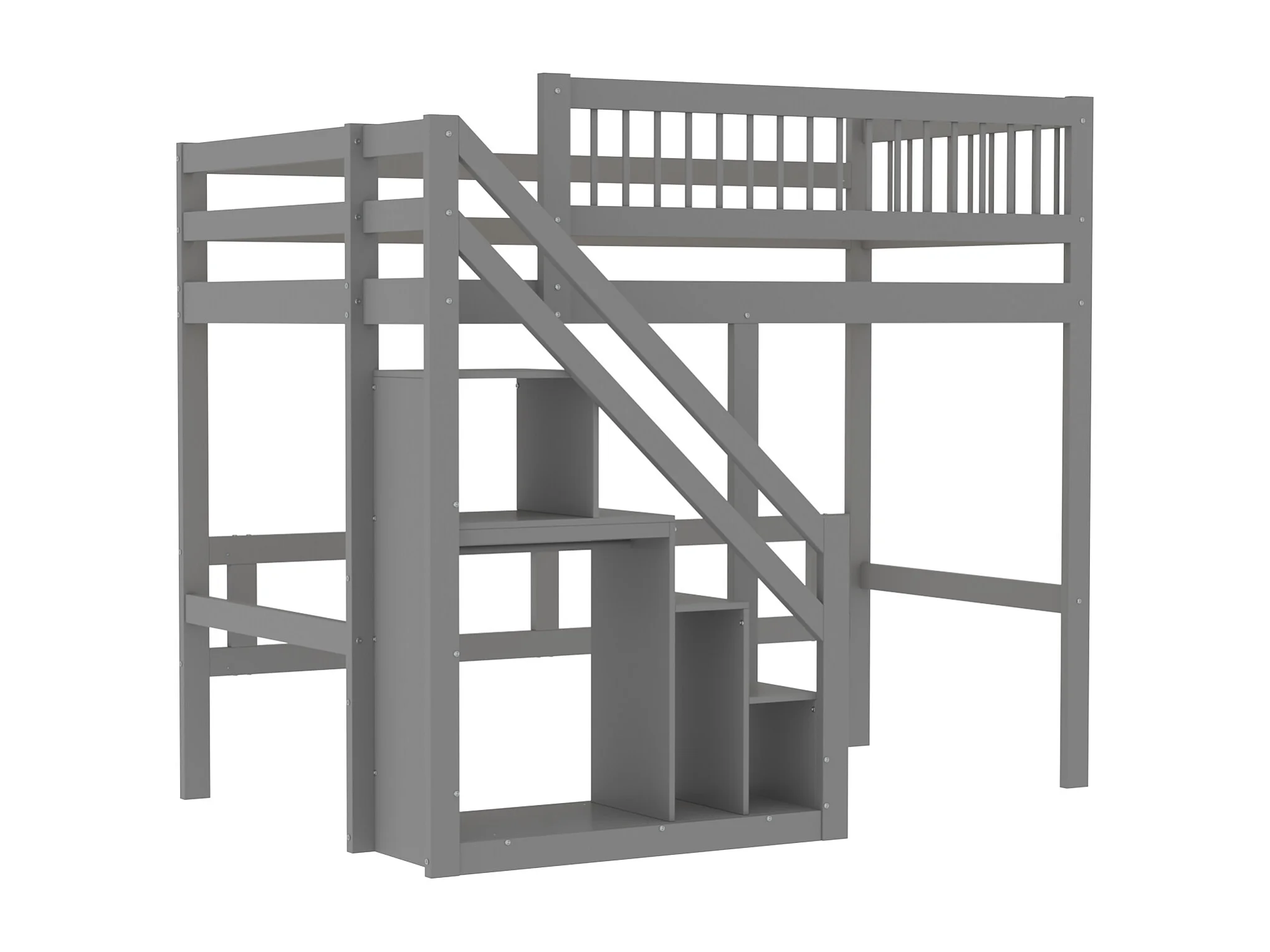 Hochbett aus Massivholz 90 x 200 cm mit Stauraum – Sicherheitstreppe – Grau
