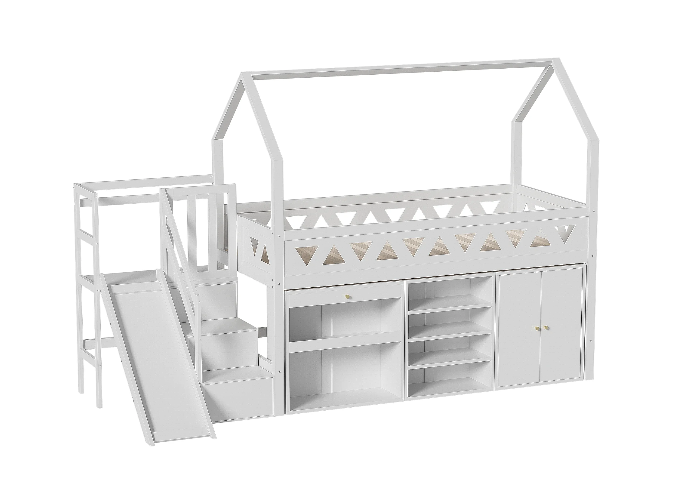 Kinderhochbett 90 x 200 cm - Massivholz - Rutsche, Schubladen und Schrank - weiß