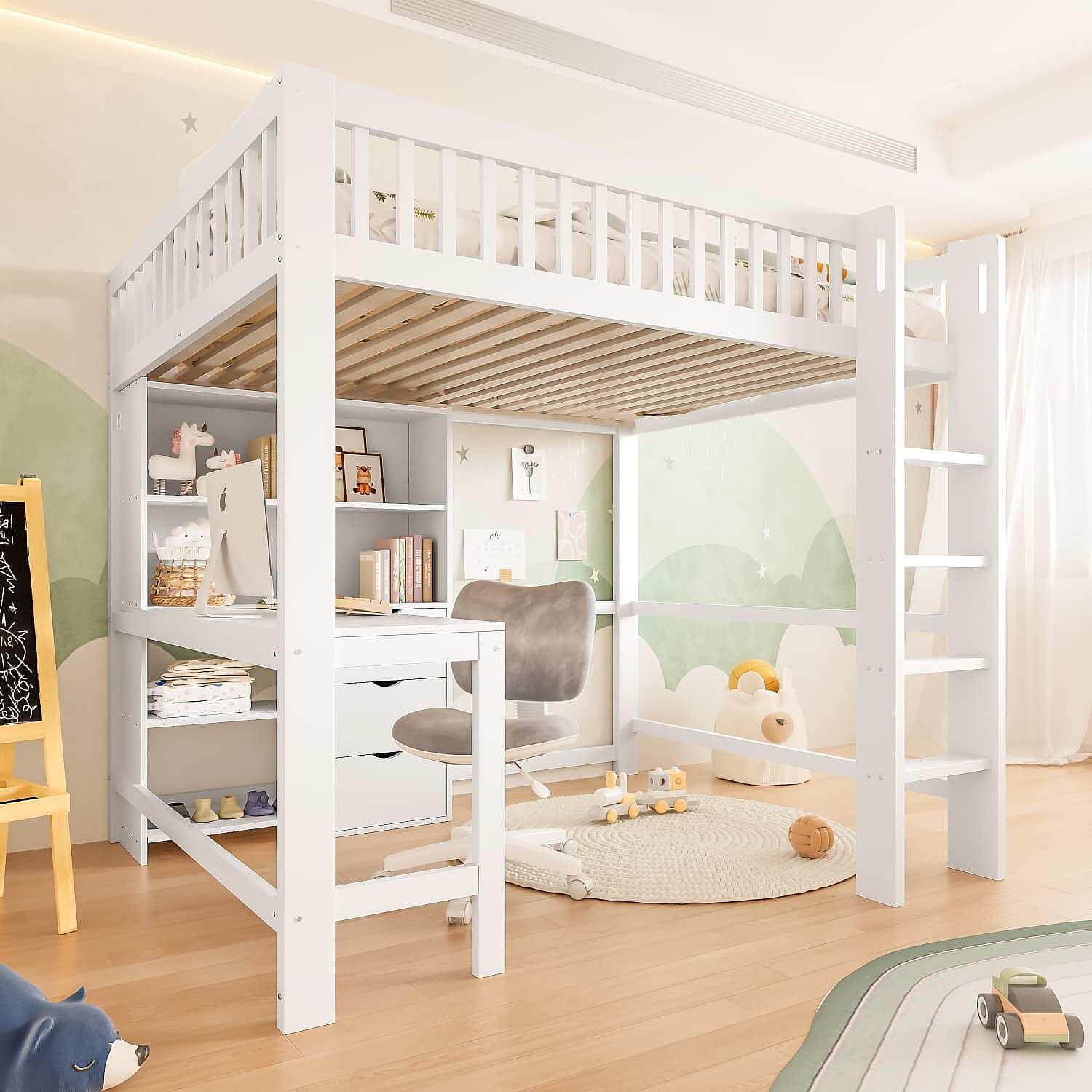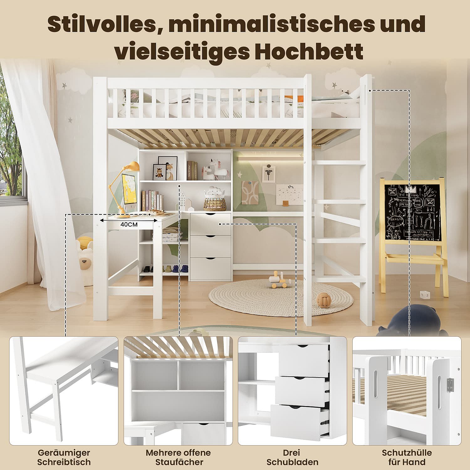 Hochbett, kinderbett 140x200 cm, mehrere Ablagefächer, Leiter, Schreibtisch, 3 Schubladen, ohne Matratze, Weiß