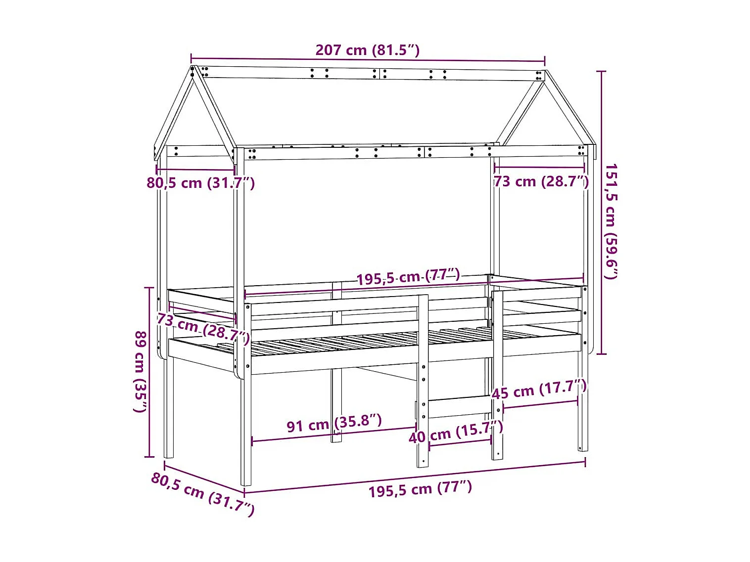 Hochbett mit Dach Wachsbraun 75x190 cm Massivholz Kiefer