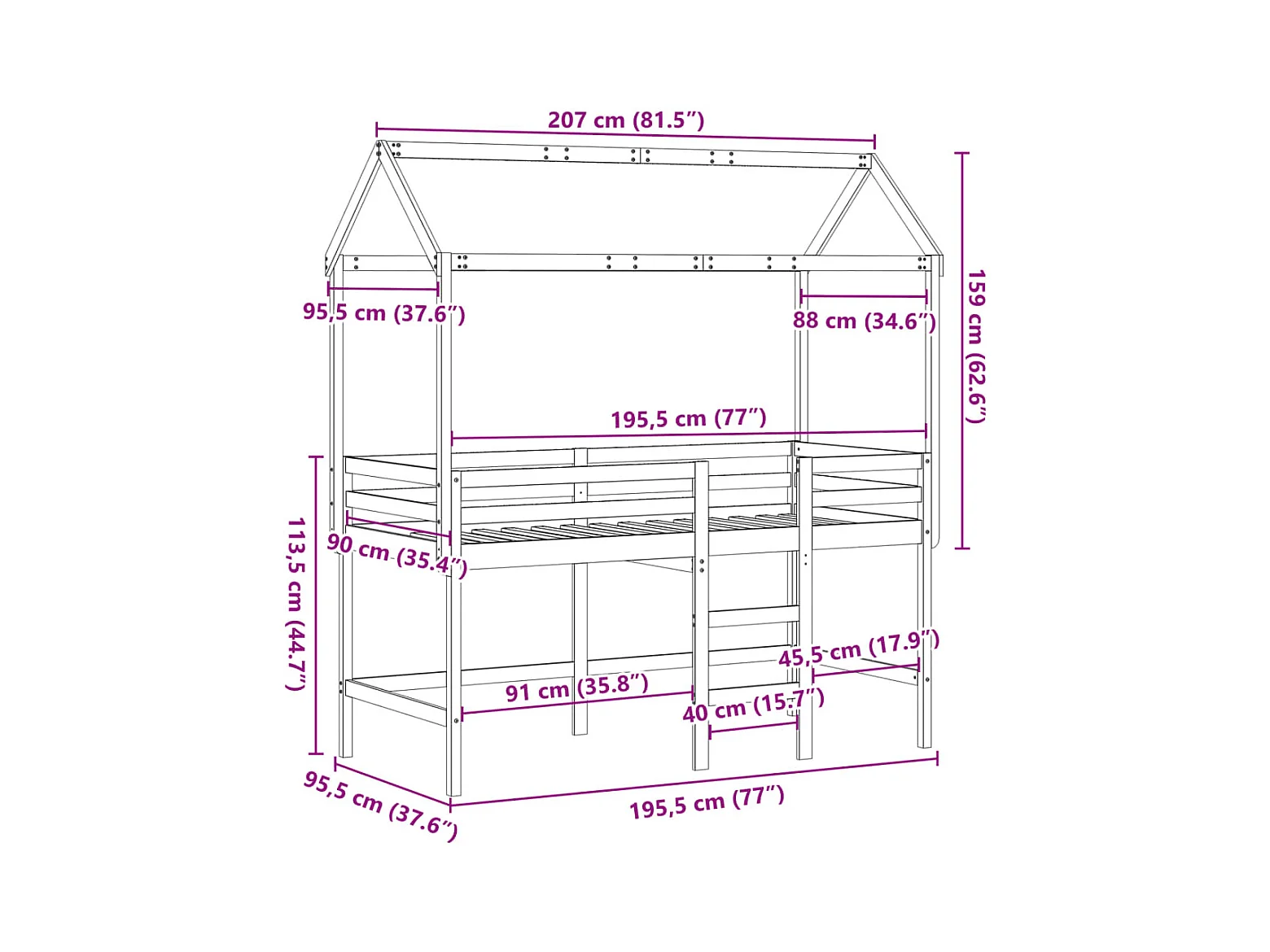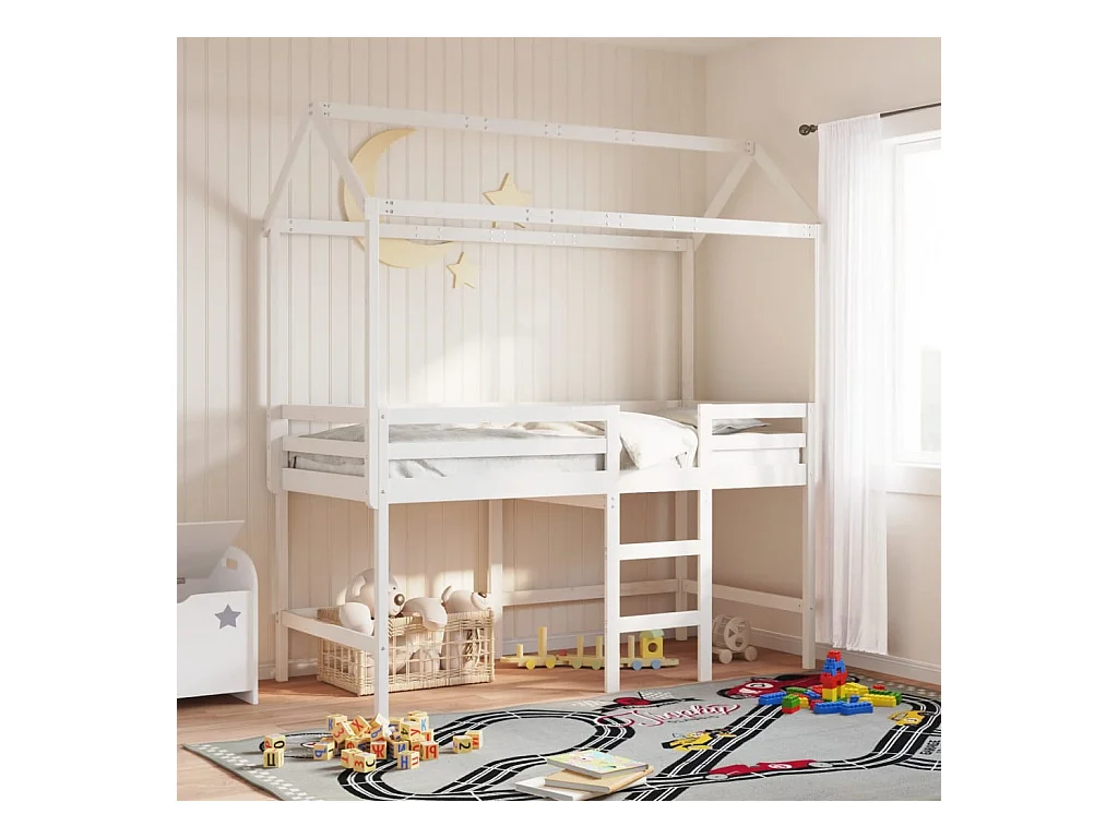 Hochbett mit Leiter und Dach Weiß 90x190 cm Massivholz Kiefer
