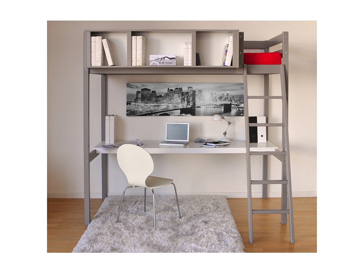 Hochbett mit Schreibtisch & Stauraum GIACOMO - 90 x 190 cm - Fichte grau + Matratze