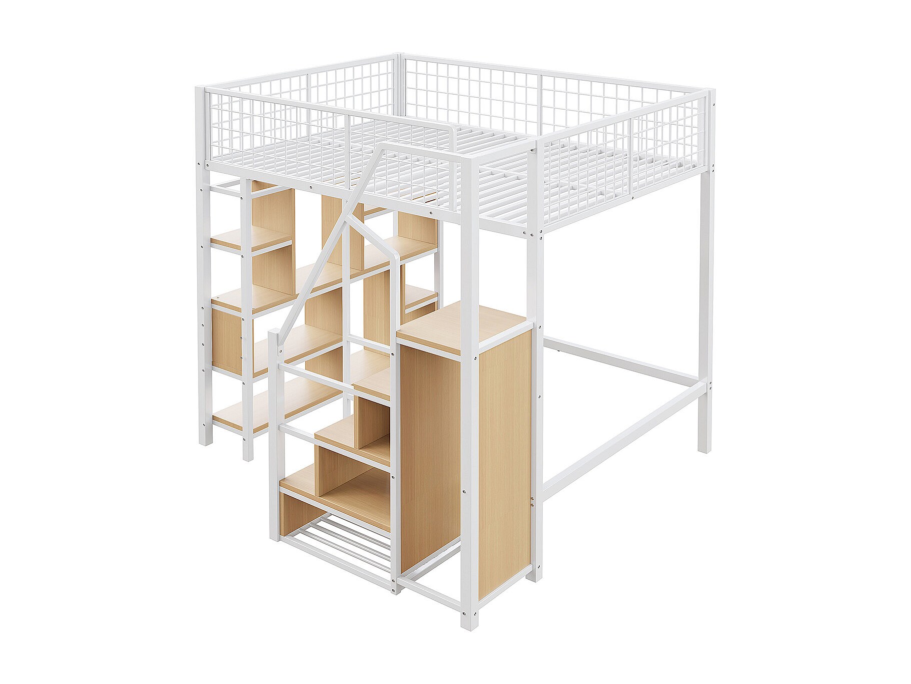Hochbett mit Stauraum Ablageflächen und Treppe Kinderbett Einzelbett Jugendbett Metallbett 140 x 200 cm Weiß