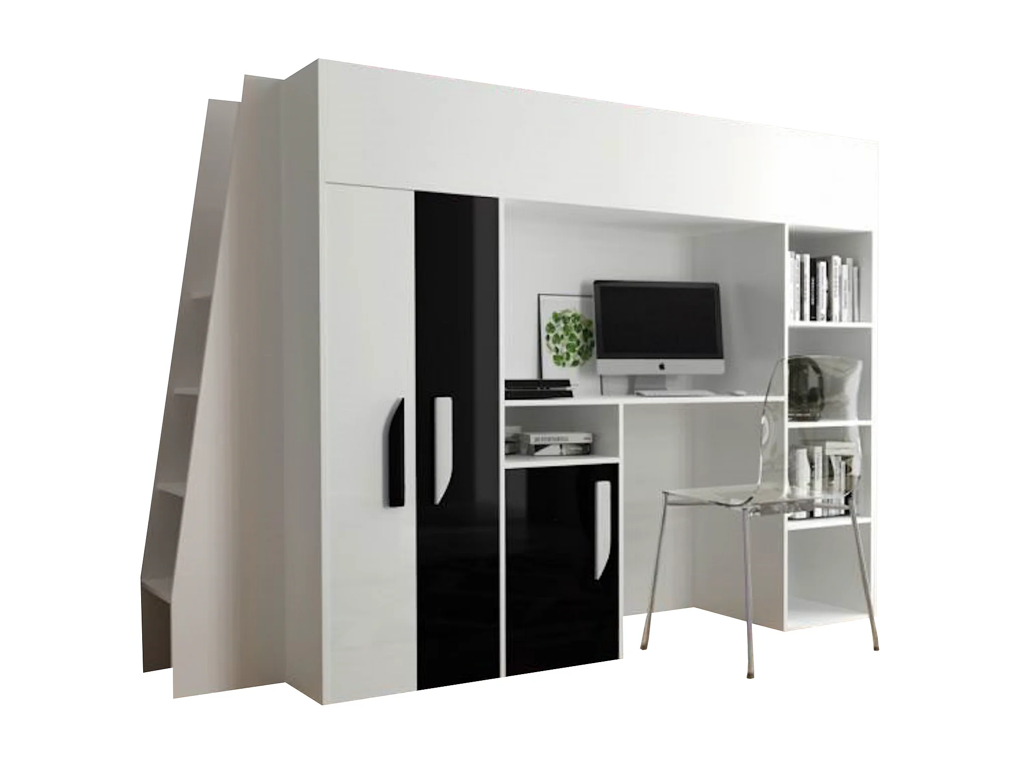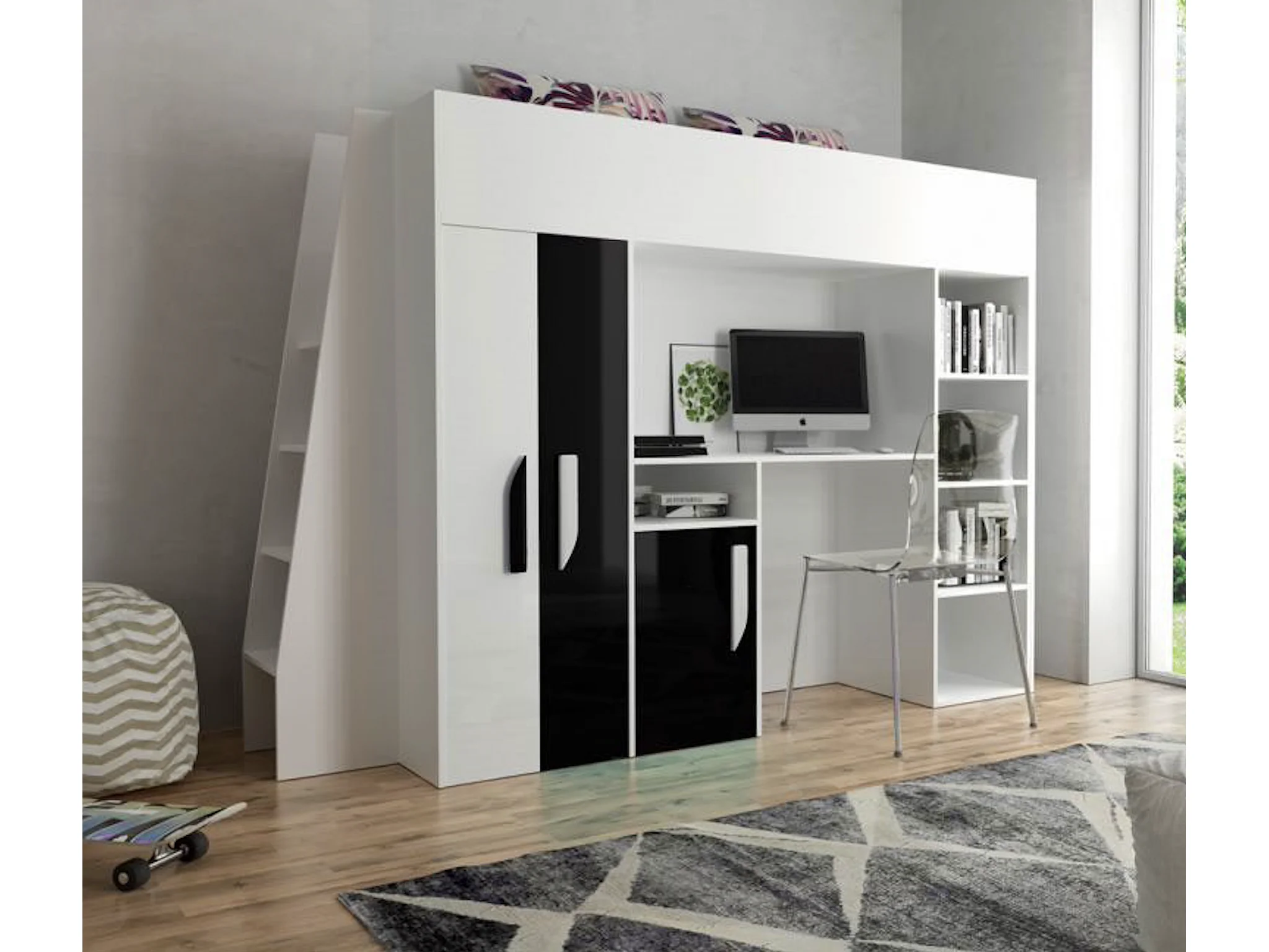 HOCHBETT Party weiß / schwarz Hochglanz - Griffe weiß / schwarz 95 / 230 / 165cm