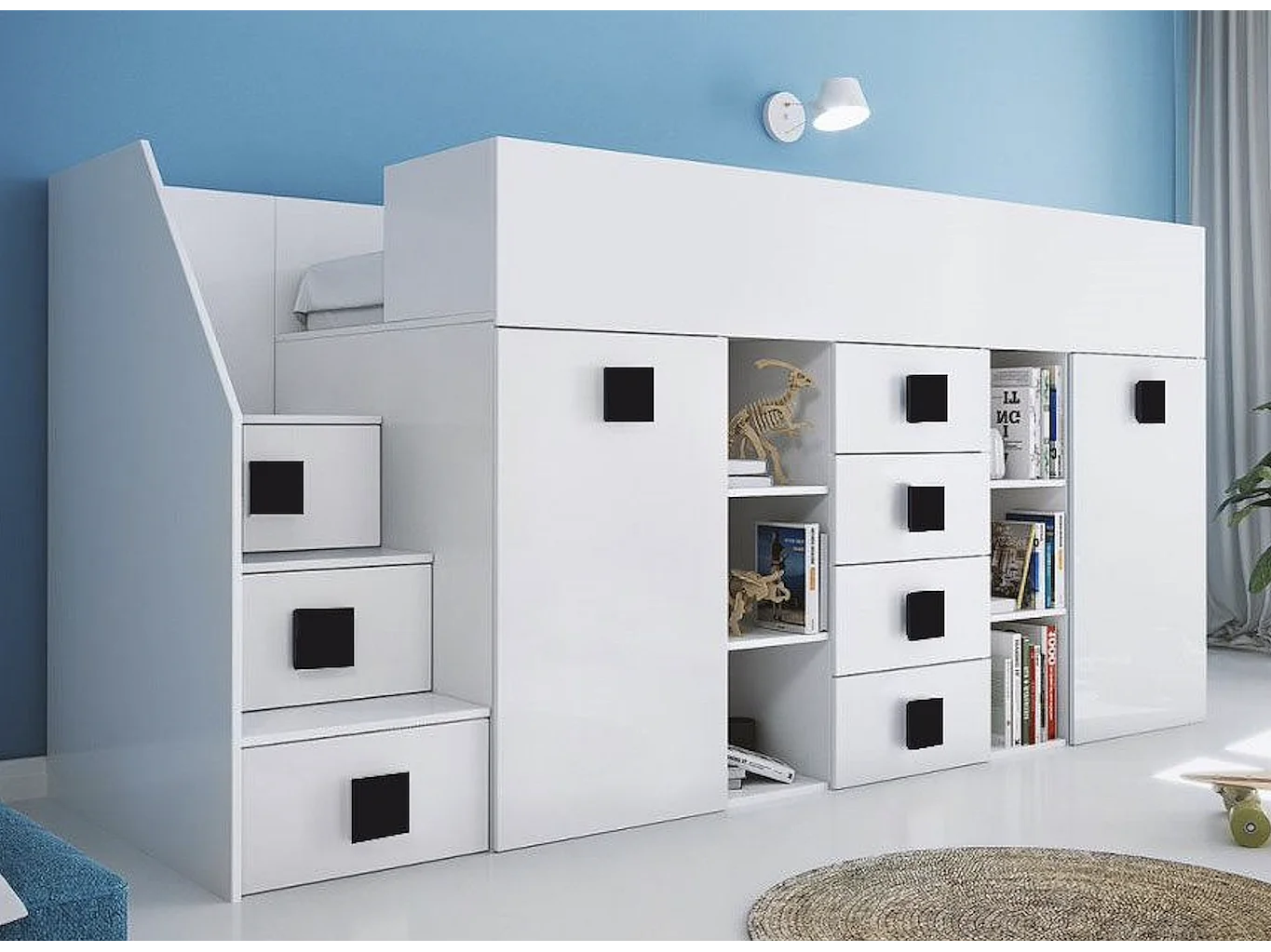 HOCHBETT Toledo Treppe links weiß / weiß Hochglanz - Griffe schwarz 93 / 248,5 / 123cm