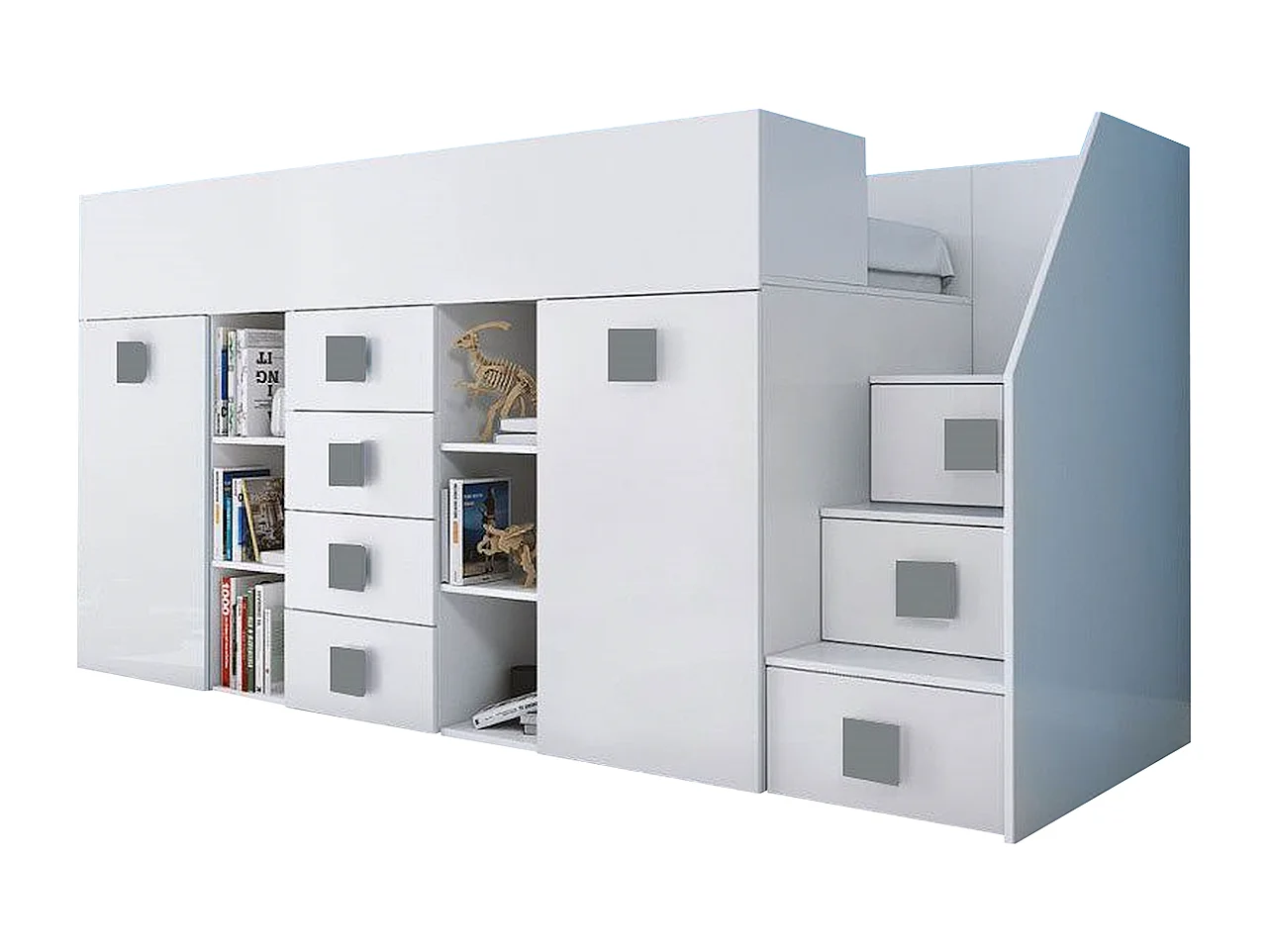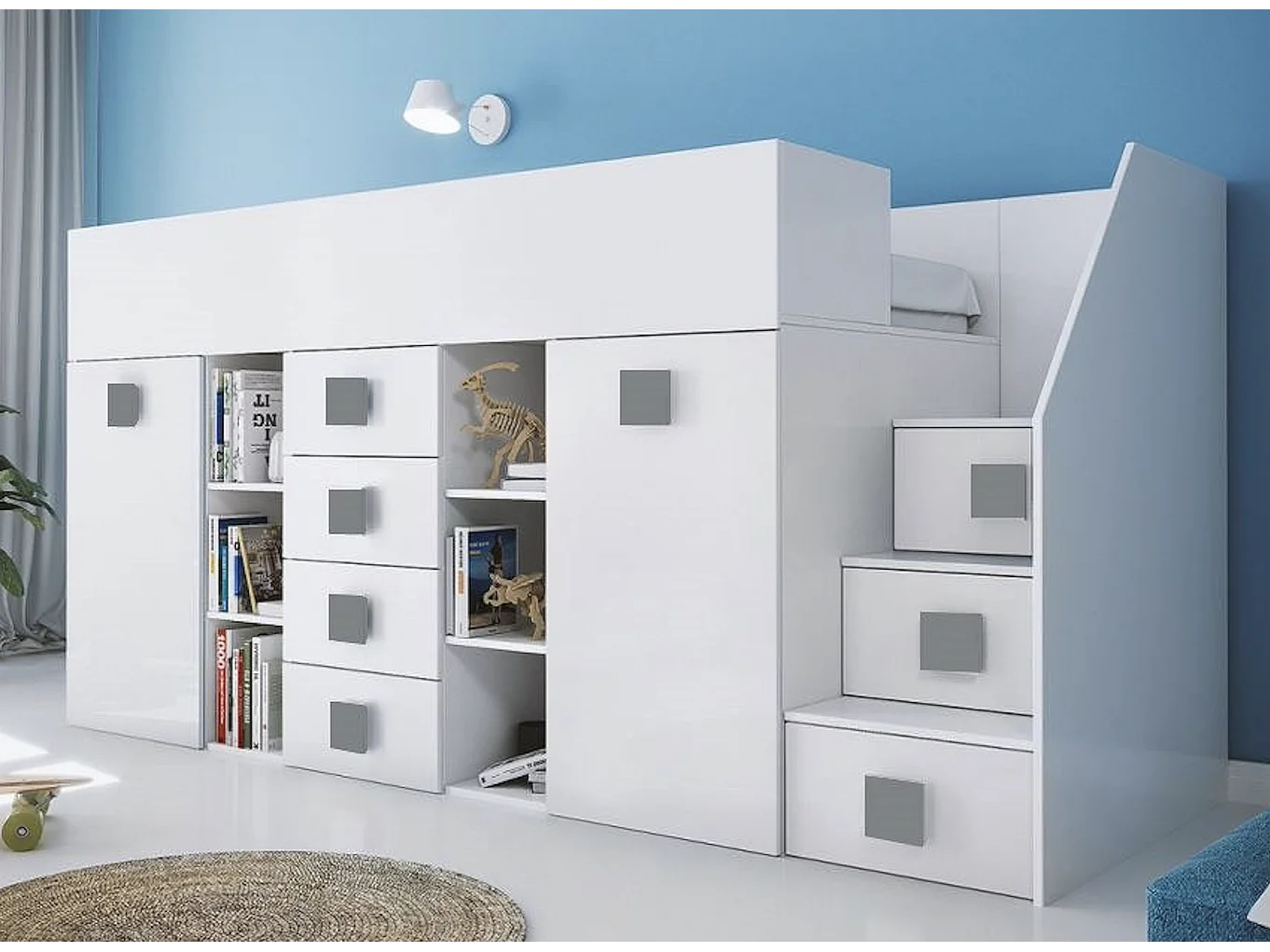 HOCHBETT Toledo Treppe rechts weiß / weiß Hochglanz - Griffe grau 93 / 248,5 / 123cm