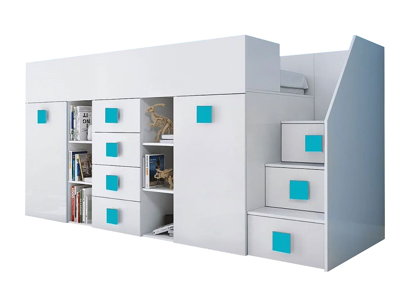 HOCHBETT Toledo Treppe rechts weiß / weiß Hochglanz - Griffe türkis 93 / 248,5 / 123cm