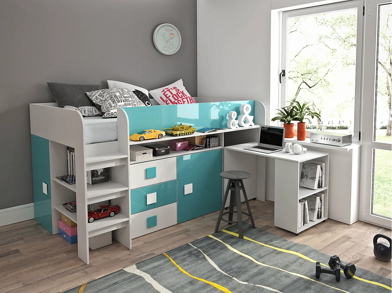 HOCHBETT Toledo weiß / türkis Hochglanz - Griffe weiß / türkis 106 / 204 / 125cm