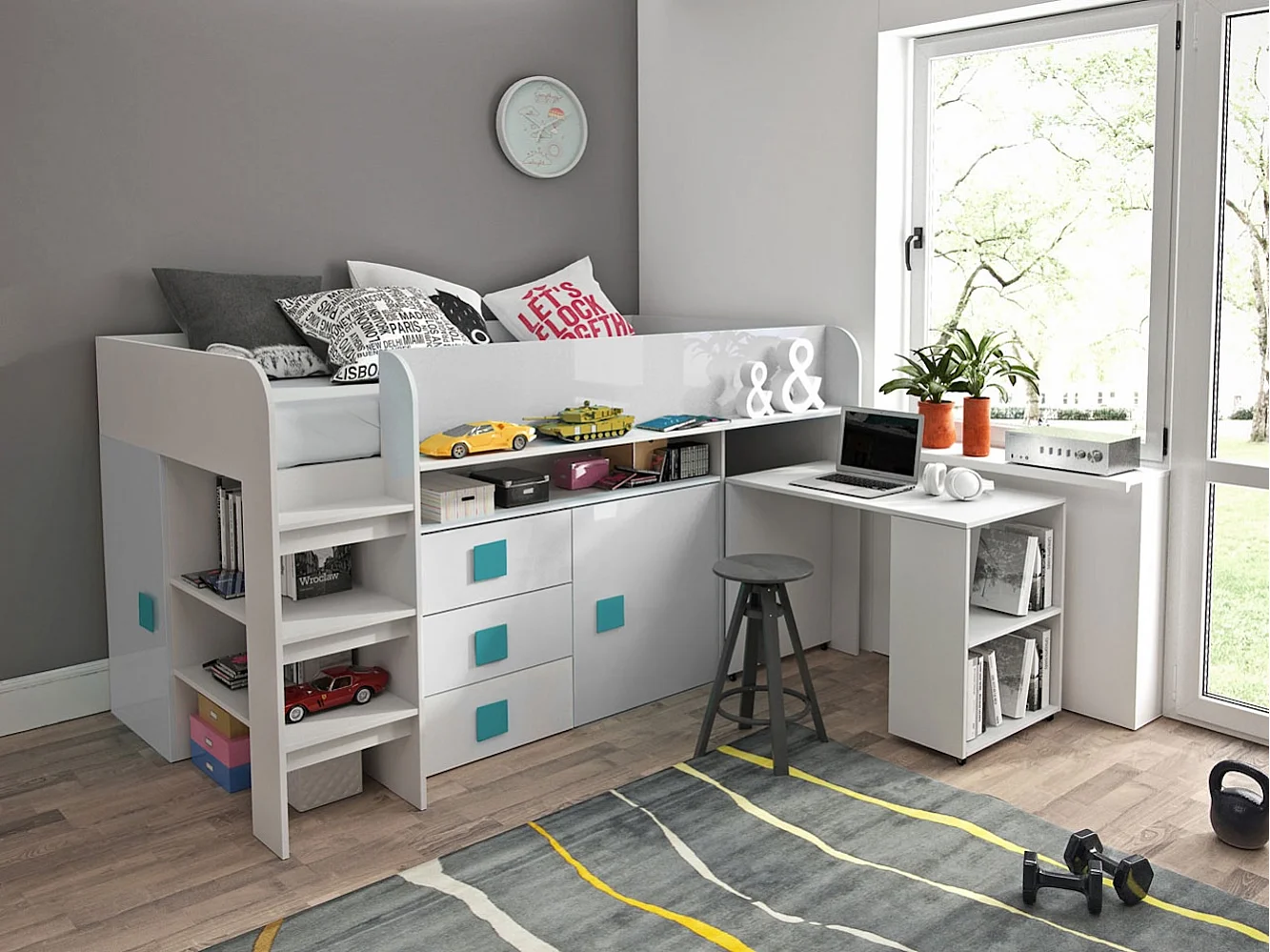 HOCHBETT Toledo weiß / weiß Hochglanz - Griffe türkis 204 / 106 / 125cm