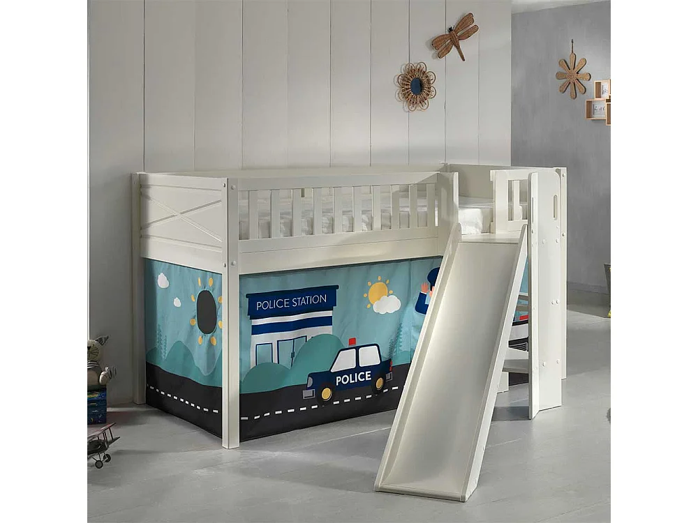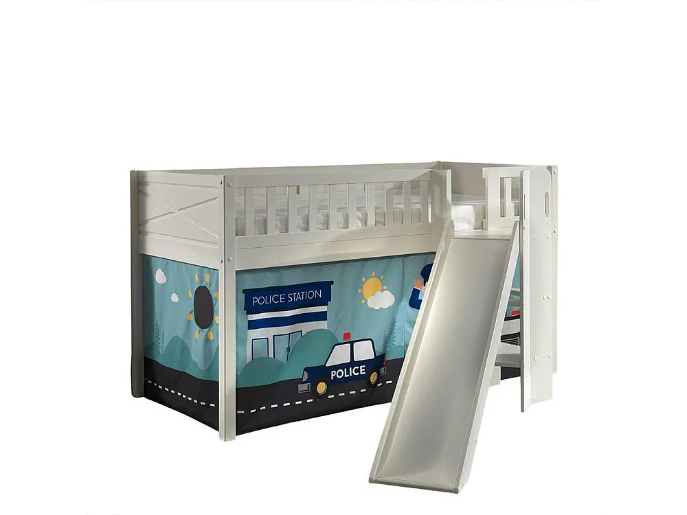 Hochbettgestell aus Kiefer Massivholz Polizei Motiv Vorhang