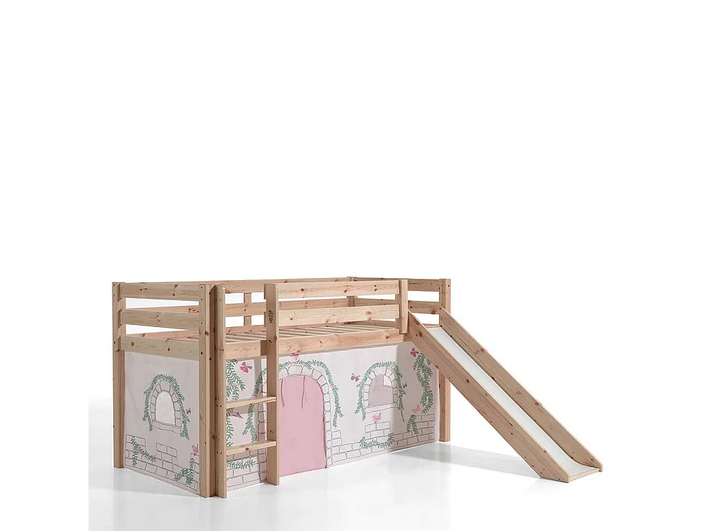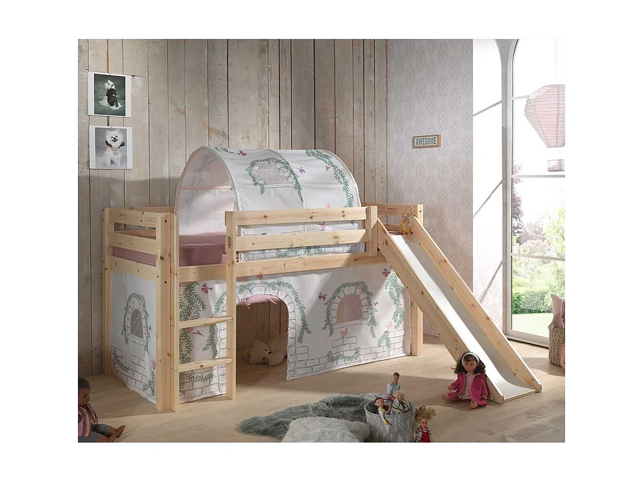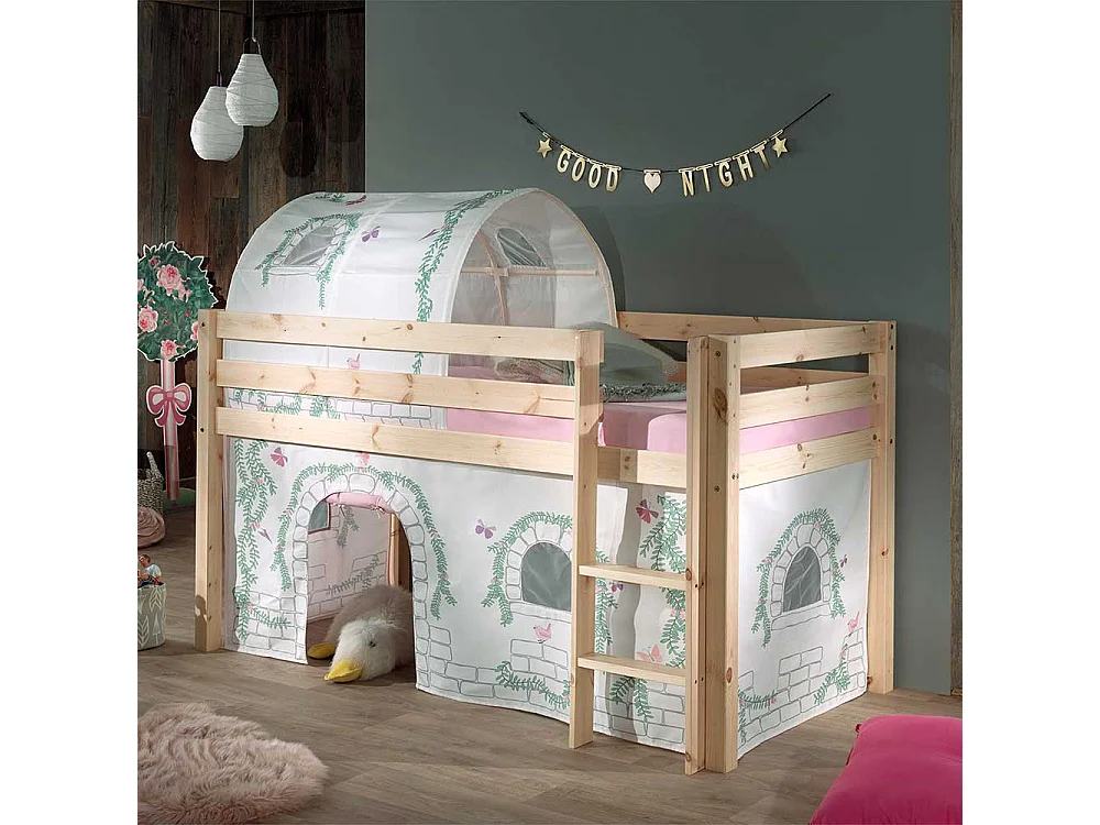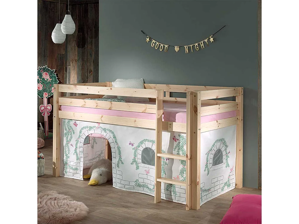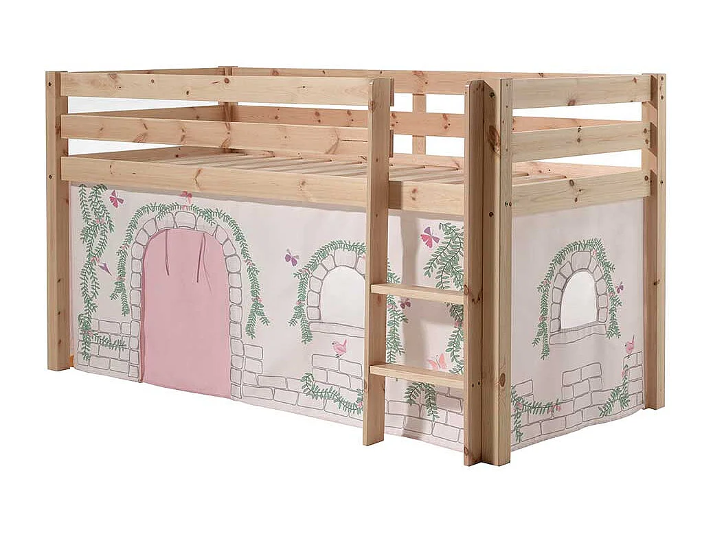 Hochbettgestell aus Kiefer Massivholz Vorhang