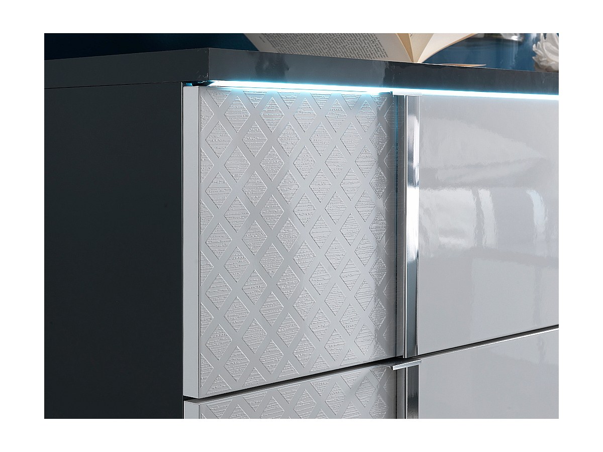 Die Kommode CONSCIENCE besticht mit 5 geräumigen Schubladen mit Soft-Close-Mechanismus für einen praktischen und geräuschlosen Gebrauch. Die LED-Beleuchtung unter der Oberplatte unterstreicht die geraden Linien des Möbels. Die weiß lackierten Oberflächen kontrastieren mit der grauen Struktur und werden Sie garantiert begeistern.