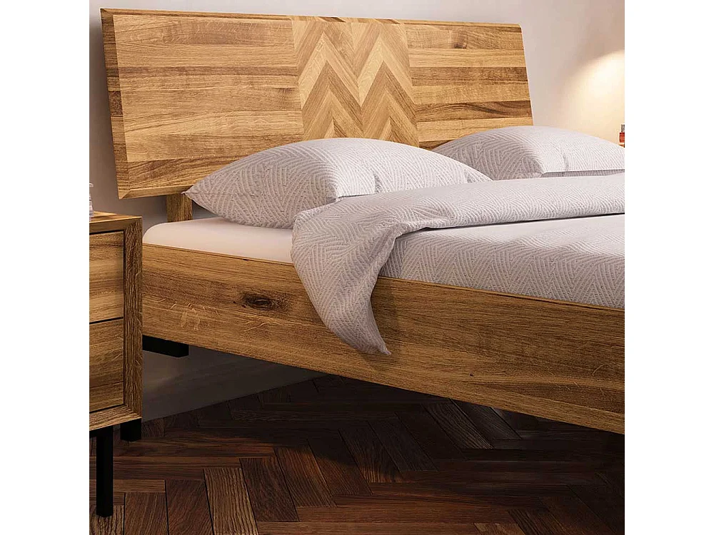 Hochwertiges Holzbett aus Wildeiche Massivholz Vierfußgestell aus Metall