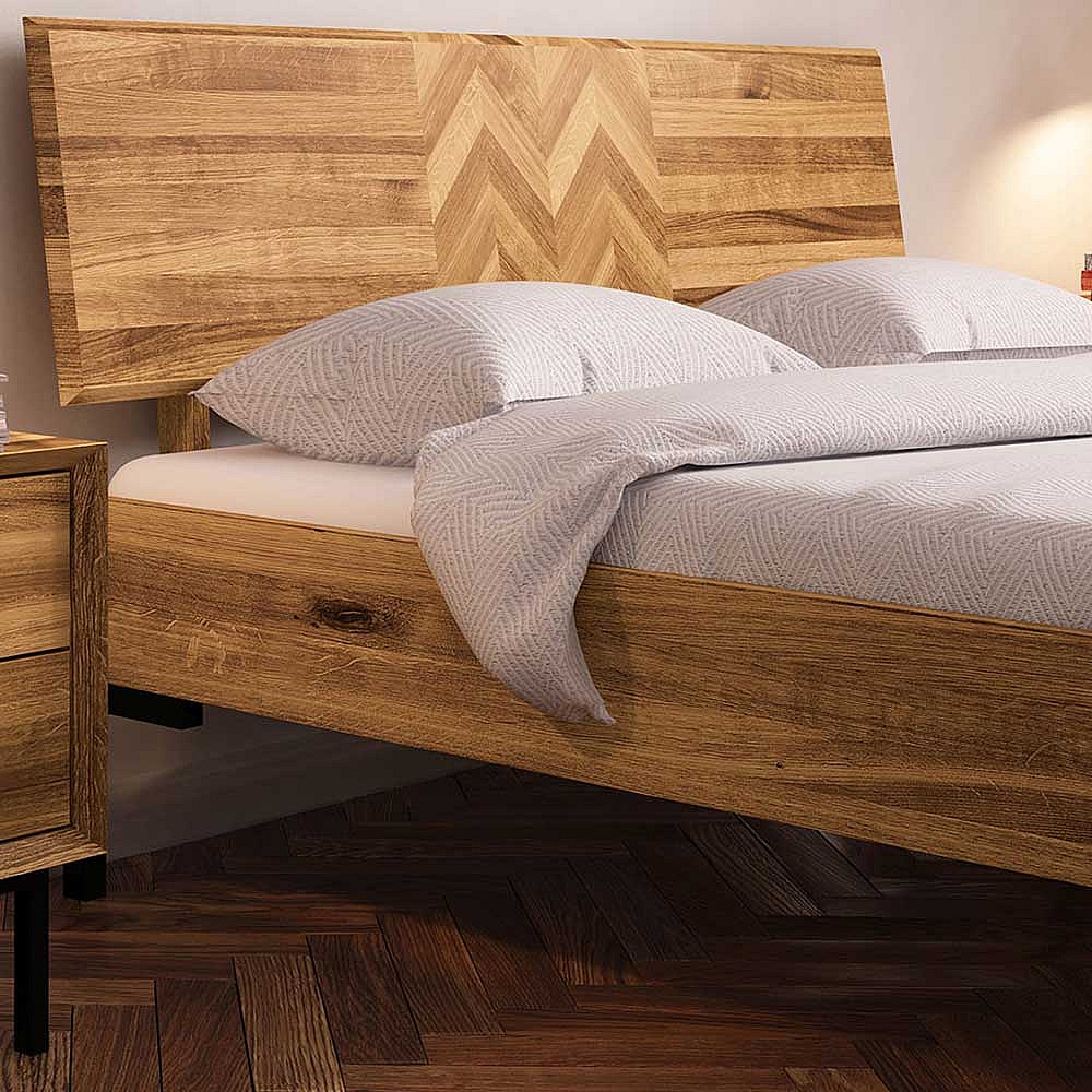 Hochwertiges Holzbett aus Wildeiche Massivholz Vierfu�gestell aus Metall
