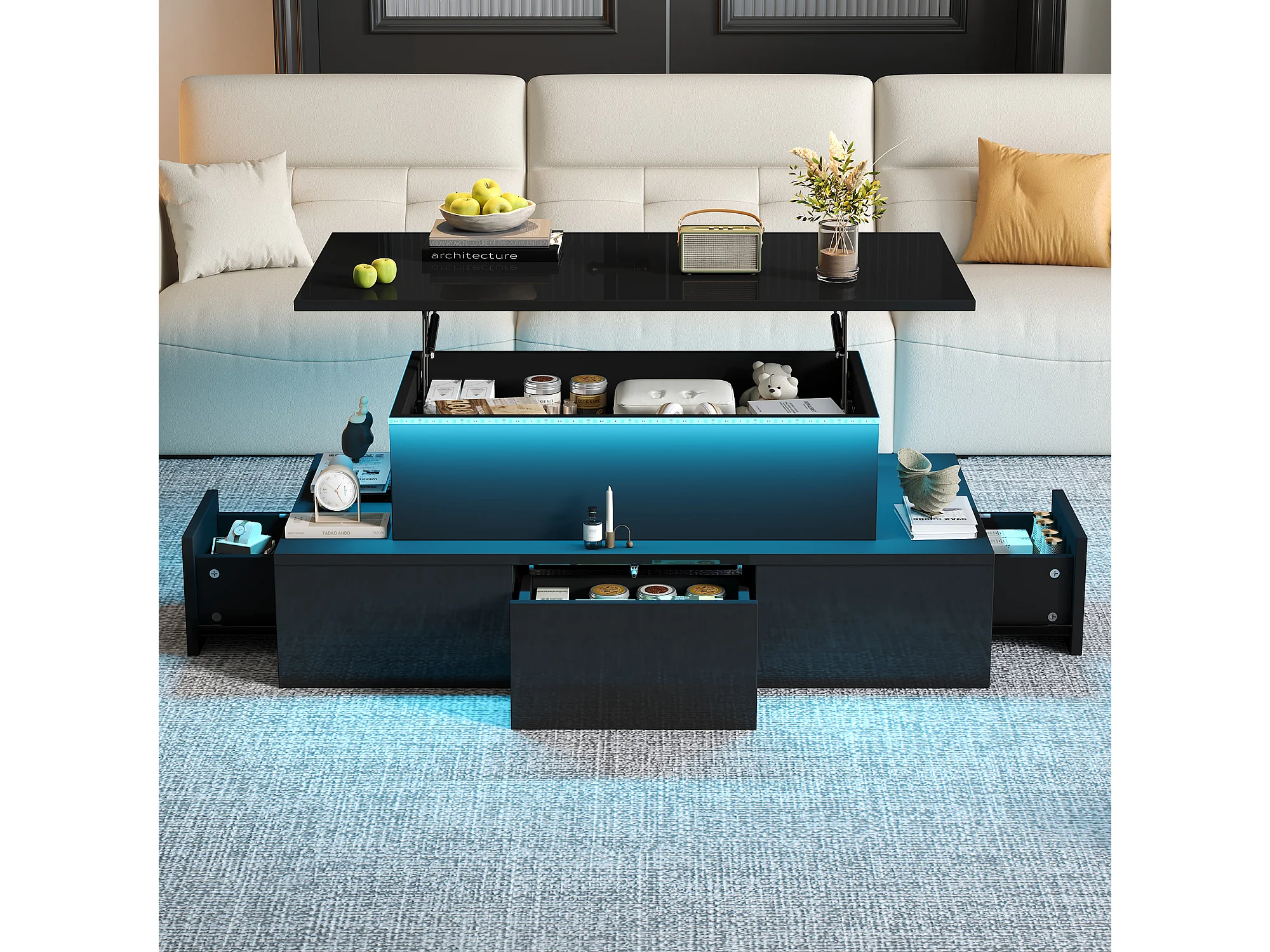 Höhenverstellbarer Couchtisch 100x50x40cm - mit 4 Schubladen - mit LED - Versteckter Stauraum - Hochglanzfinish - MDF - ​​Schwarz​