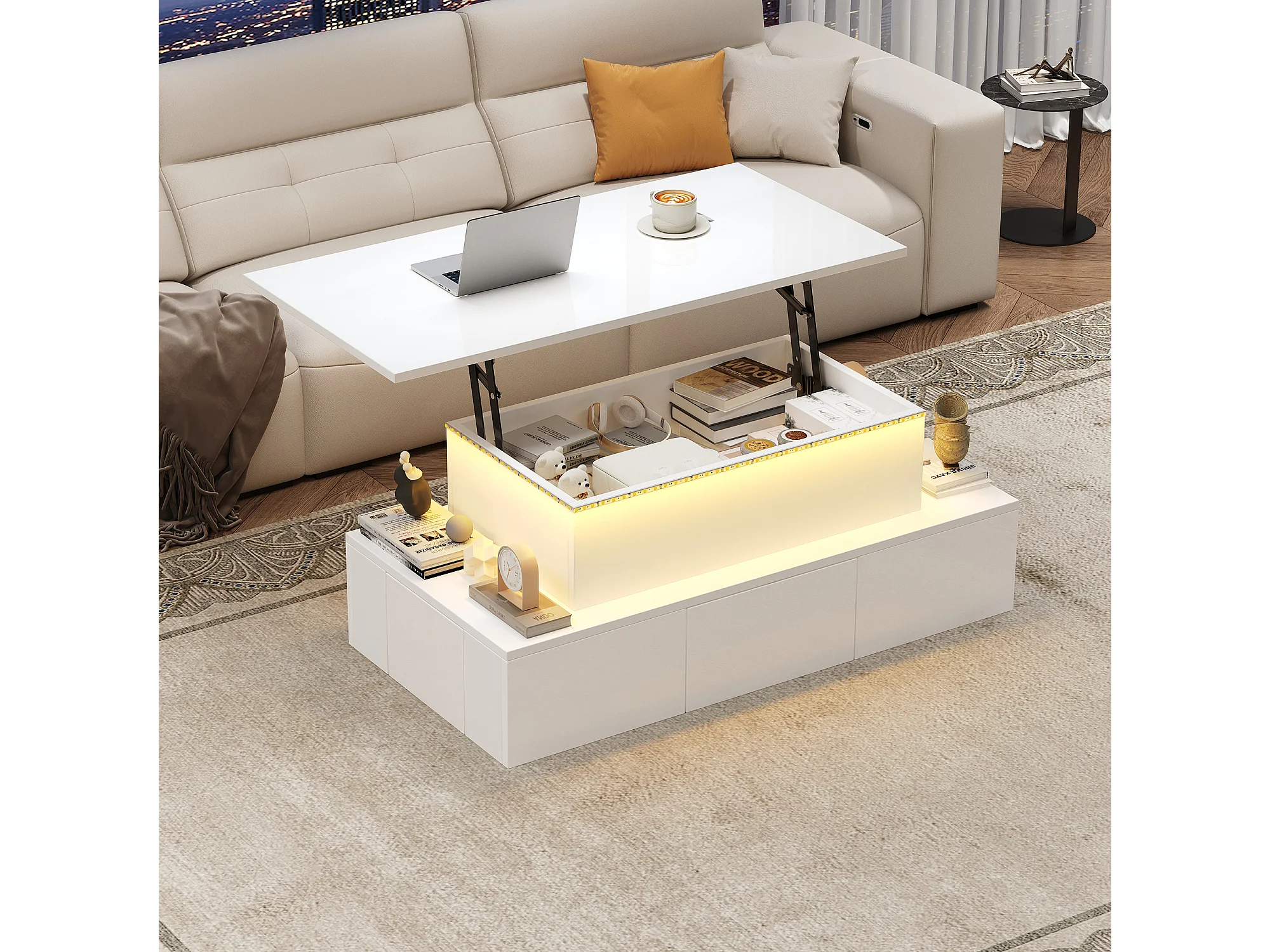 Höhenverstellbarer Couchtisch 100x50x40cm - mit 4 Schubladen - mit LED - Versteckter Stauraum - Hochglanzfinish - MDF - Weiß
