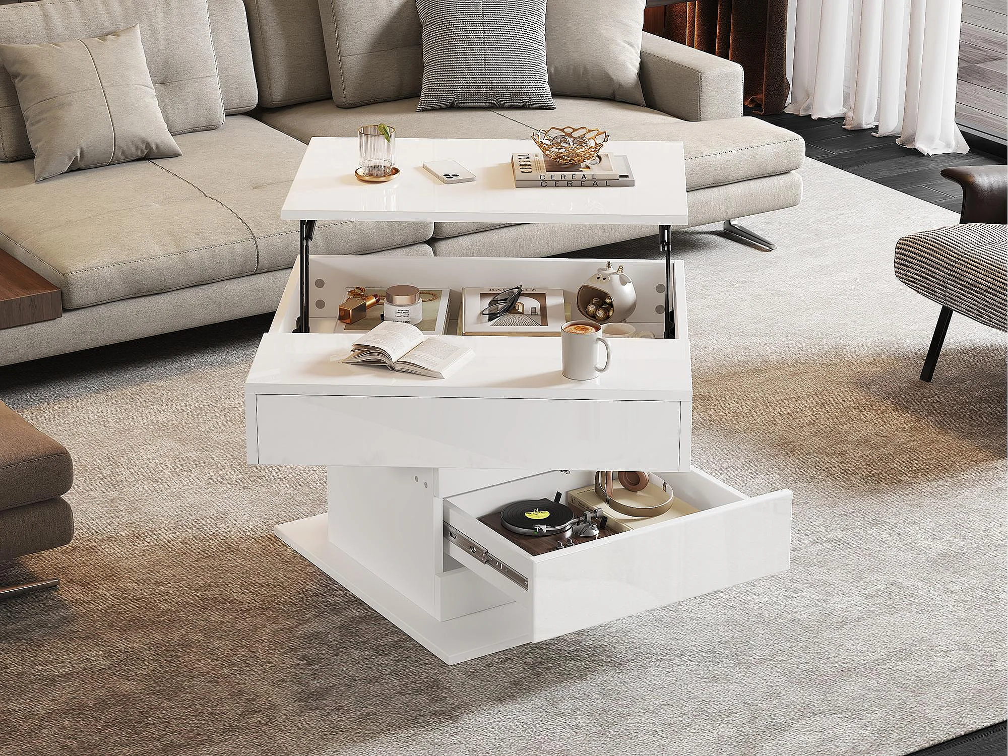 Höhenverstellbarer Couchtisch 70x70x45cm - 360° drehbare Platte - mit 1 Schublade - Versteckter Stauraum - Hochglanzfinish - Weiß