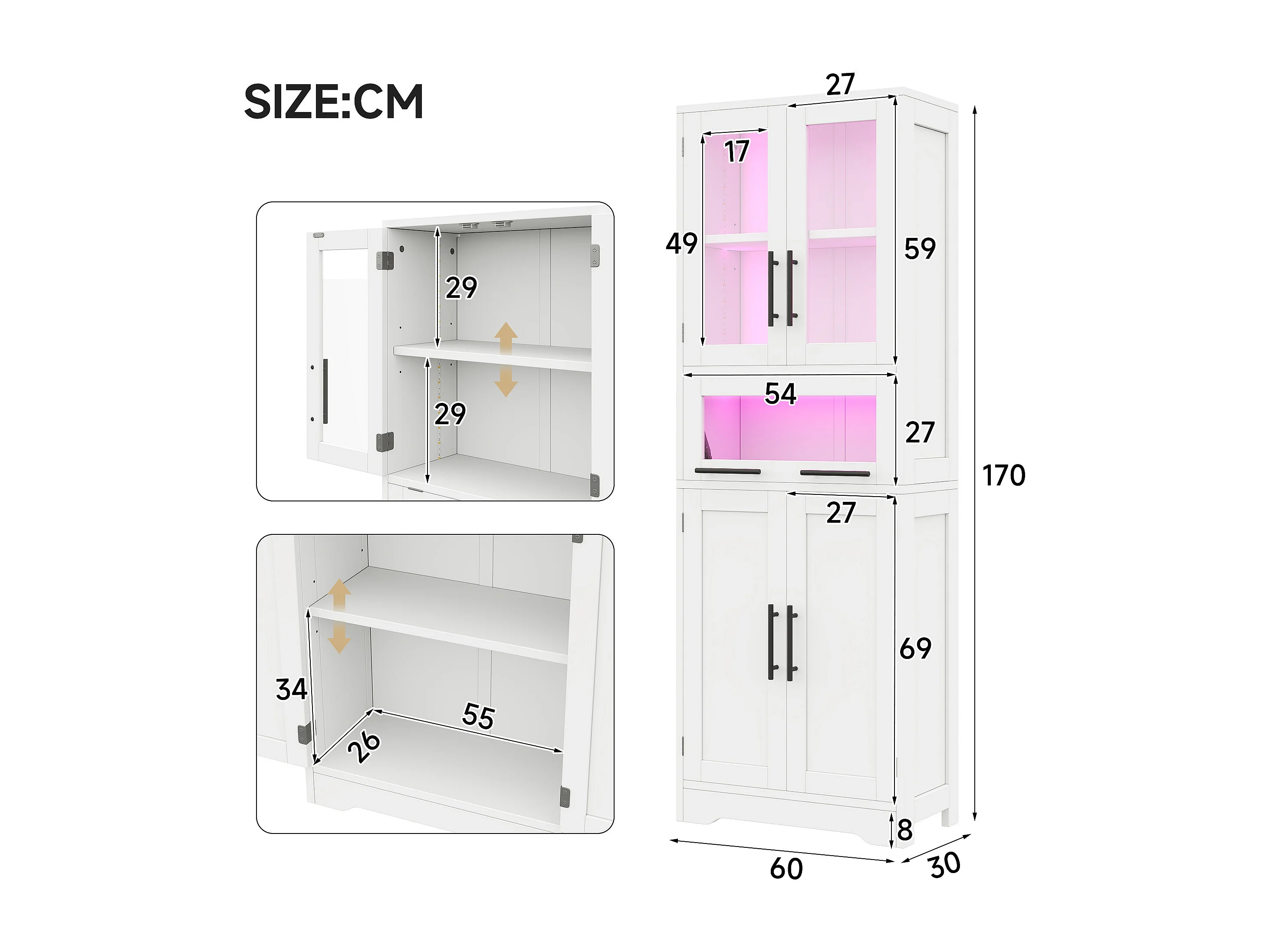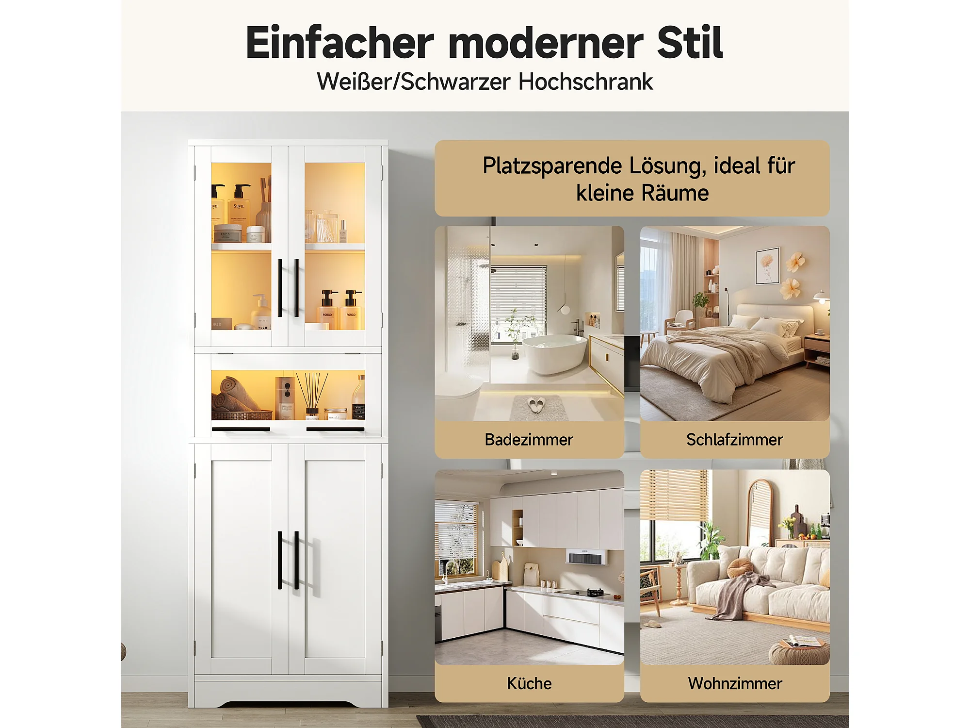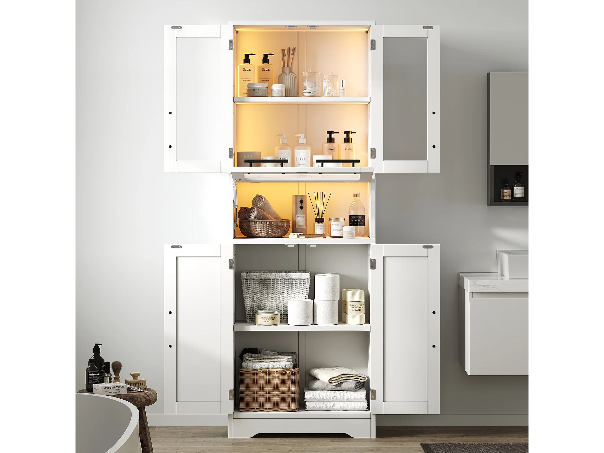 Hoher Badezimmerschrank 60x30x170 cm - Mit LED-Leiste - 4 Türen - Höhenverstellbare Einlegeböden - MDF - Weiß