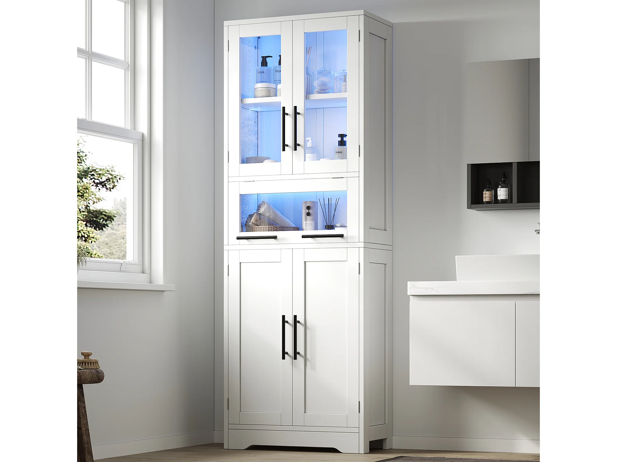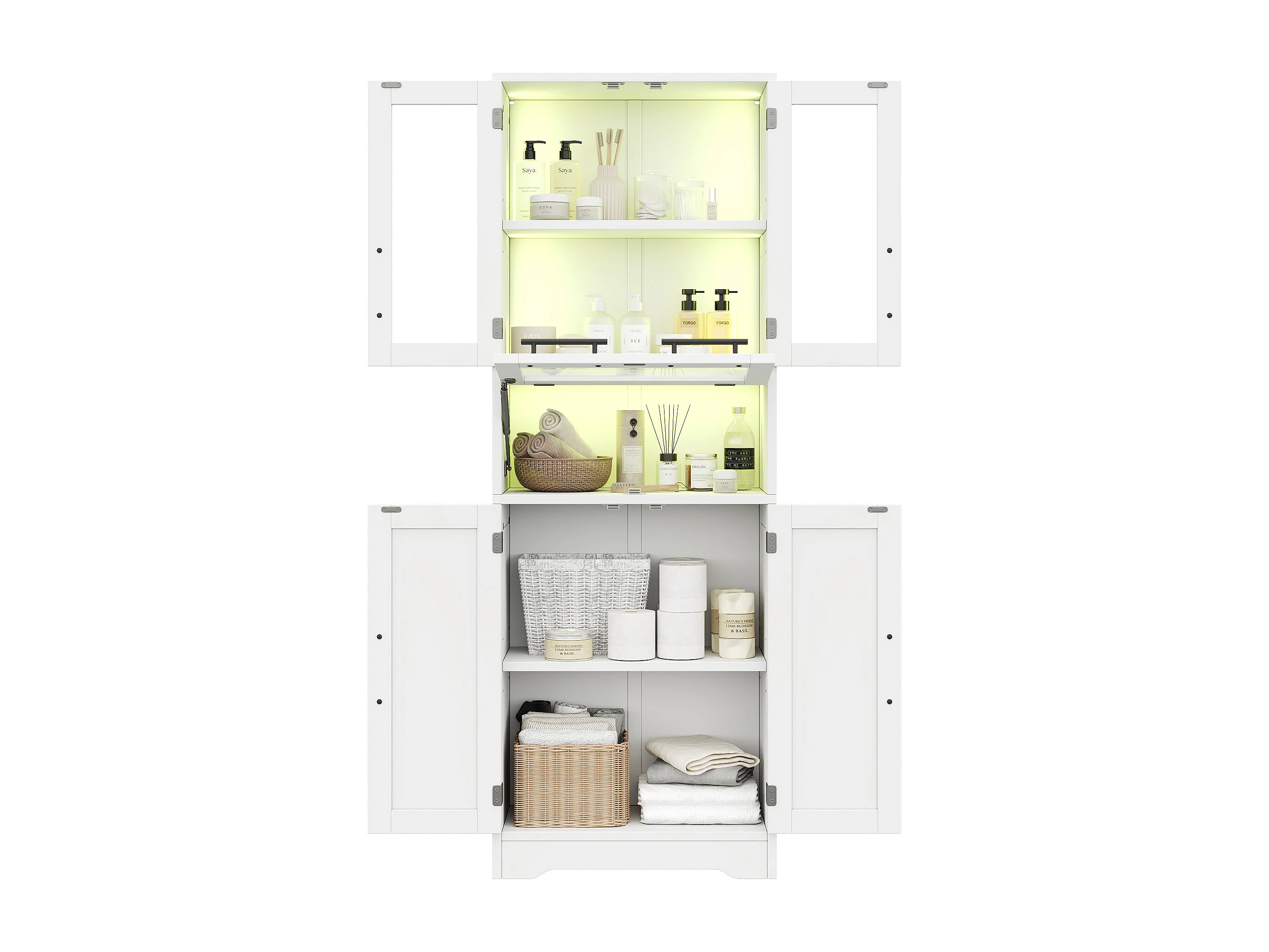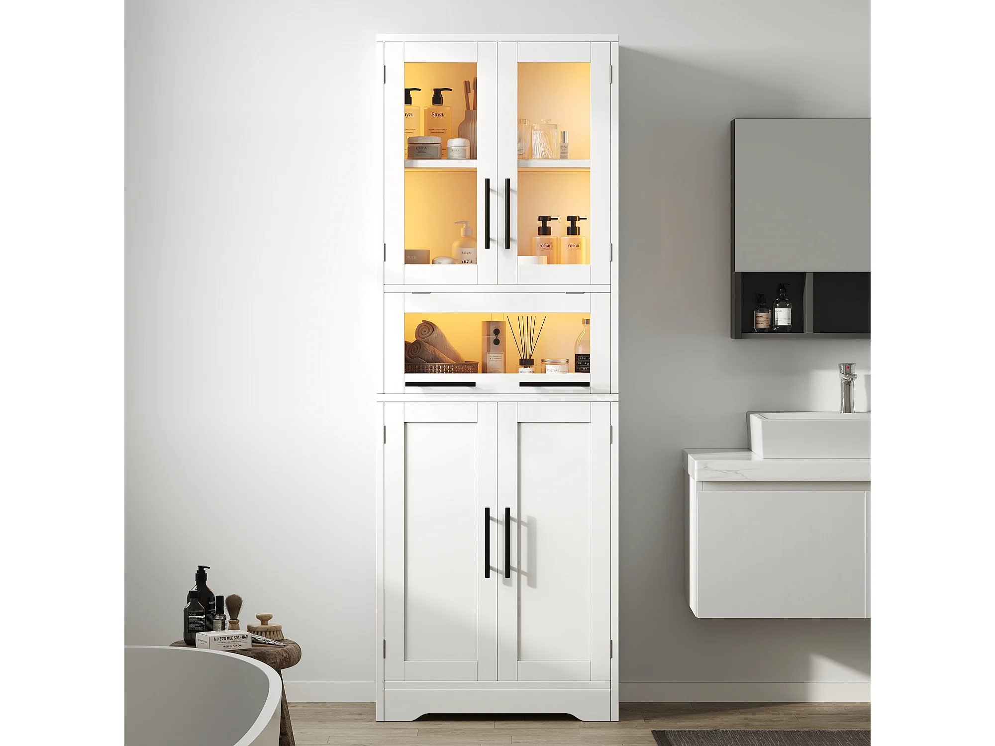 Hoher Badezimmerschrank 60x30x170 cm - Mit LED-Leiste - 4 Türen - Höhenverstellbare Einlegeböden - MDF - Weiß