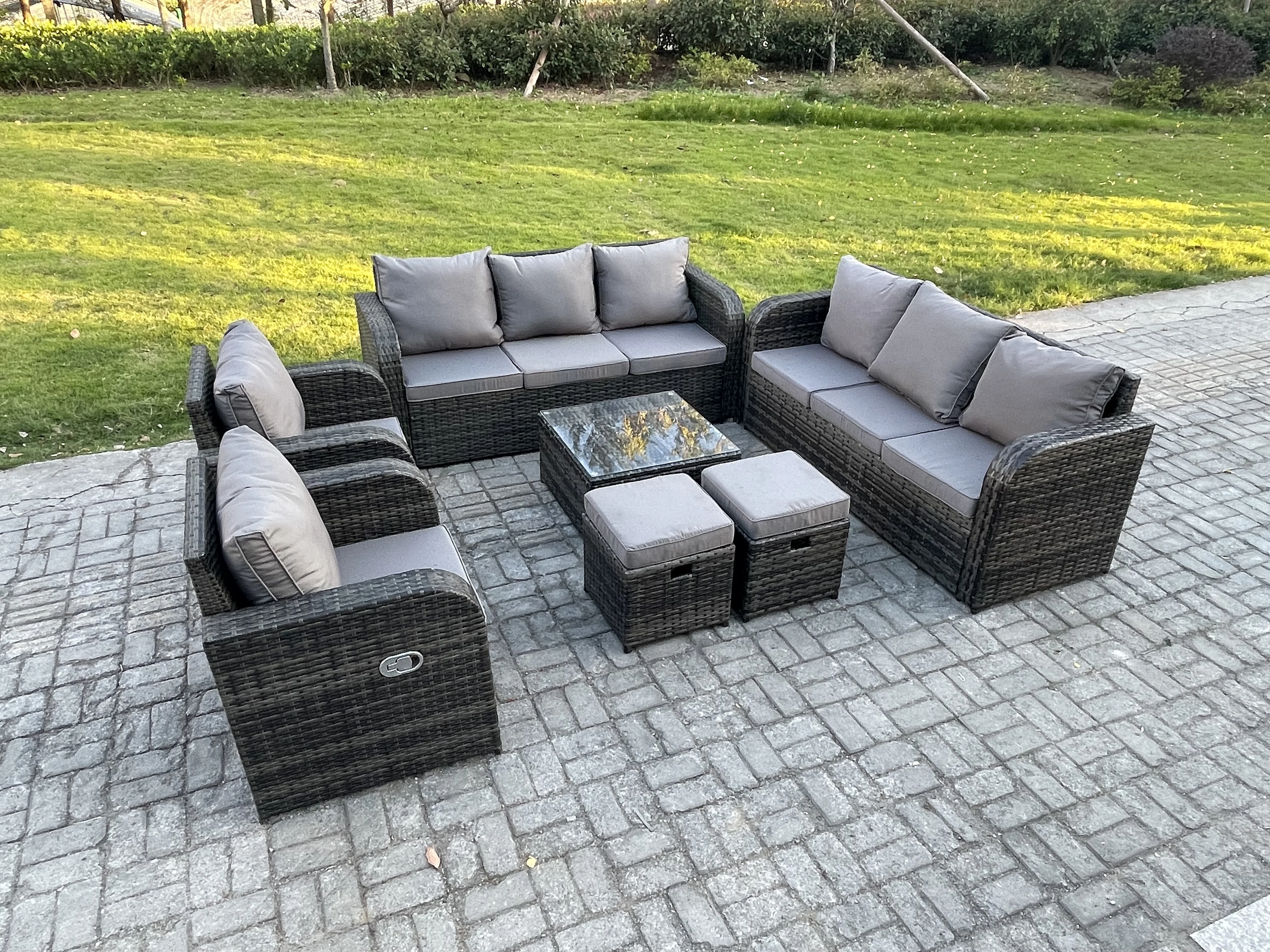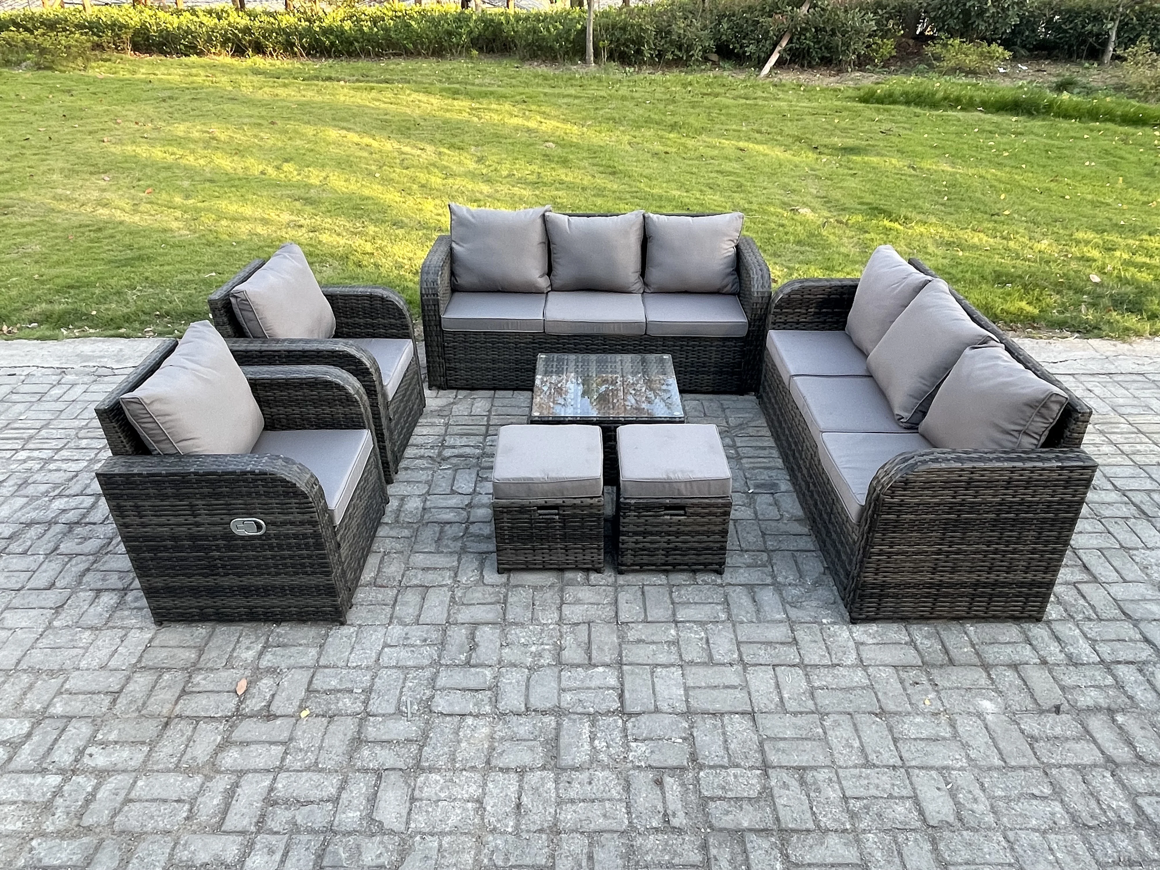 Hoher Rücken Polyrattan Gartenmöbel Set mit Quadratischer Couchtisch 2 kleine Fußhockern Garten Lounge Set Dunkelgrau Gemischt