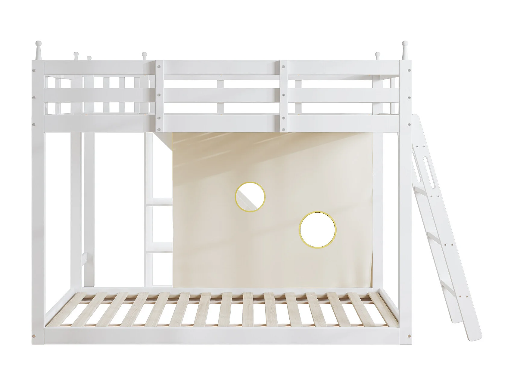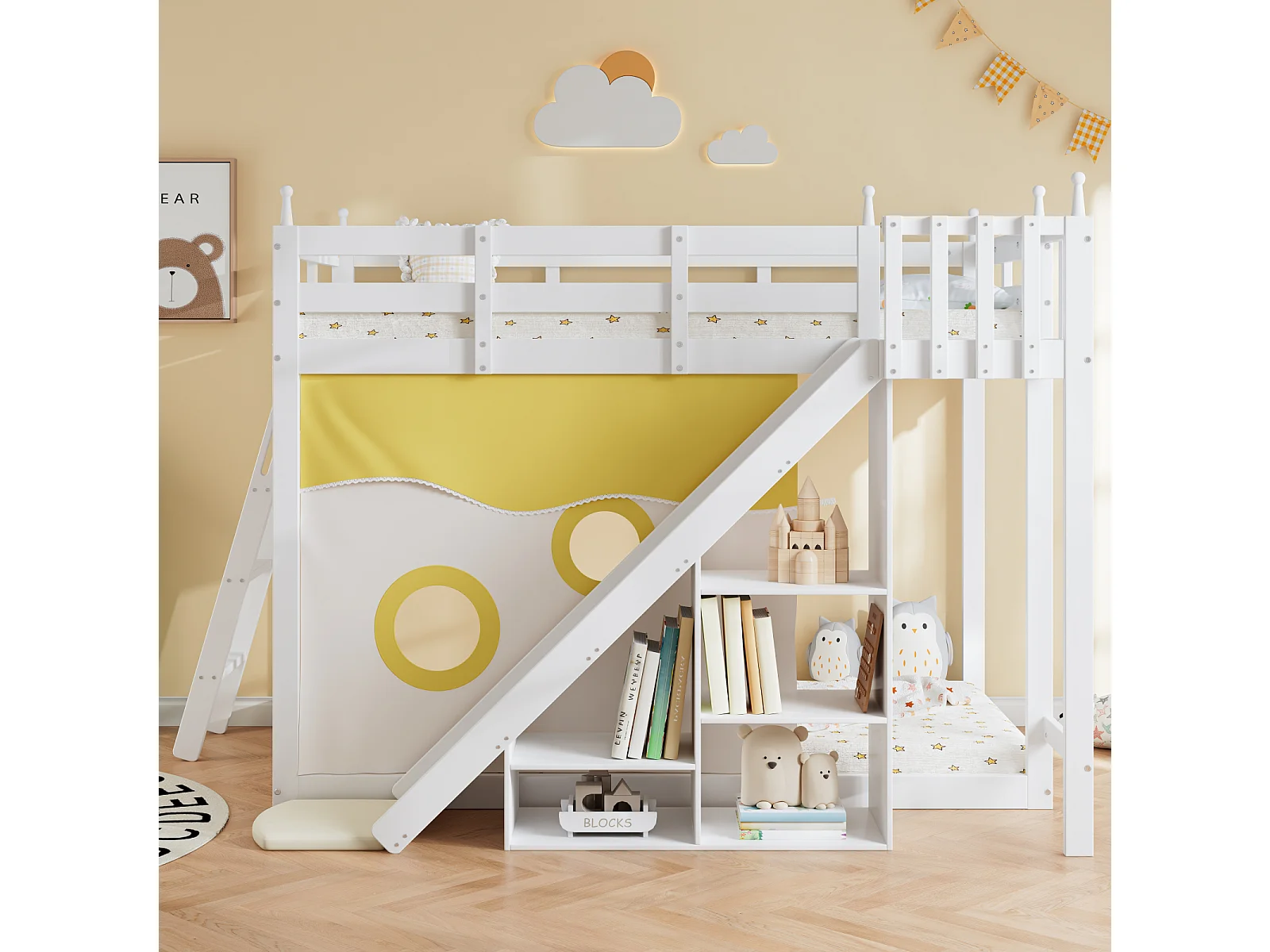 Holz-Etagenbett, Leiter, Zaun, Vorhang, Rutsche, Regal, Schutz, Gitter, Kiefer, weiß, 90x200cm