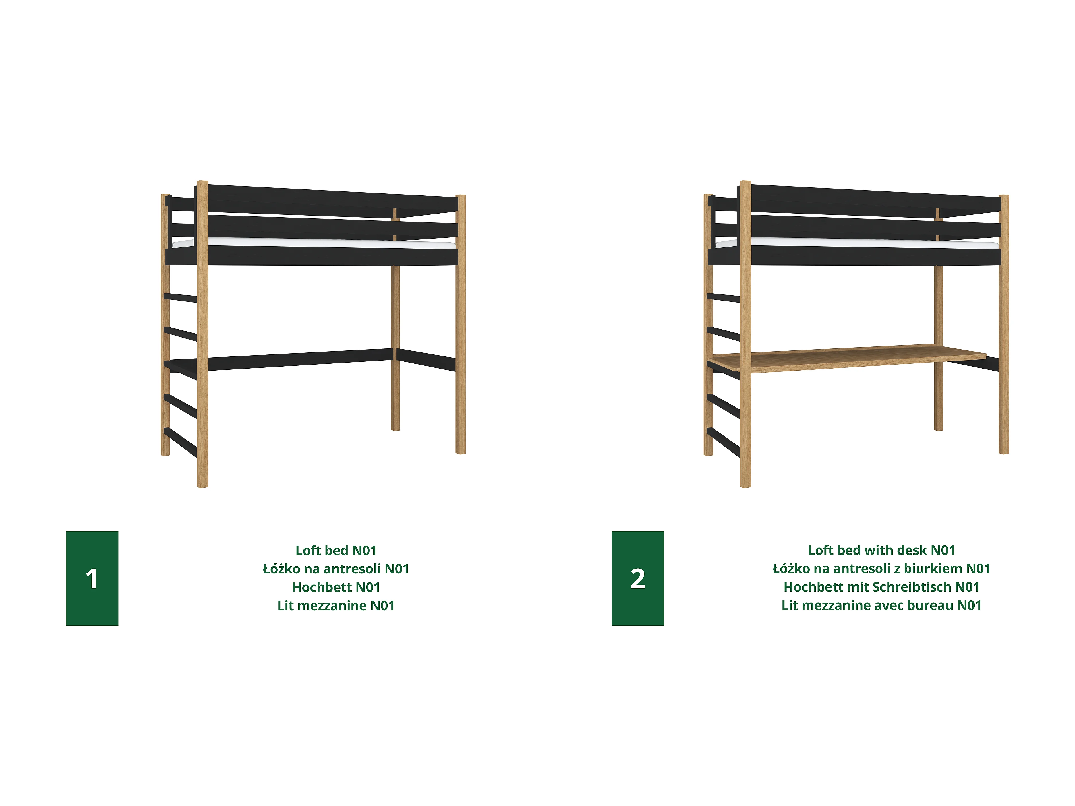 HOCHBETT N01 mit Schreibtisch Schwarz / Eiche Natur 80x180