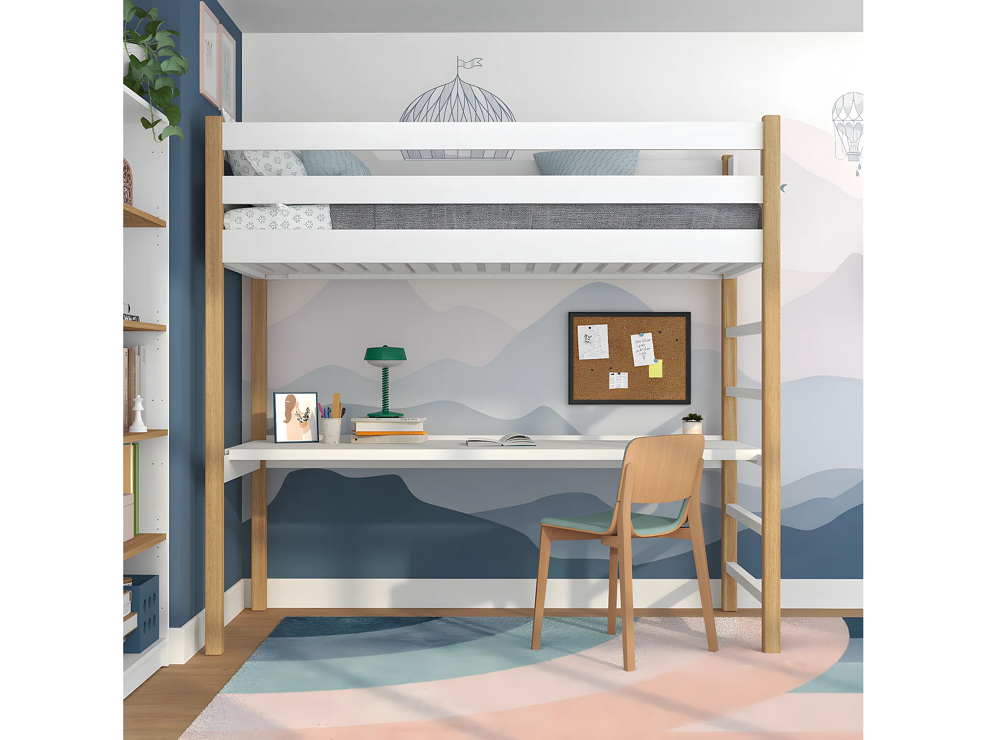 HOCHBETT N01 mit Schreibtisch Weiß / Eiche Natur 120x190