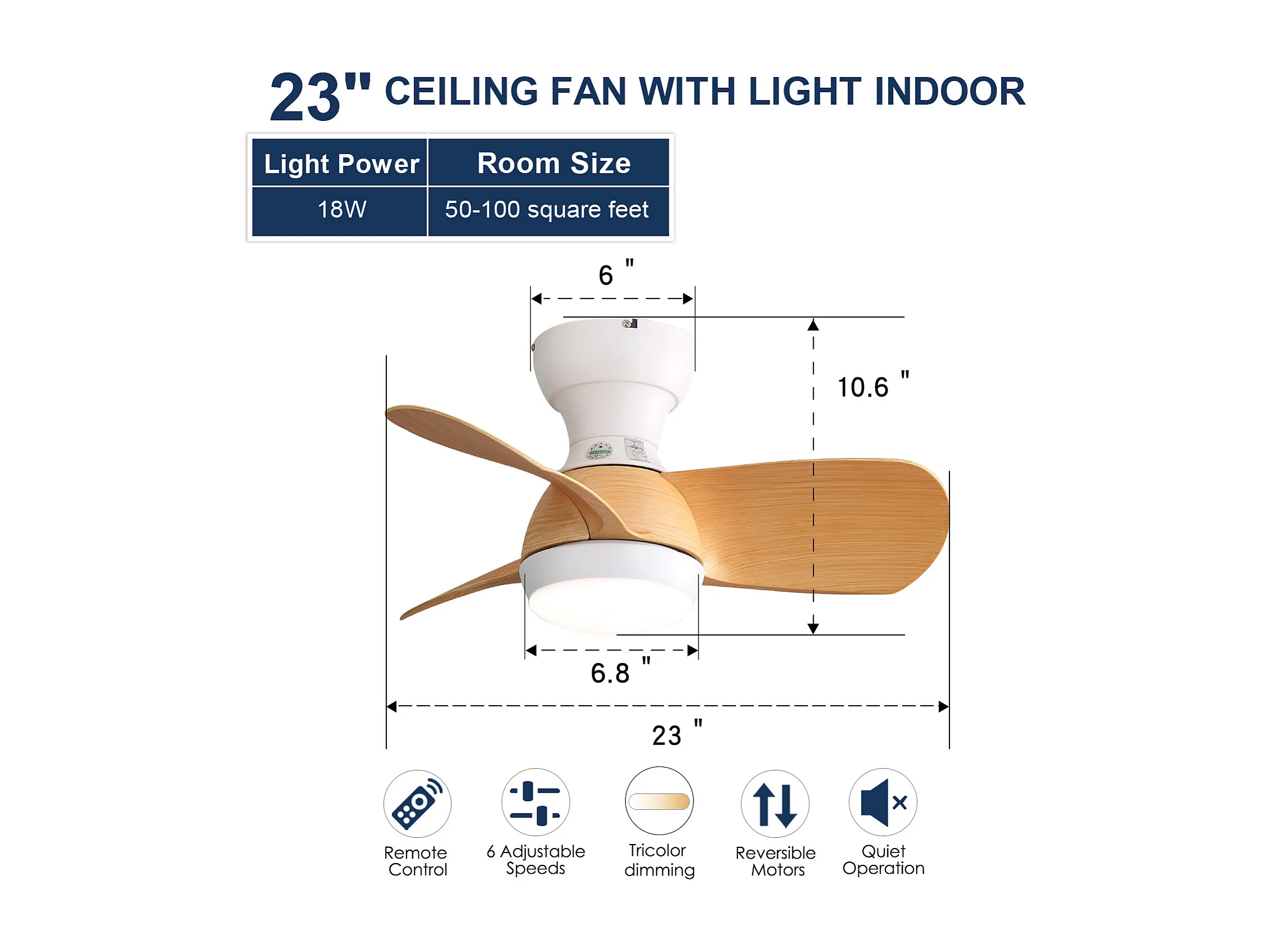 Holzfarbener Deckenventilator mit verstellbarer LED-Beleuchtung und 3 ABS-Flügeln für Schlafzimmer und Wohnzimmer