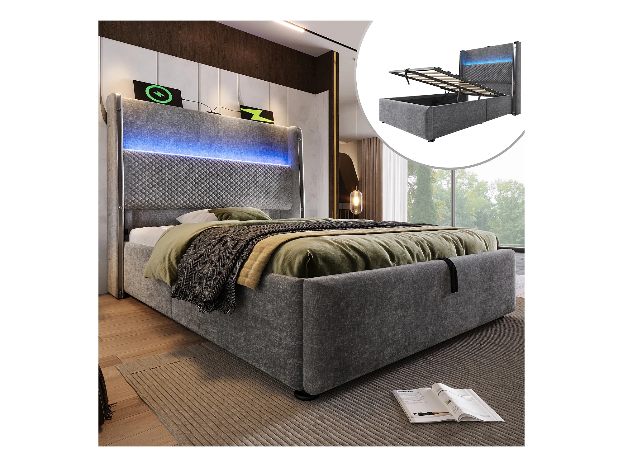 Hydraulisches Bett mit Stauraum und Kopfteil + LEDs und USB/Typ-C-Anschlüssen – 90 x 200 cm – Leinen – Grau