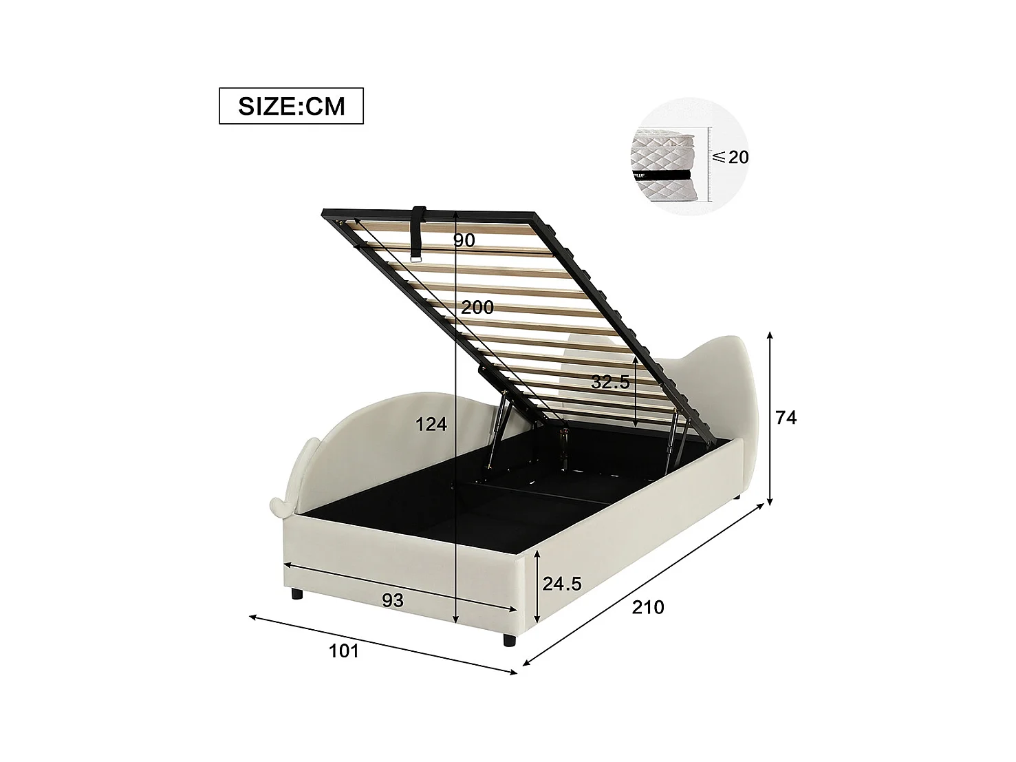Hydraulisches Kinderbett 90 x 200 cm, niedliches Katzendesign, Bettrahmen mit Stauraumlatten, linke Seitenwand, Samt, beige