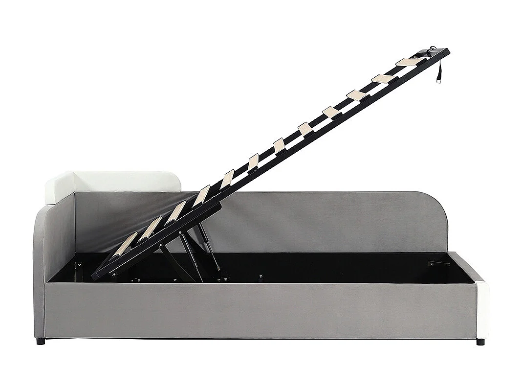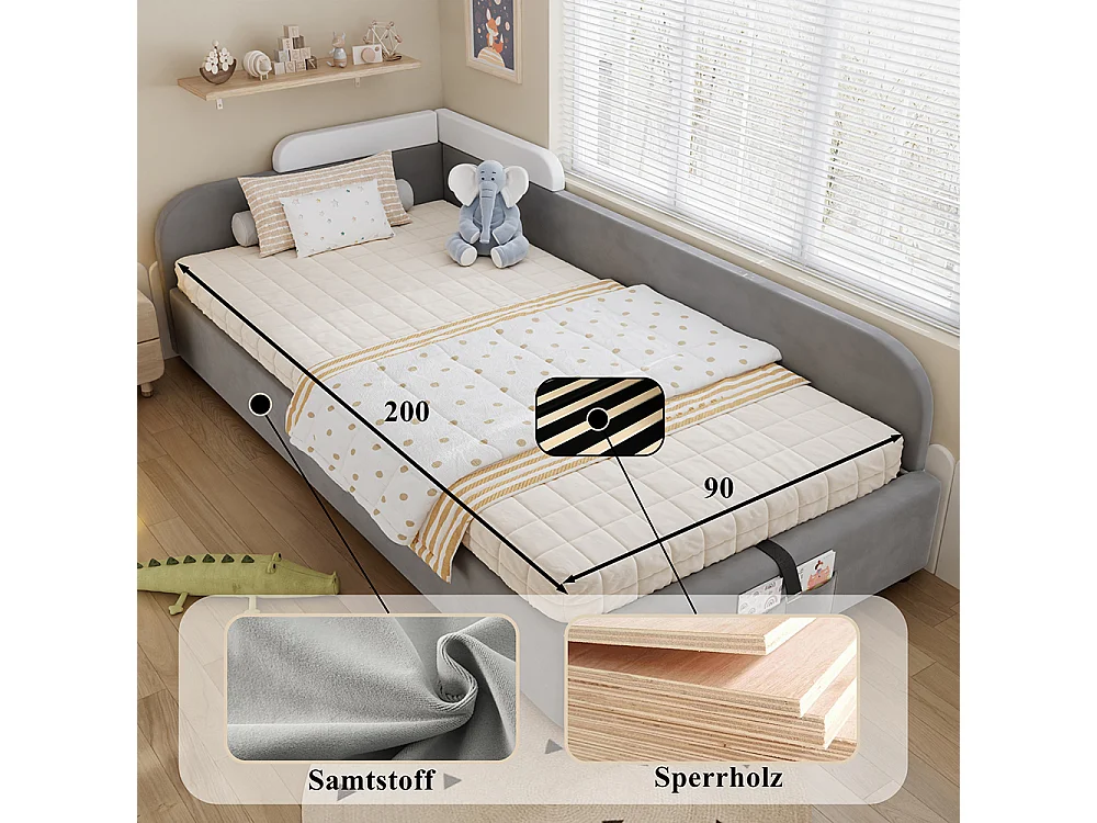 Hydraulisches Kinderbett 90 x 200 cm, weiche Seitengitter, rechte Seitenwand, Samt + Sperrholz, grau