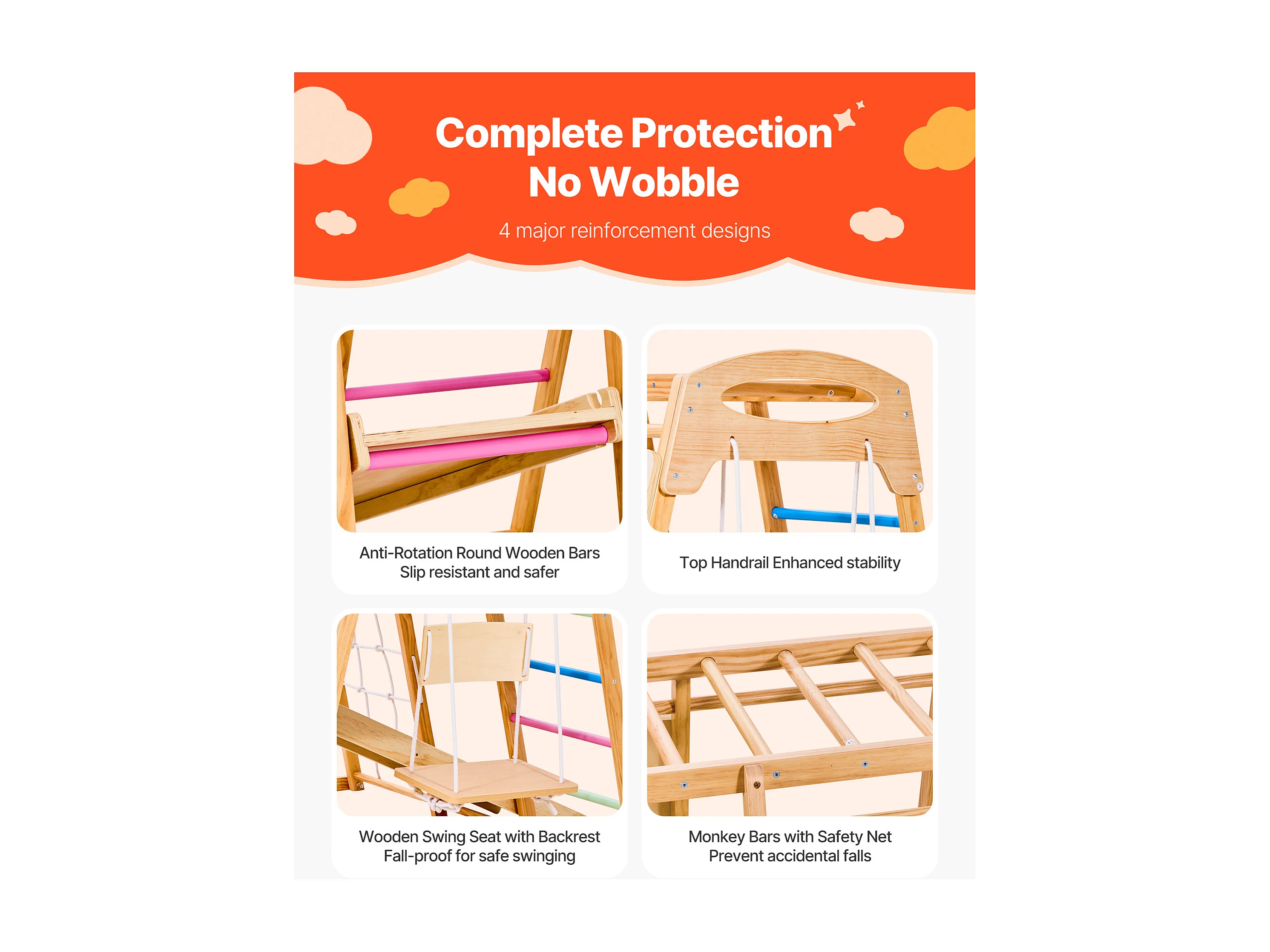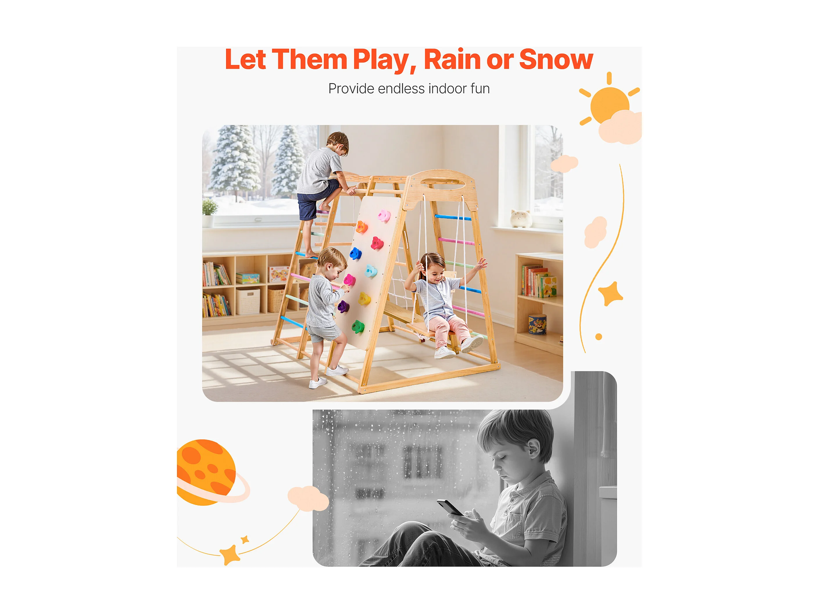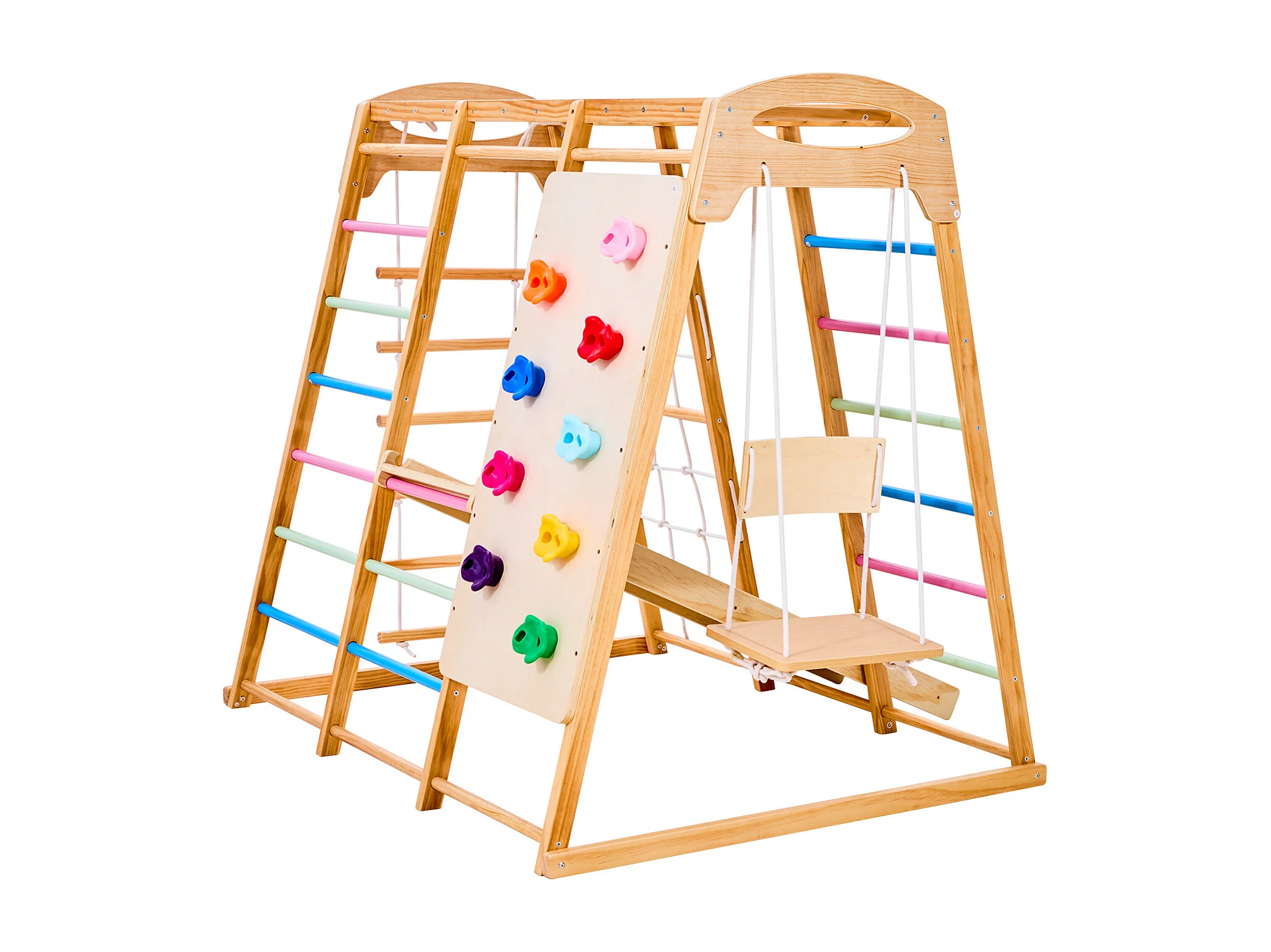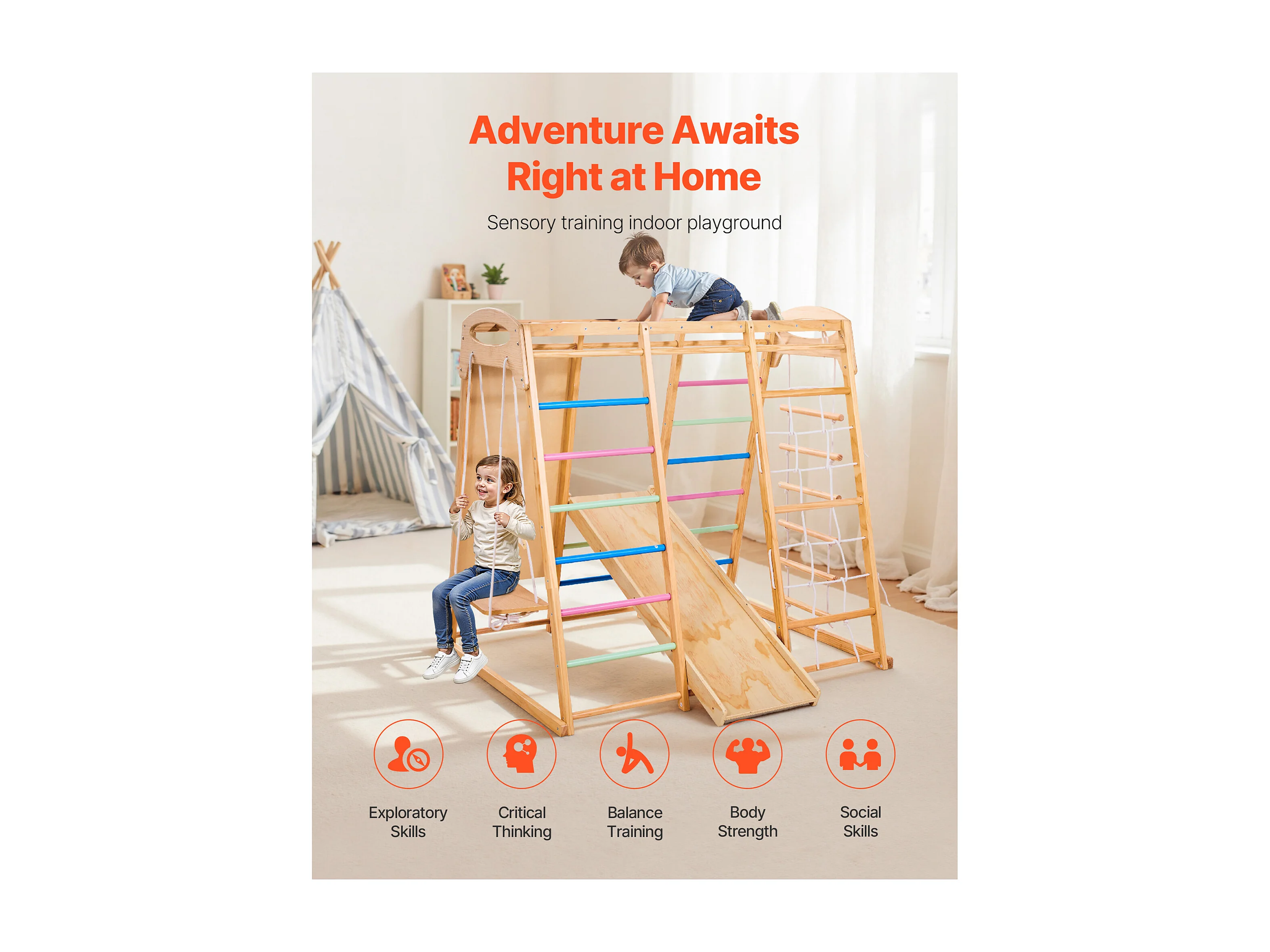 Indoor-Spielplatz SucceBuy aus Holz 7-in-1, mit Schaukel, Affenschaukel, Rutsche, Holzleiter, Strickleiter, Kletternetz und Kletterwand
