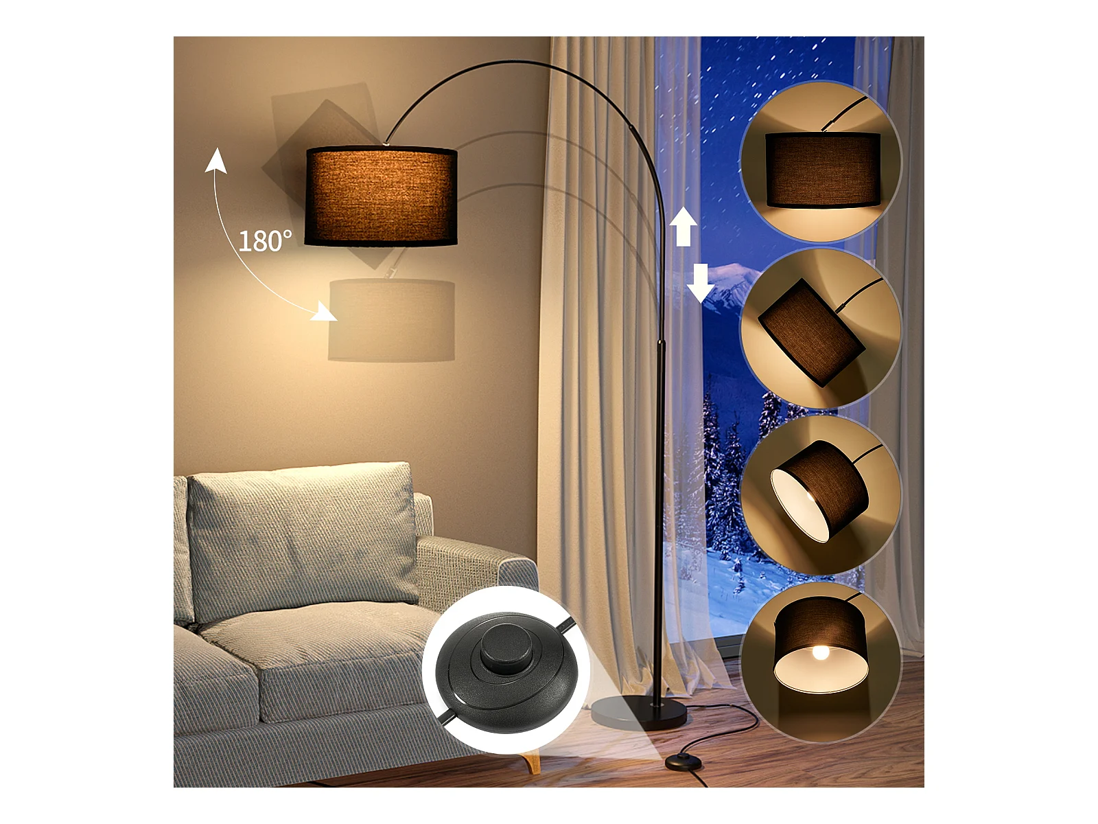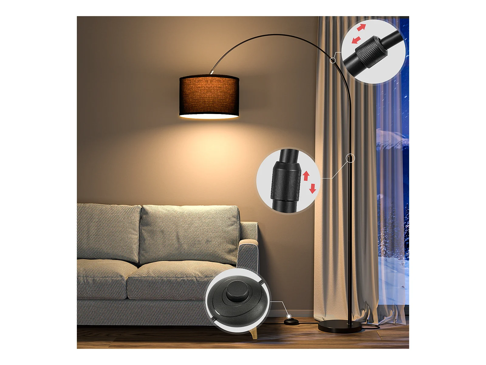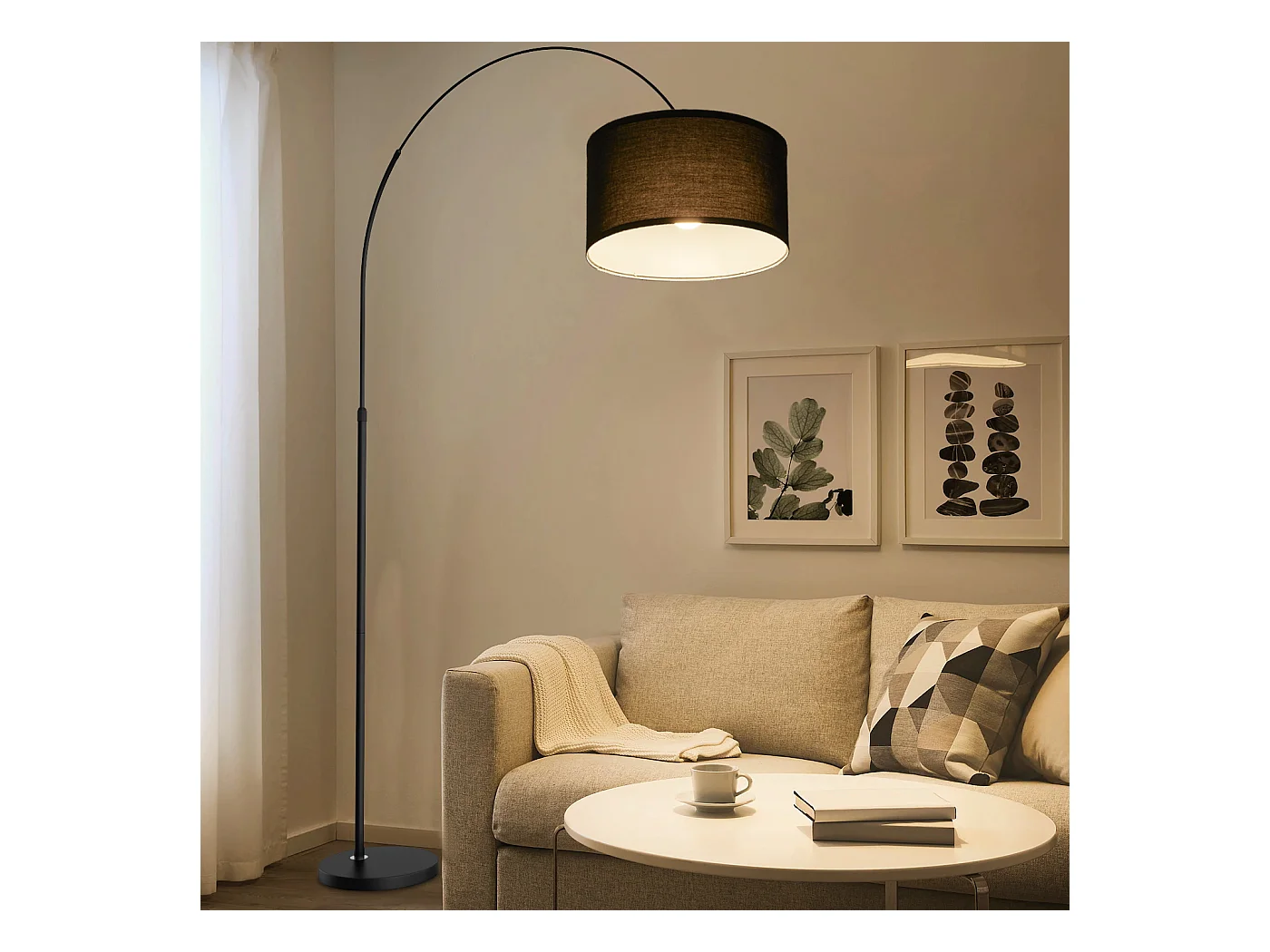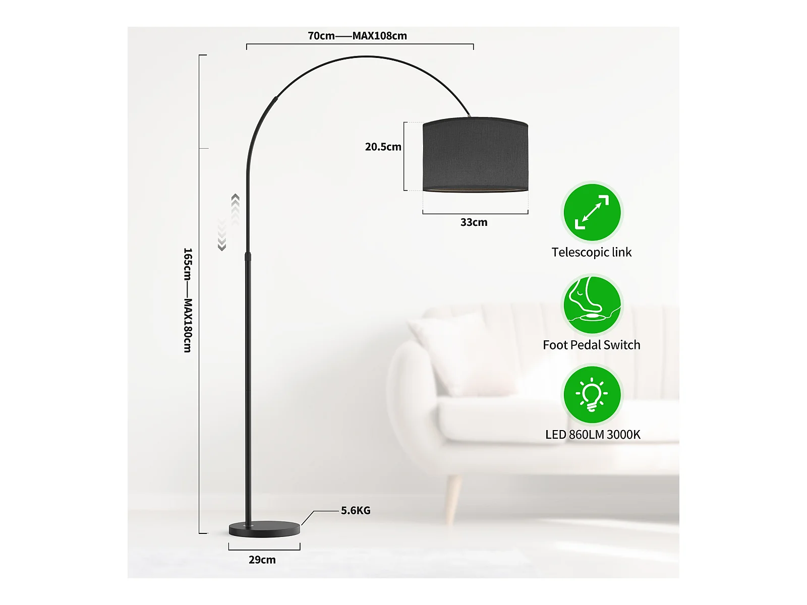 JASMIN Bogen-Stehleuchte | Klassische Stehlampe | E27 9 W 3000 K LED-Birne enthalten | 33 cm schwarzer Lampenschirm | Fußschalter für Schlafzimmer/Büro/Hotel