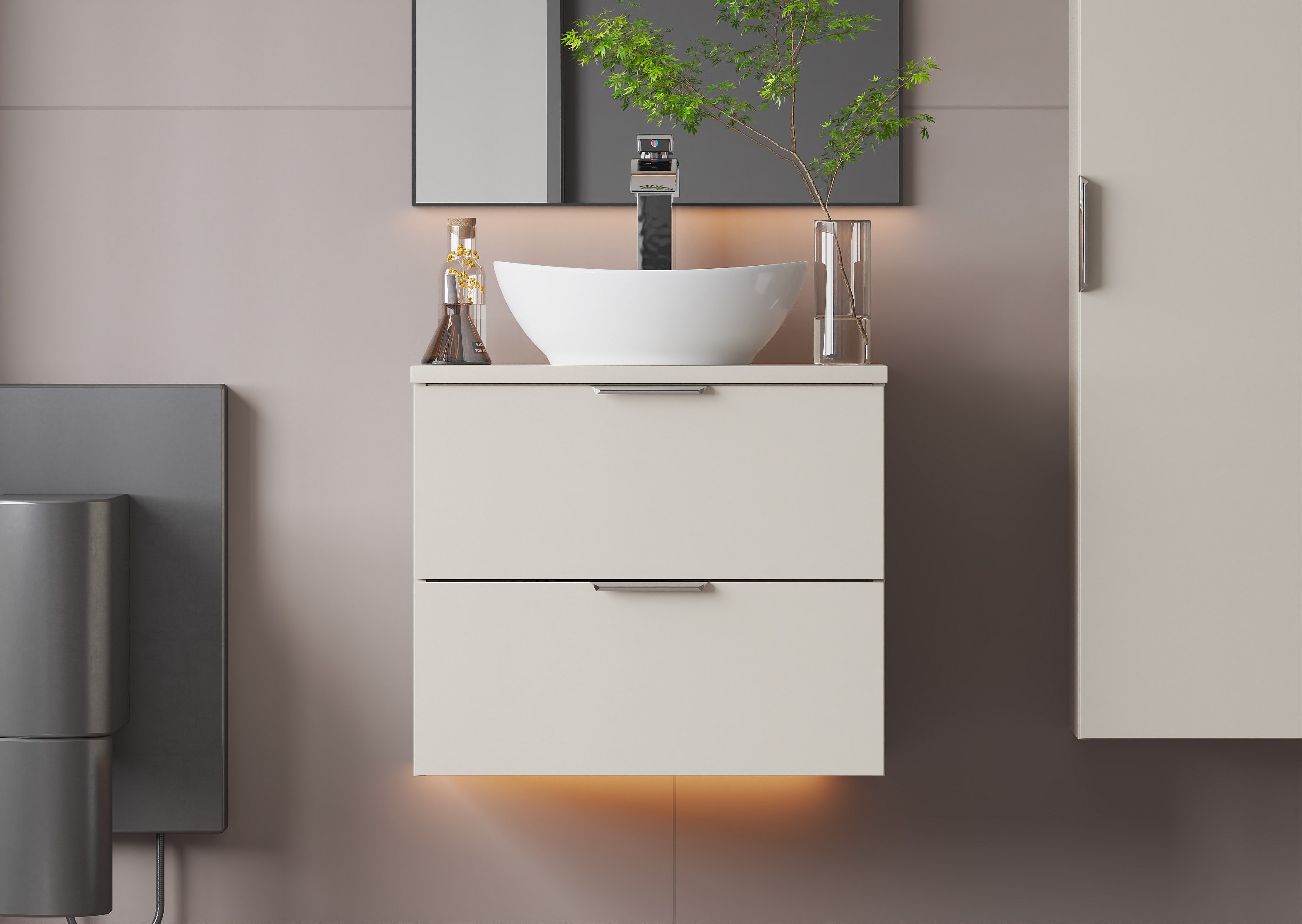 Auffällig sind die minimalistischen, glatten Fronten und die einzigartigen Akzente in Form von Griffen – jeder Schrank wird mit drei verschiedenen Farbvarianten geliefert: schwarz, gold und chrom. Diese Lösung bietet volle Freiheit bei der Anpassung der Möbel an die gewählte Armatur und den Stil des Interieurs. Alle Elemente der Kollektion sind hängend und mit einem Soft-Close-System ausgestattet, was den Komfort im täglichen Gebrauch erhöht.