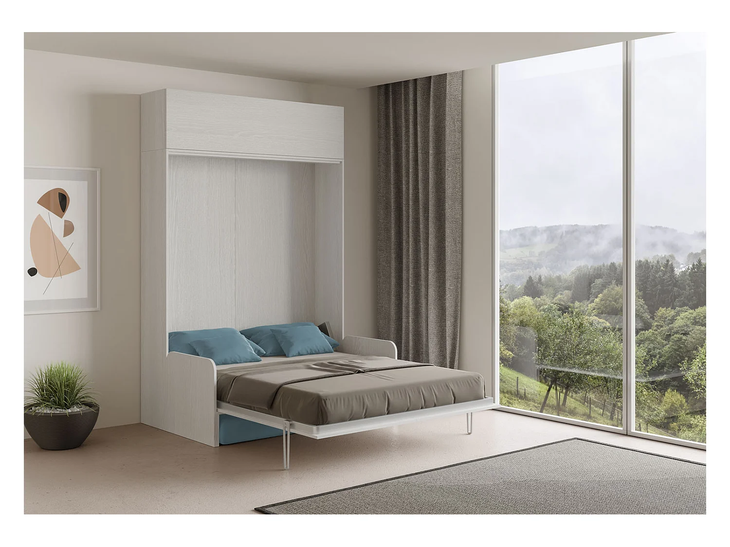 Kentaro 160 cm Klappbett für Doppelbett mit Sofa und Schrankwand aus weißer Esche, hellblau